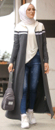 Robe longue à capuche fermeture zip (Boutique Modest Fashion pour jeune femme voilée) - Couleur gris anthracite écru - REF. 32820 (29.90 €) - En Promotion à 21.90 €