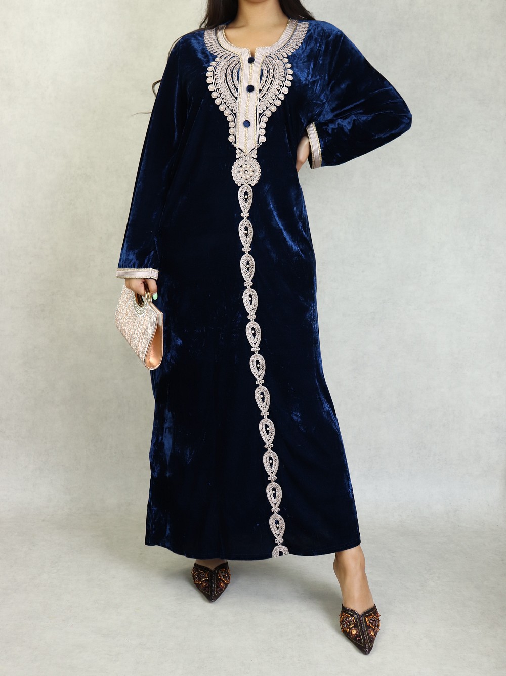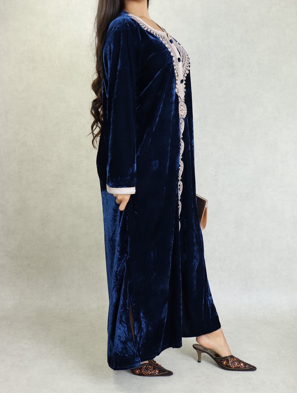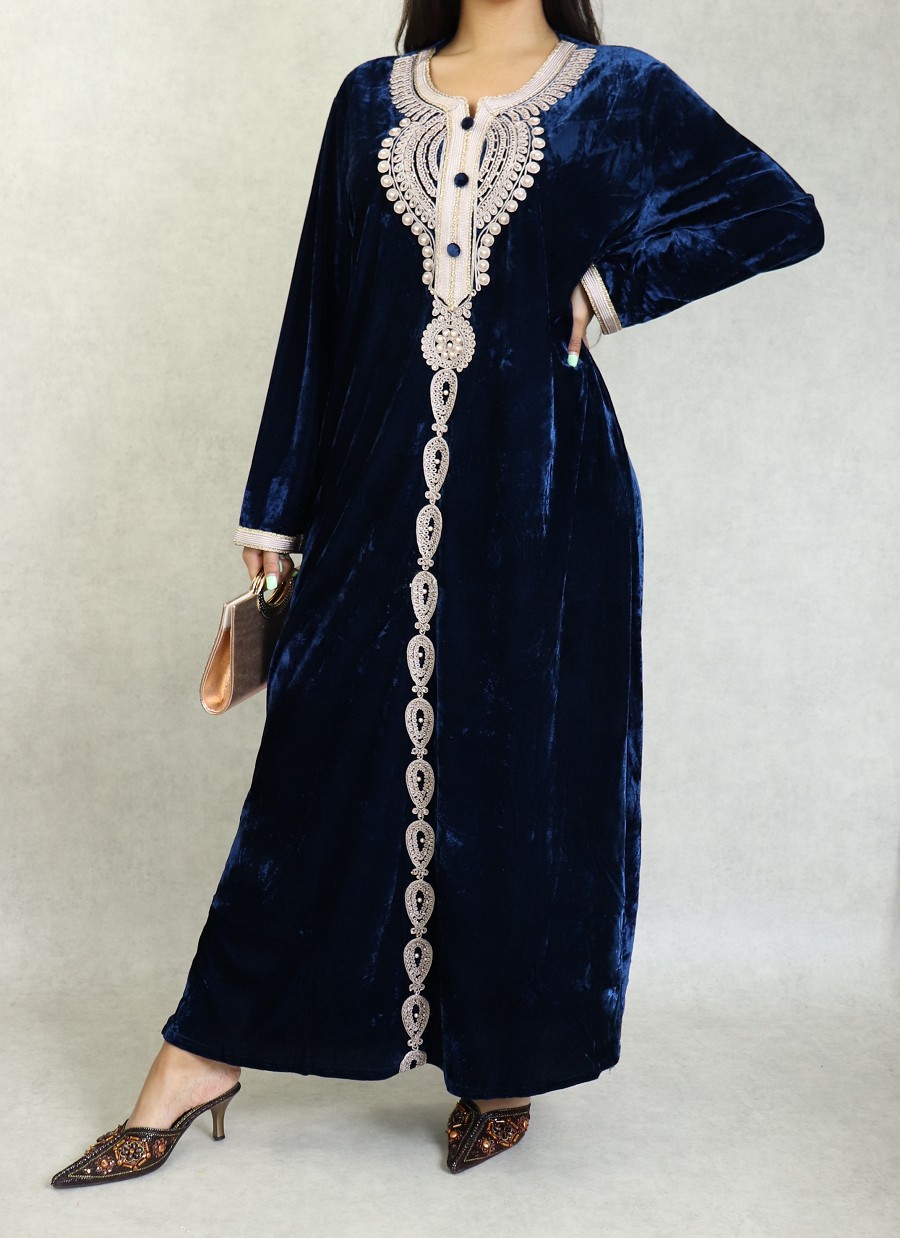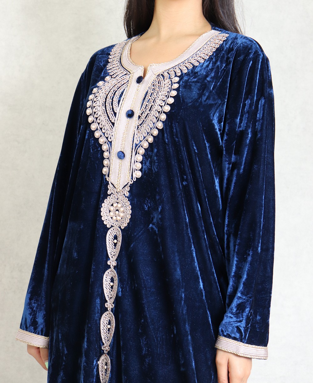 Robe longue en velours avec broderies et perles sur toute la longueur (Robes Automne-Hiver pour femme) - Couleur Bleu marine