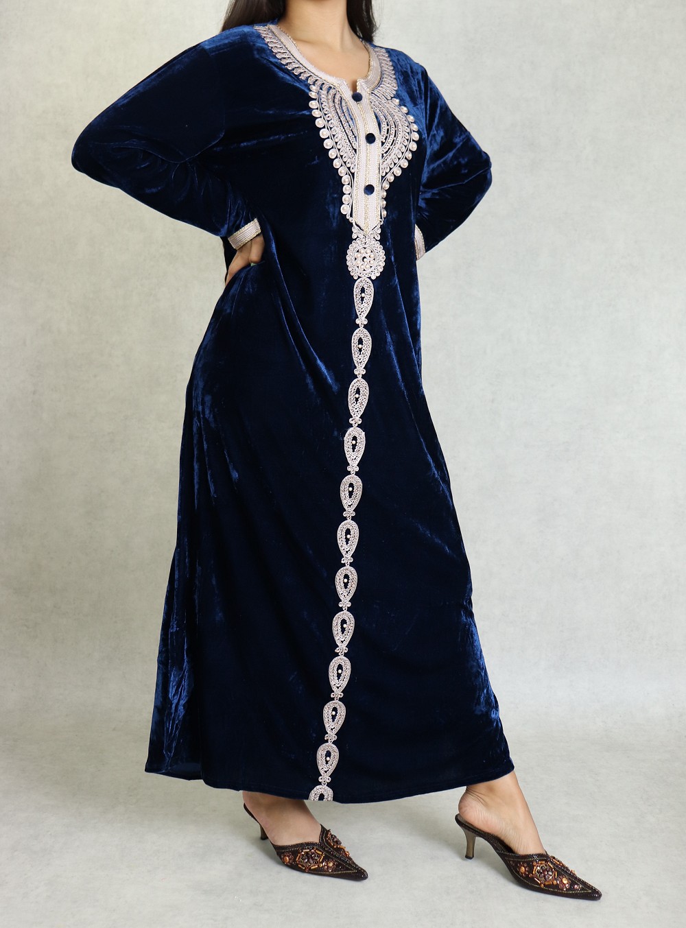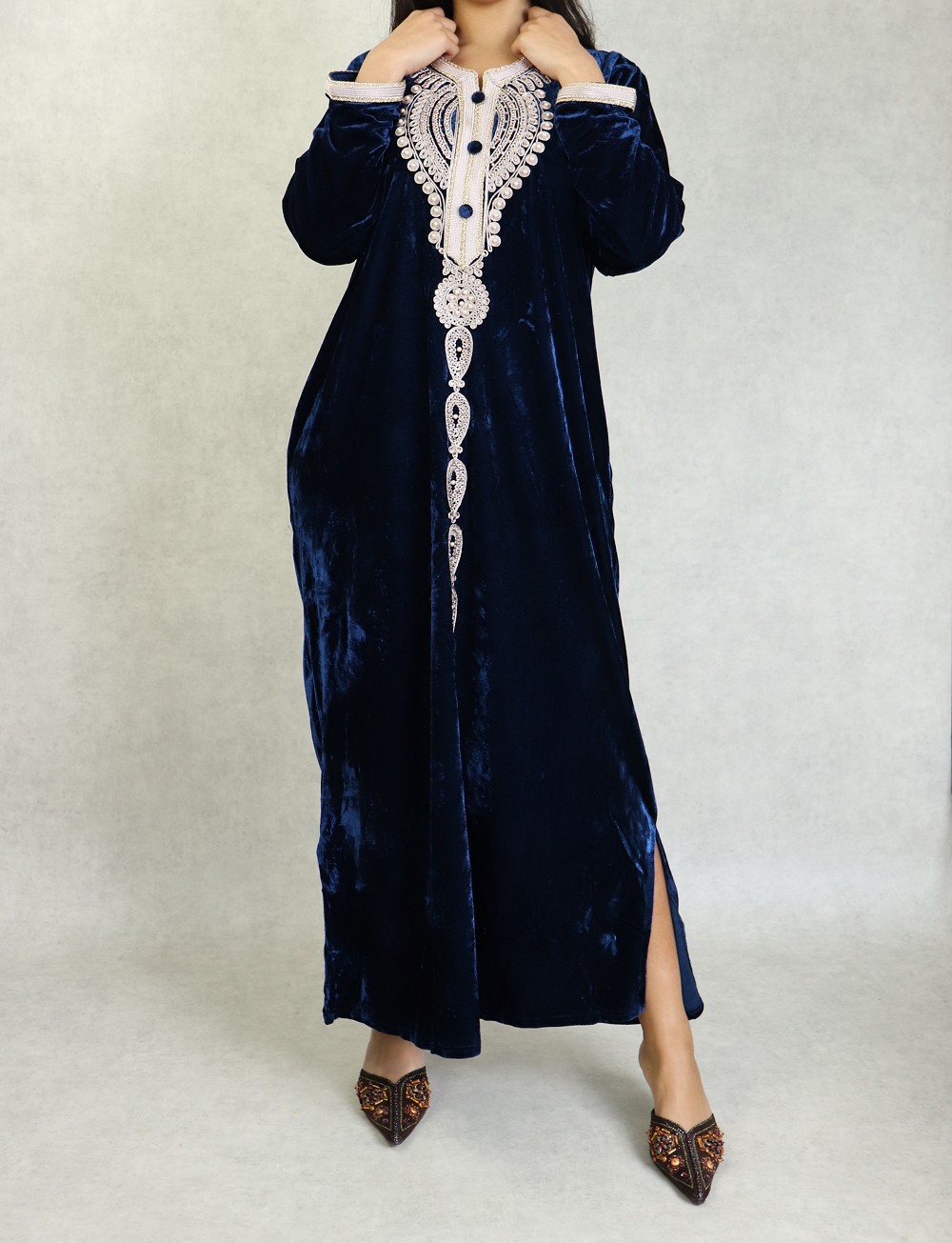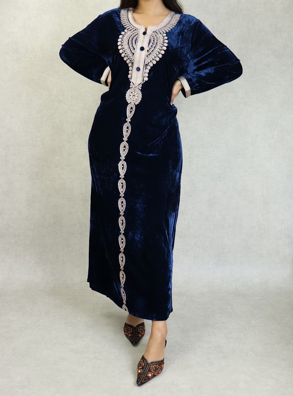 Robe longue, col en V, magnifiques broderies fines et perle sur le buste et toute la longueurs ainsi au finition des manches, tissu doux et fluide, effet velours, coupe droite.