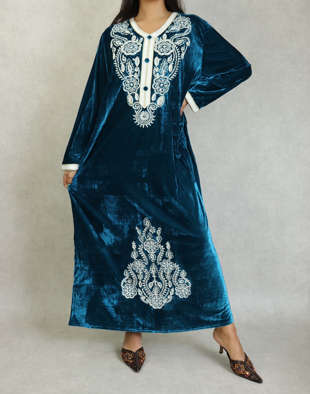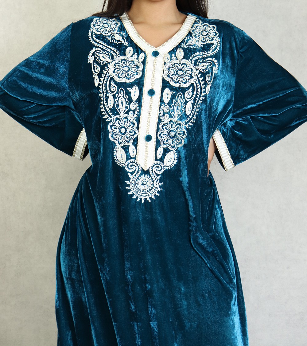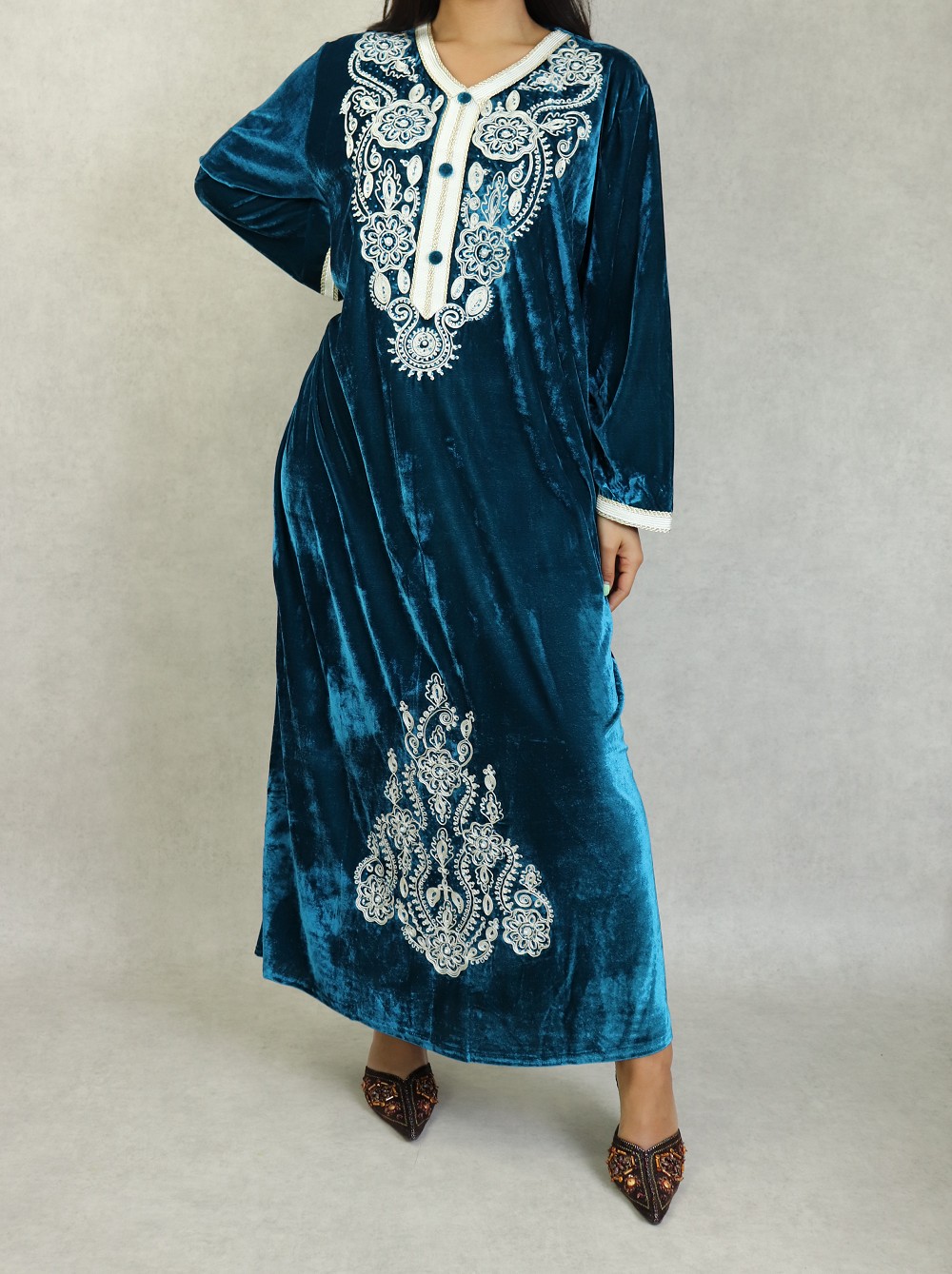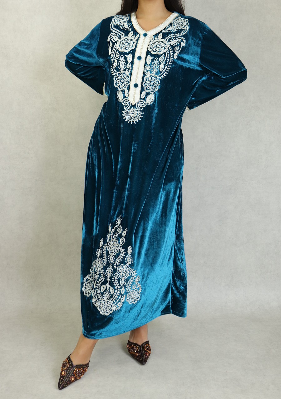 Robe longue effet velours avec broderies pour femme - Couleur Bleu canard Vetement & Accessoire