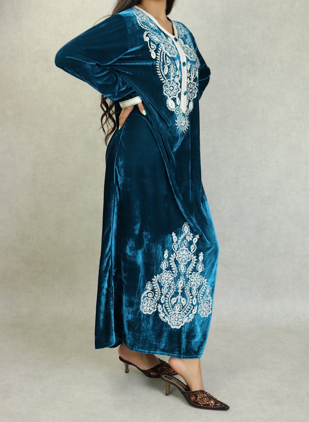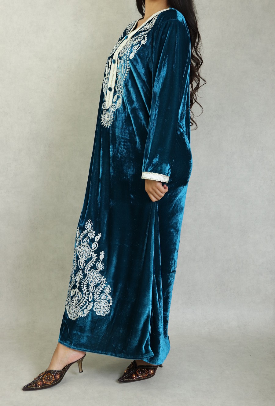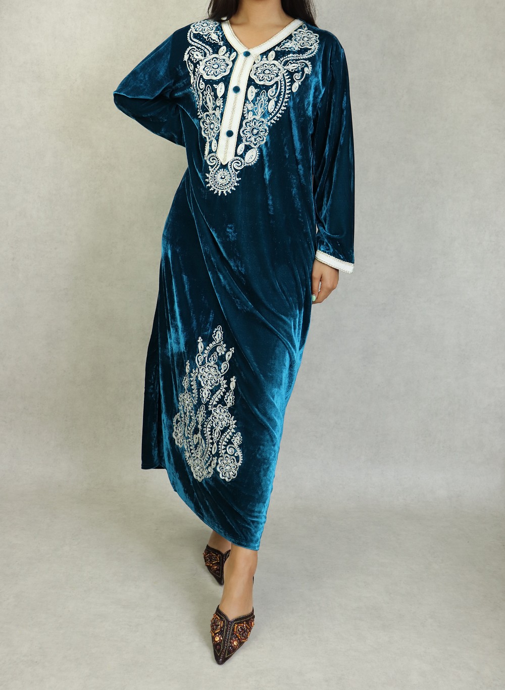 Robe longue effet velours avec broderies pour femme - Couleur Bleu canard Vetement & Accessoire
