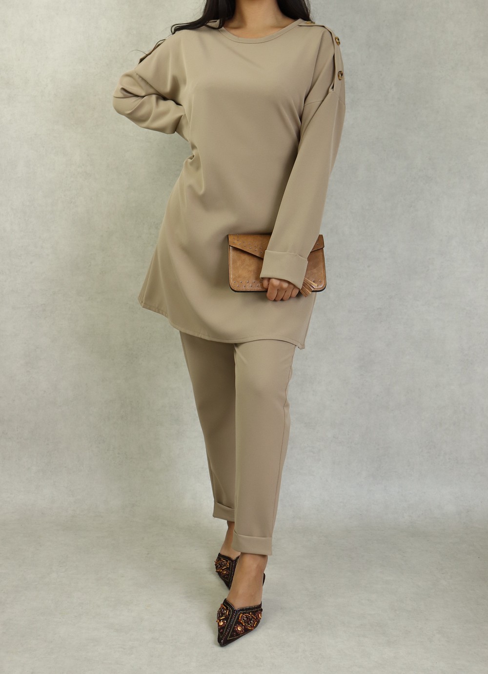 Ensemble casual pour femme : deux pieces tunique mi-longue et pantalon - Couleur Taupe