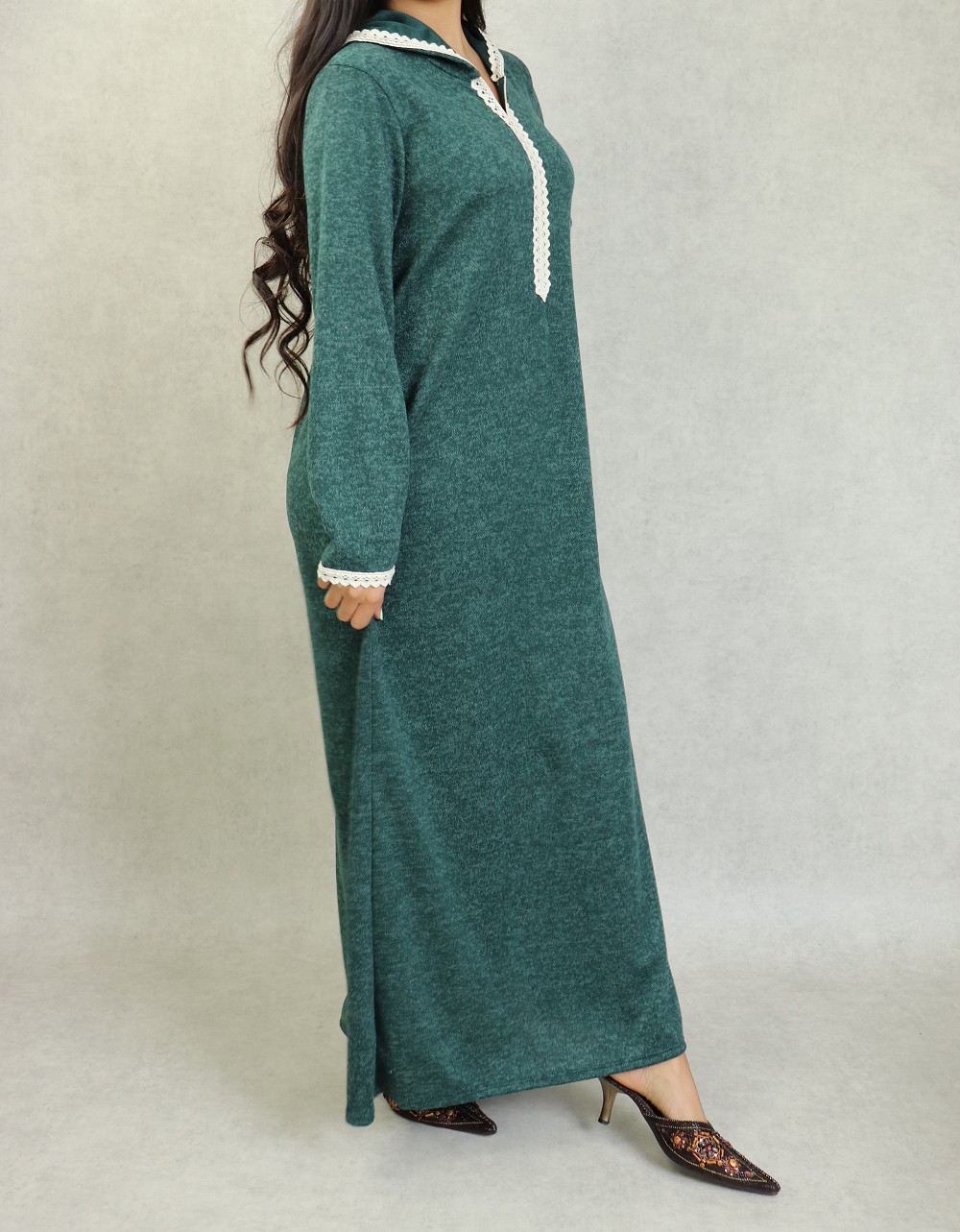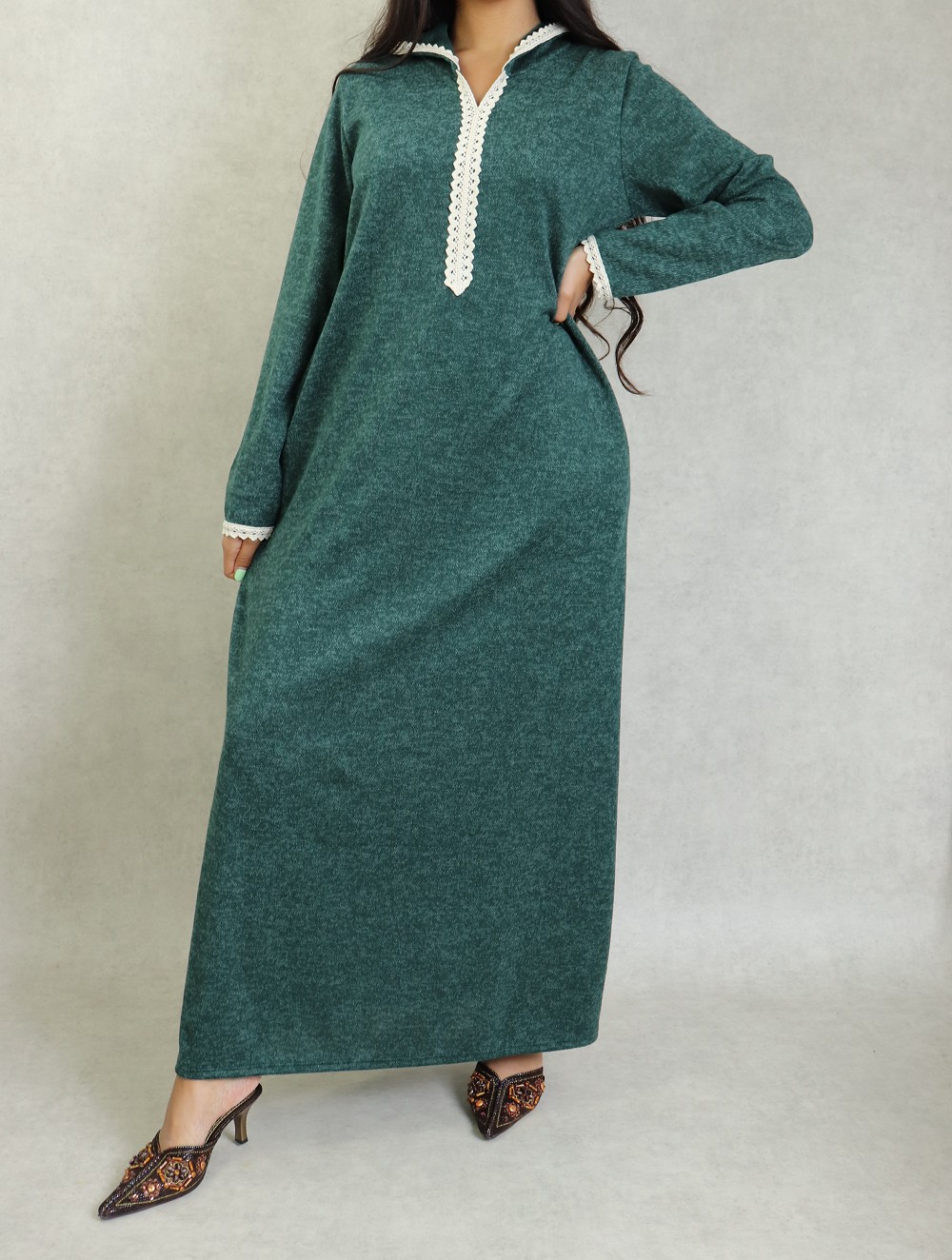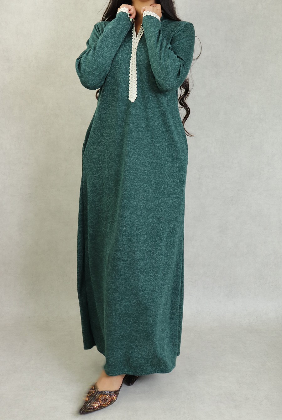 Djellaba style marocain de tissu épais effet chiné. avec dentelles beige sur le devant, sur les poignets ainsi que le contour de la capuche, 2 poches latérales pratiques pour ranger vos effets personnels.