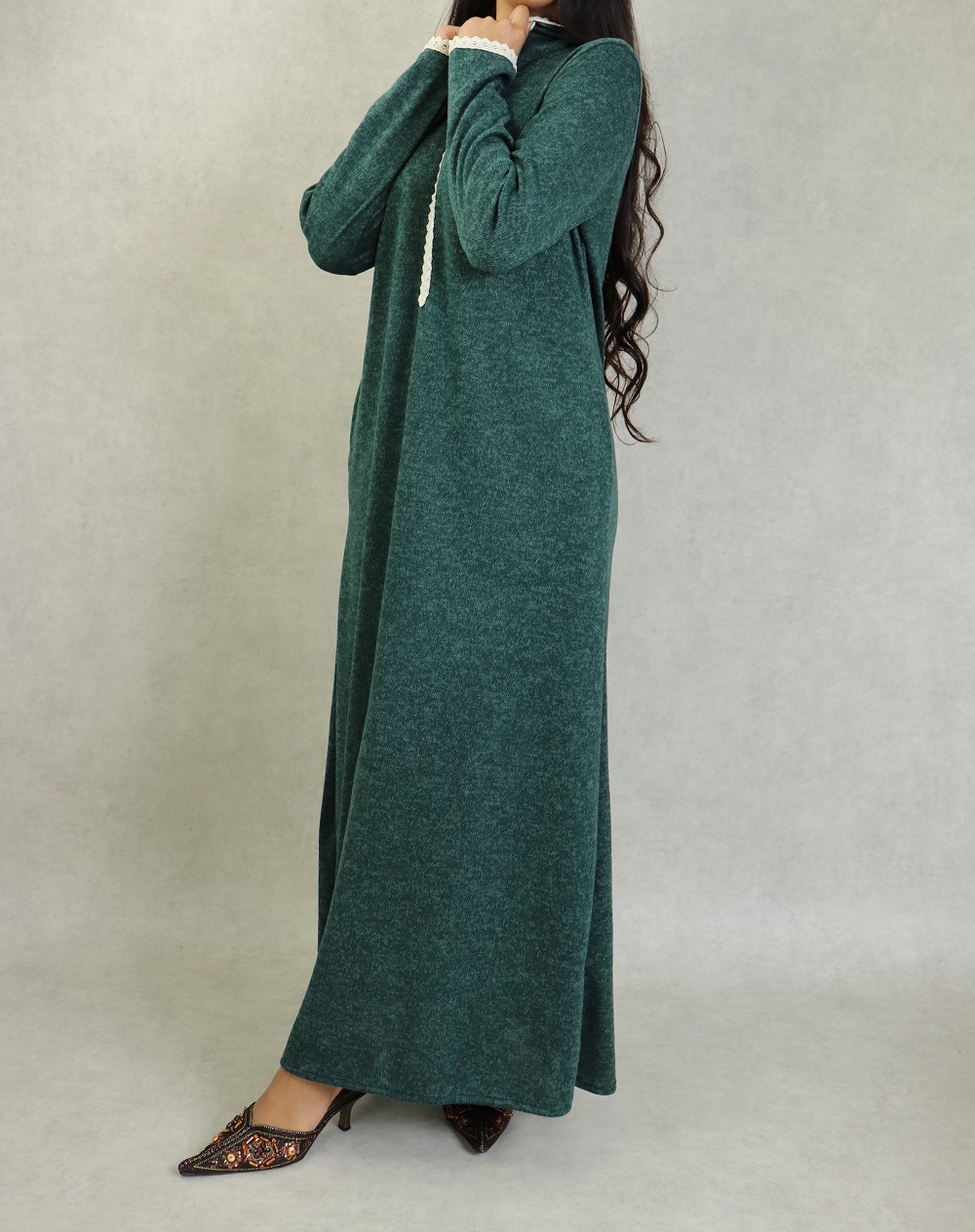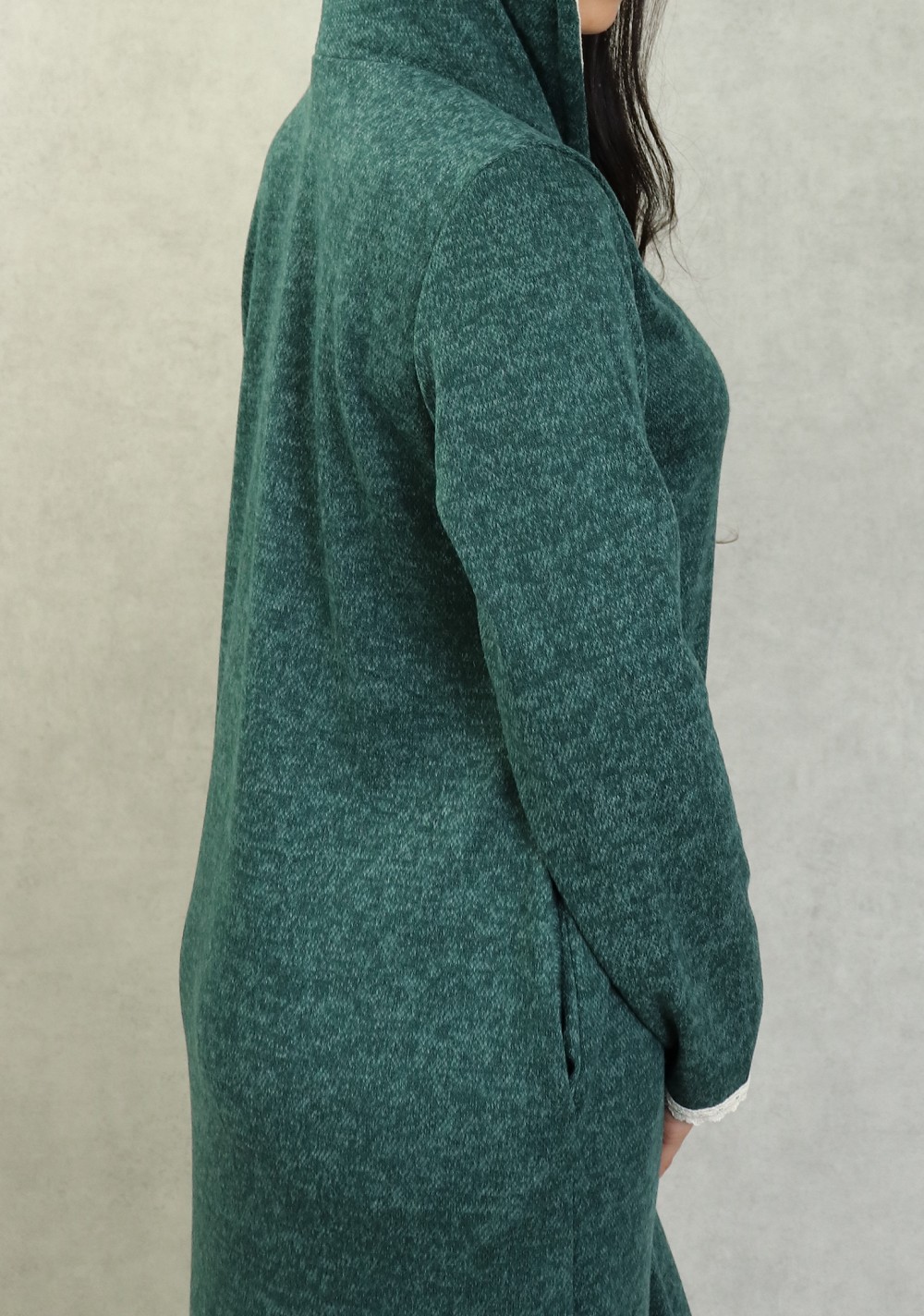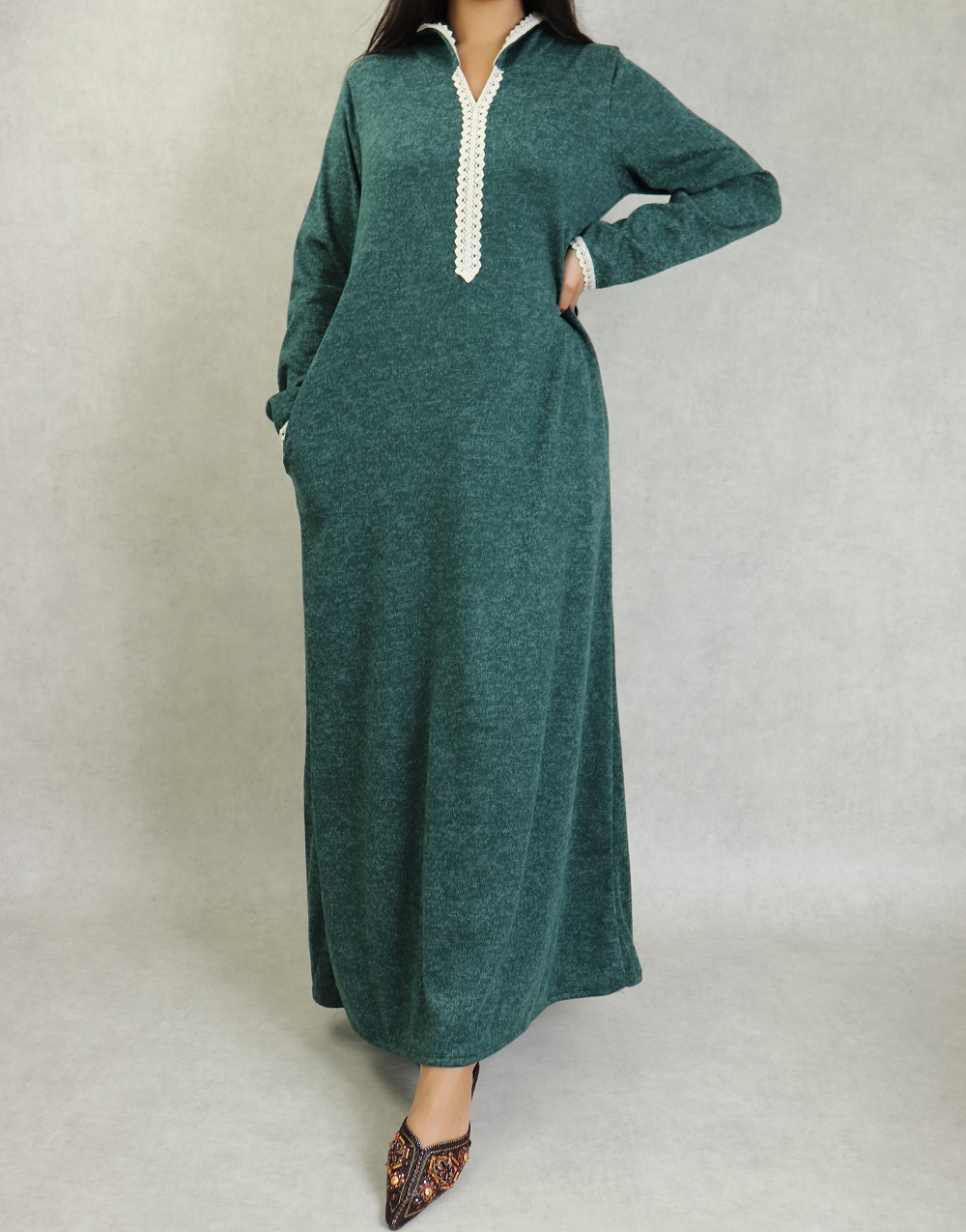 Djellaba style marocain de tissu épais effet chiné. avec dentelles beige sur le devant, sur les poignets ainsi que le contour de la capuche, 2 poches latérales pratiques pour ranger vos effets personnels.