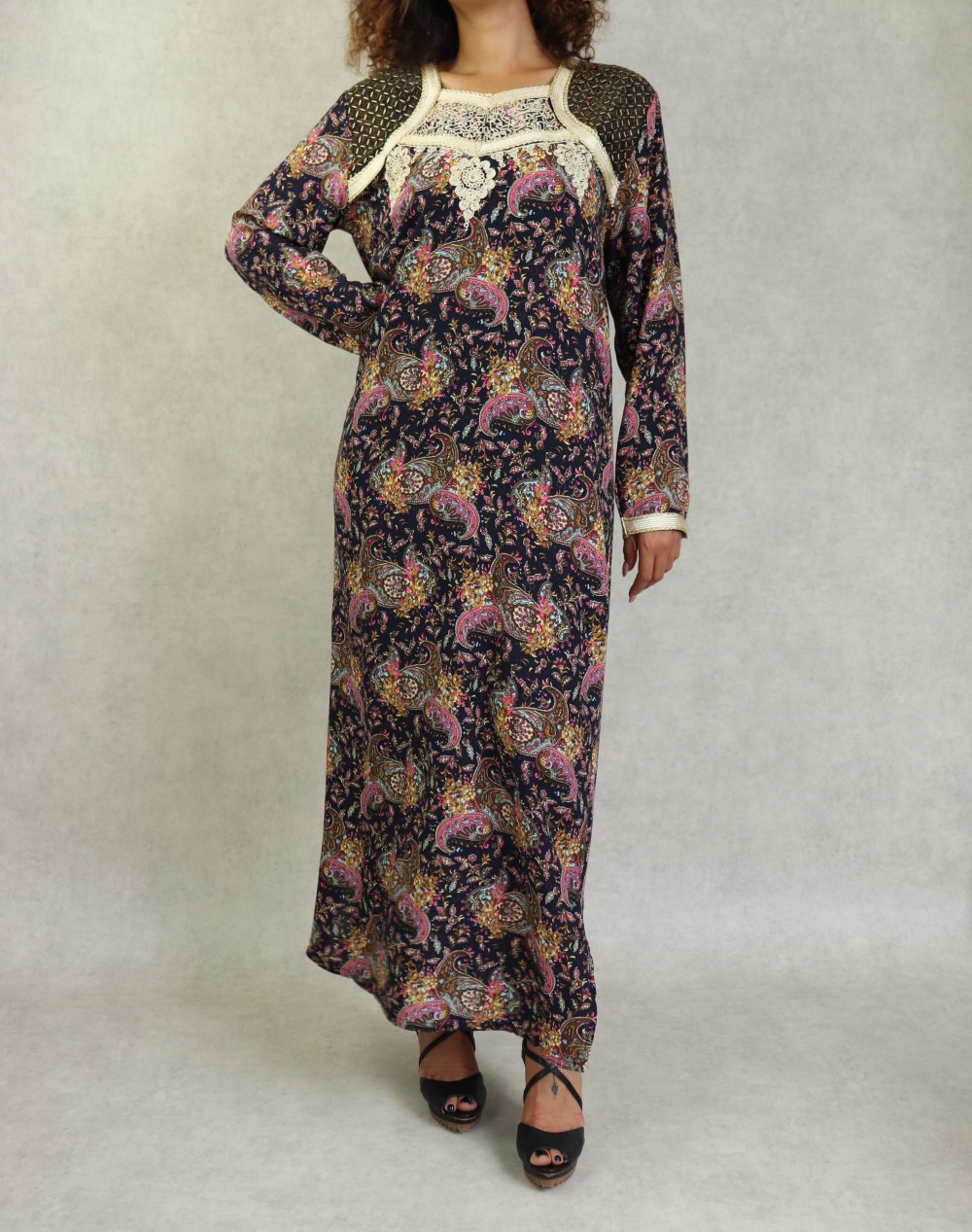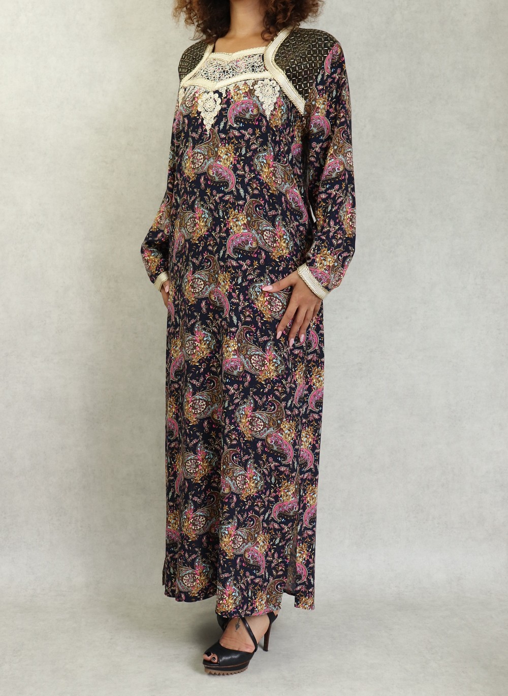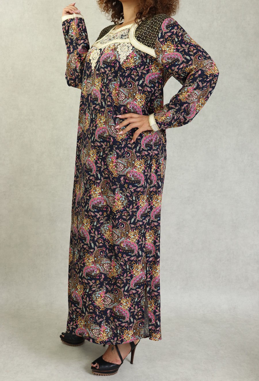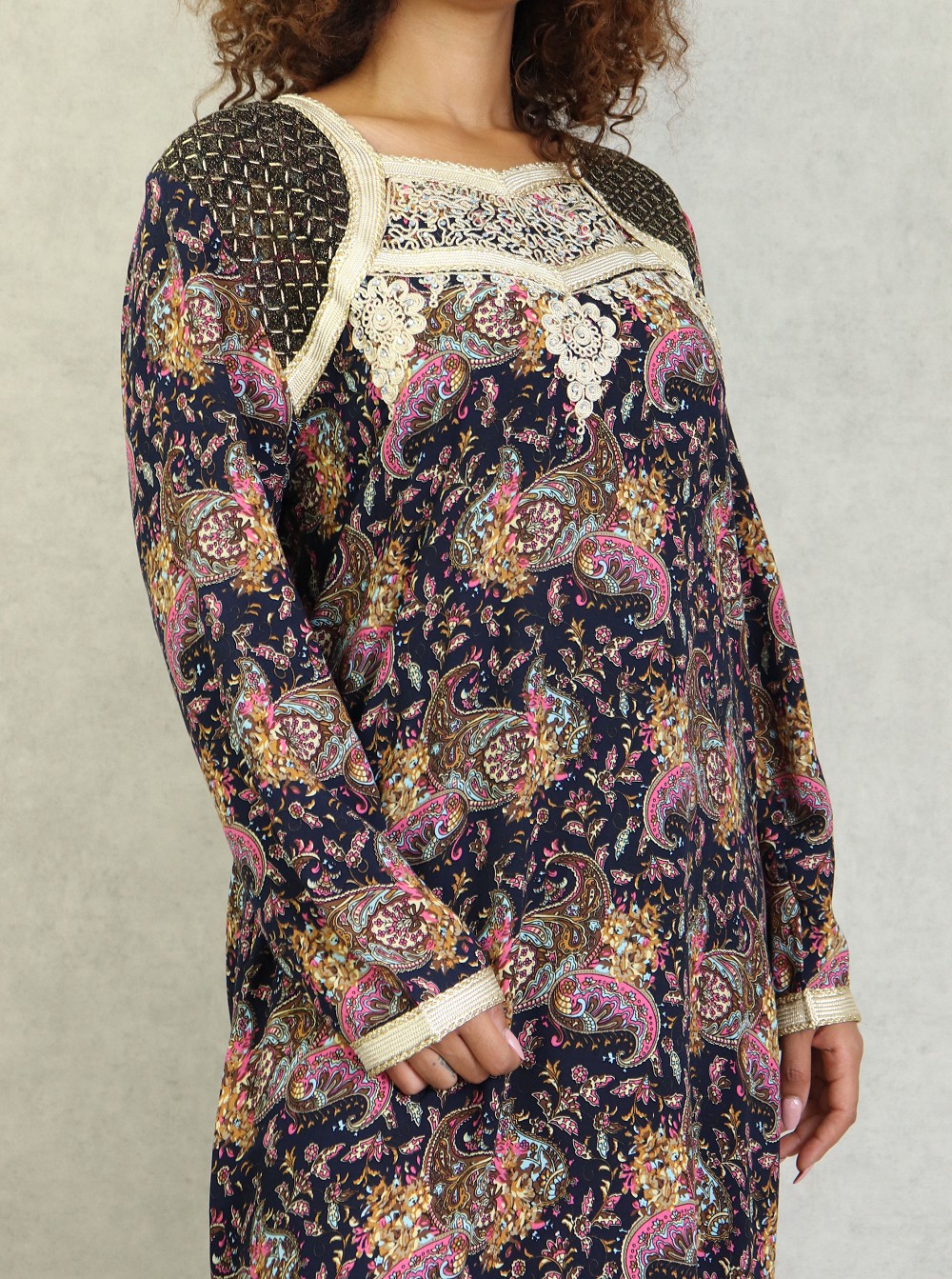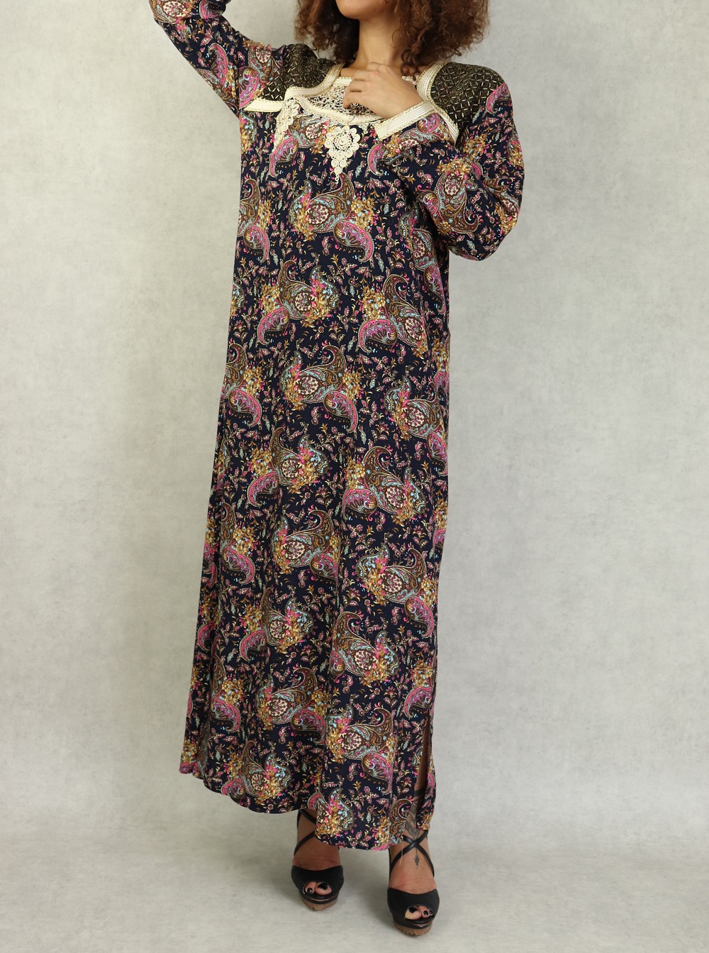 Robe longue style arabe brodee a motif cachemire pour femme - Couleur Bleu nuit