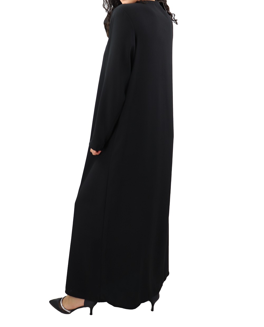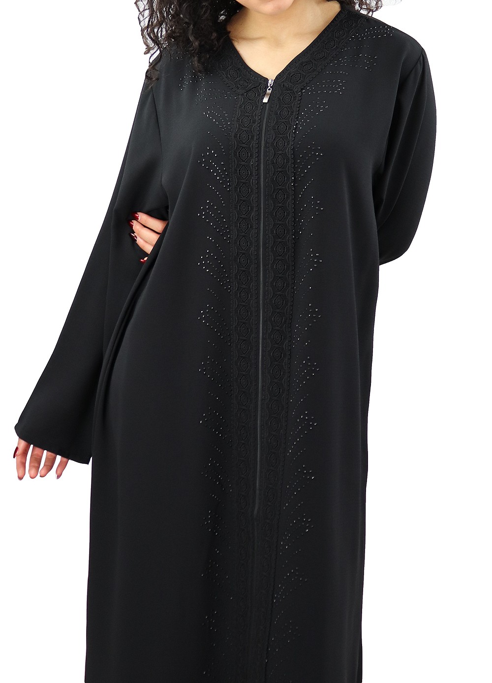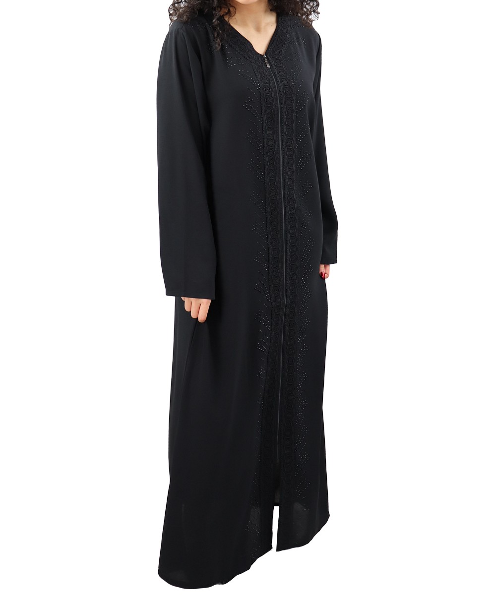 Robe abaya, fermeture éclair broderies et strass sur toute la longueur, coupe droite. Sur ce modèle sobre et élégant vous aimerez son zip qui vous permettra de le porter aussi bien ouvert que fermé.