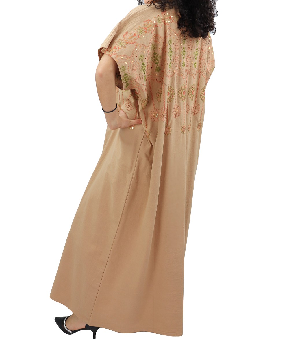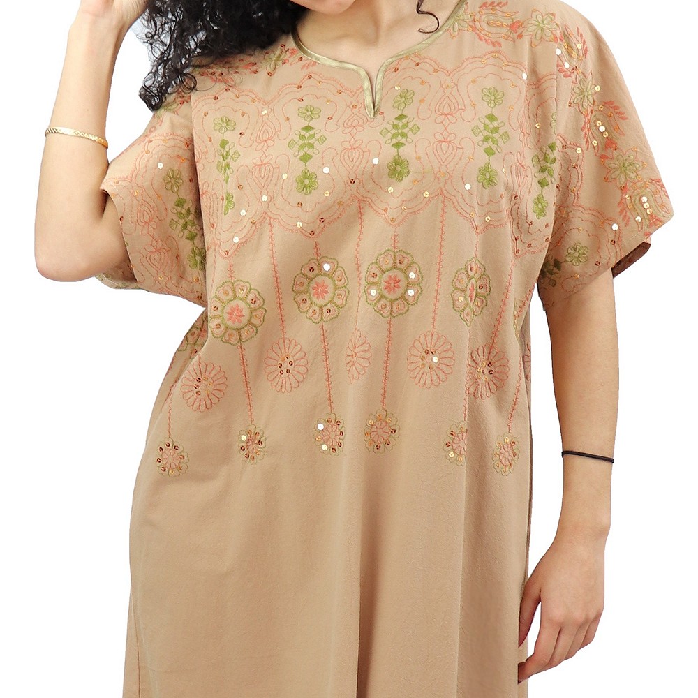 Robe d'intérieur agréable à porter avec broderies en plusieurs couleurs et paillettes sur le devant et le dos. Tissu doux très agréable à porter. Manches courtes.