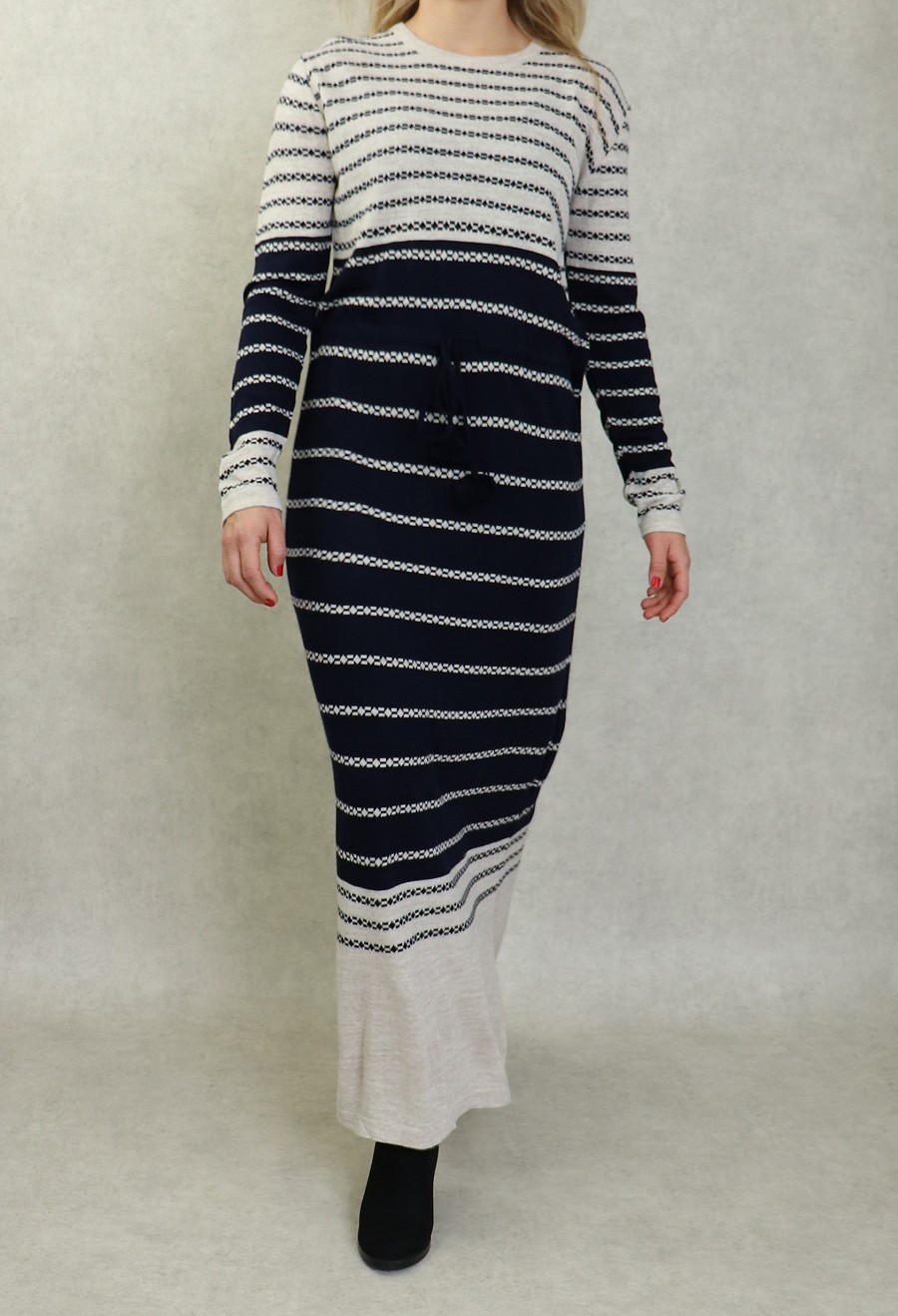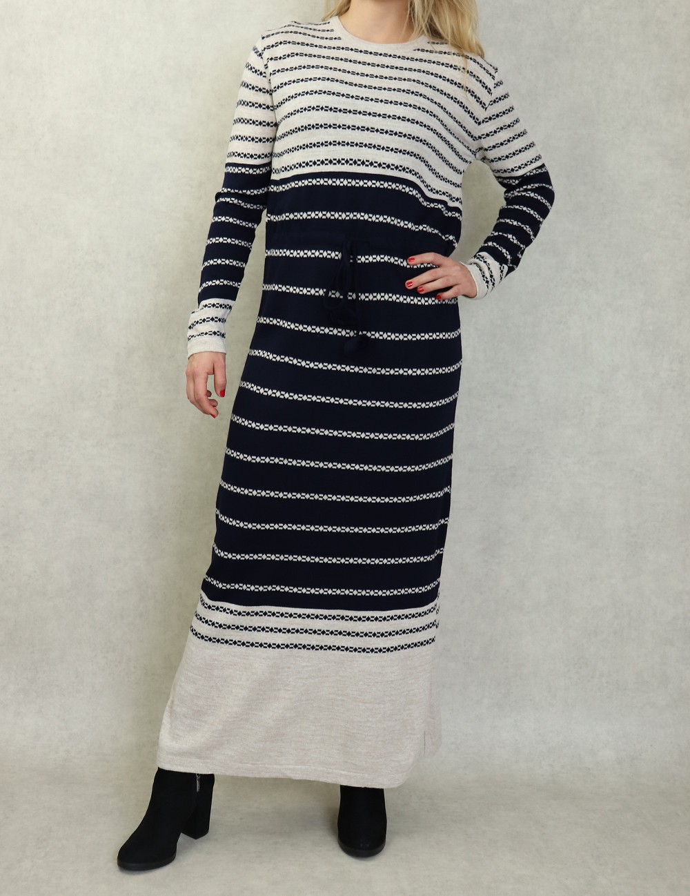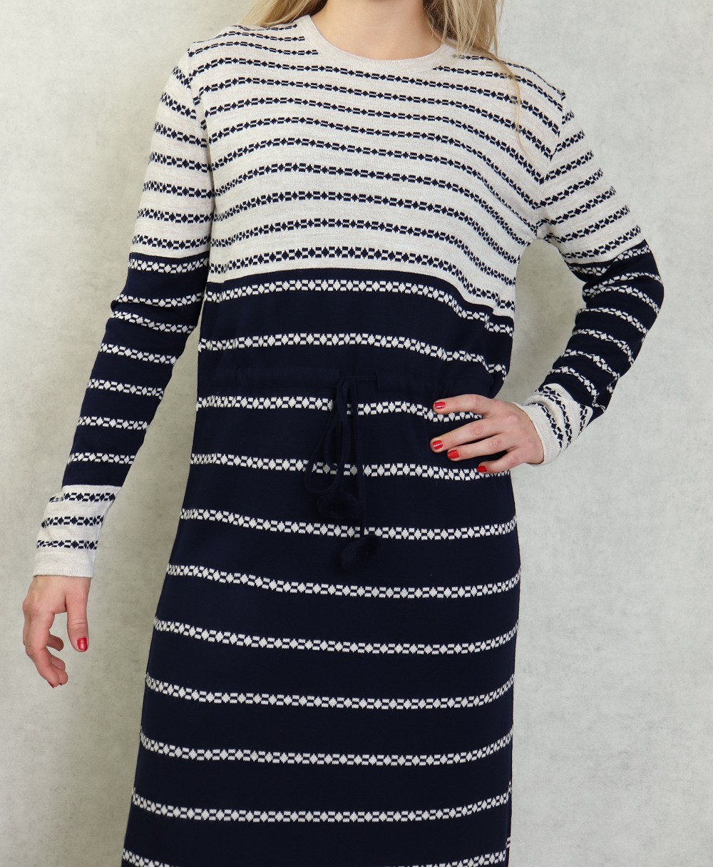 Robe en maille a rayures pour femme avec pompon (Style Automne-Hiver) - Couleur Creme et Bleu marine