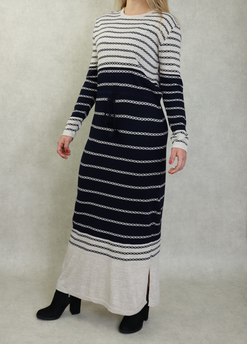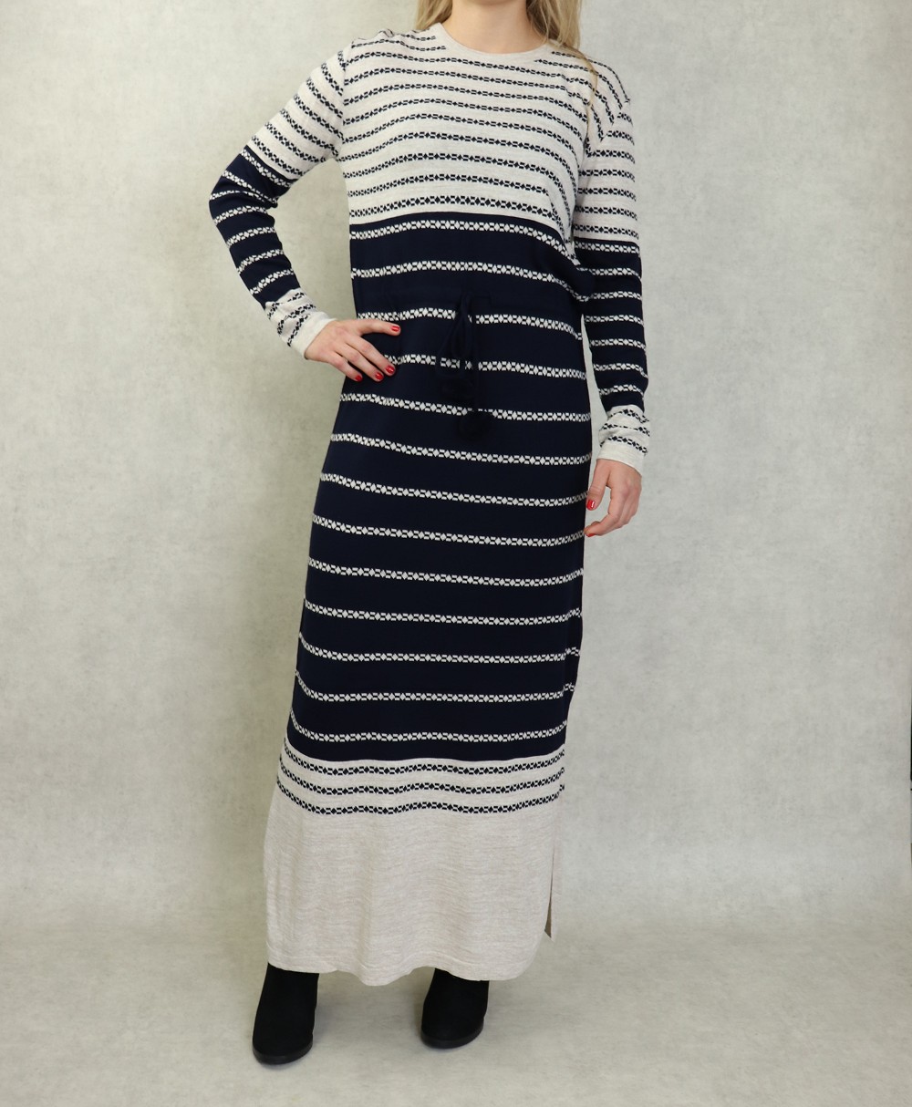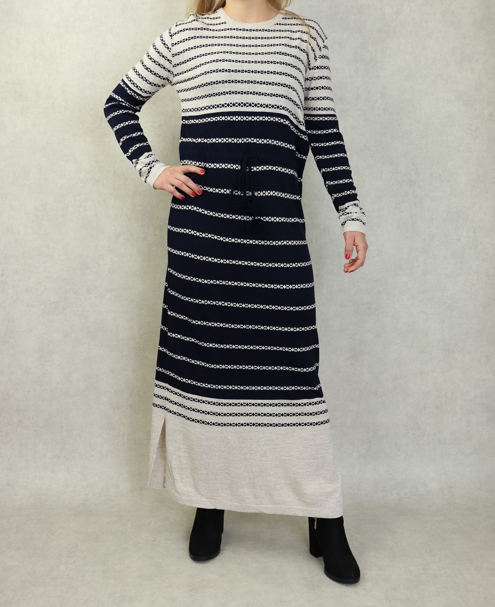 Robe en maille a rayures pour femme avec pompon (Style Automne-Hiver) - Couleur Creme et Bleu marine