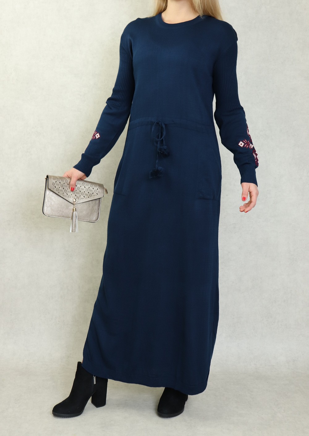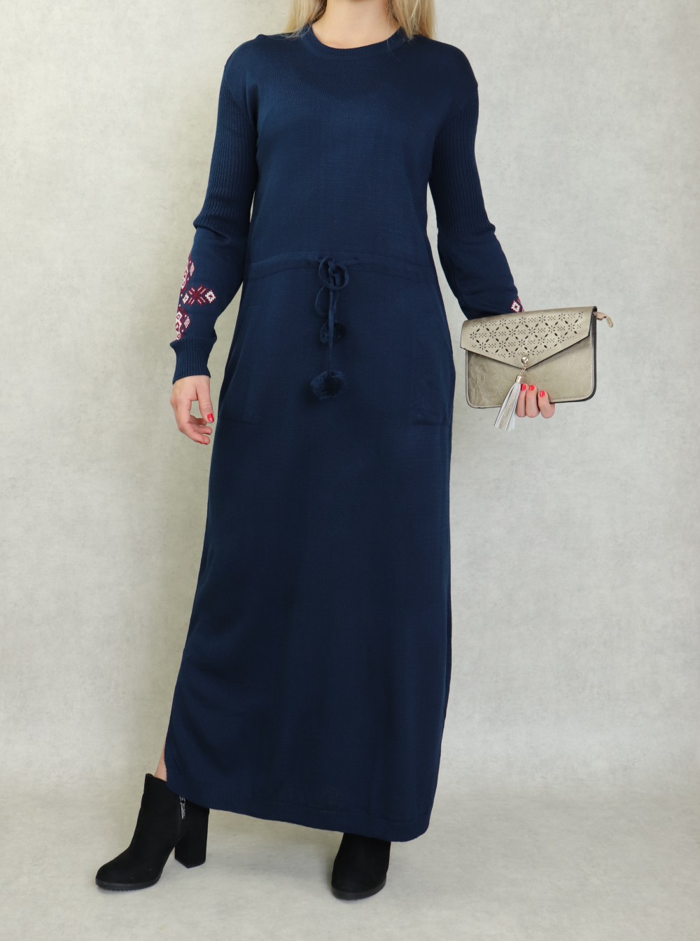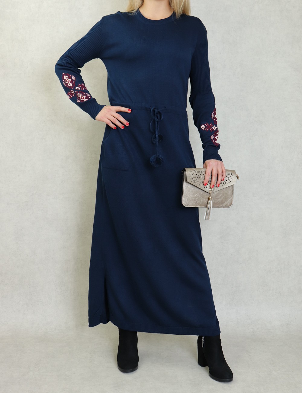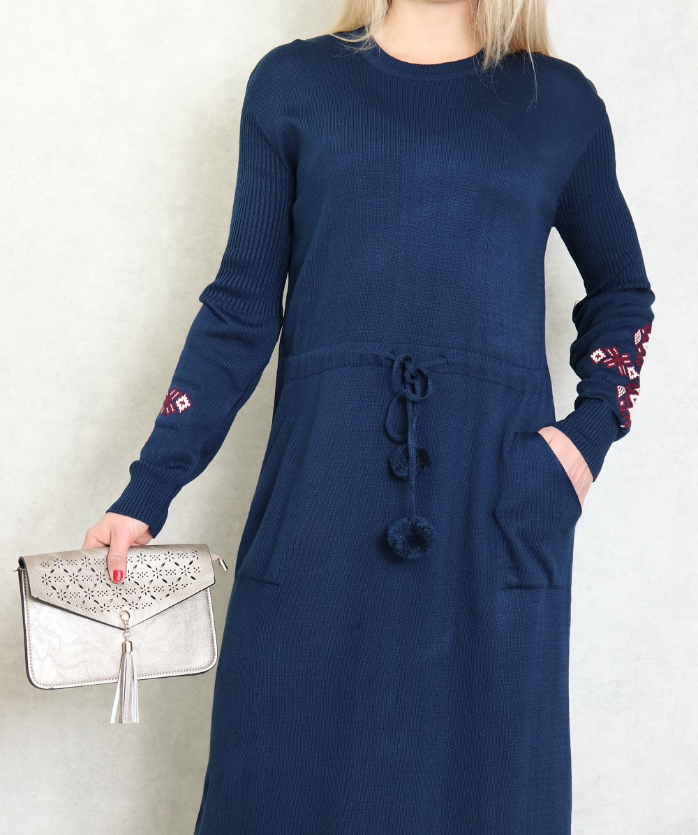 Robe originale, elle mettra en valeur votre côté chic et féminin. Encolure rond. Manches longues avec motif sur l'avant bras. Découpe taille avec un lien de serrage. Poches italiennes. Facile à vivre, douce sur la peau et bien souple, la robe pull en côtes.