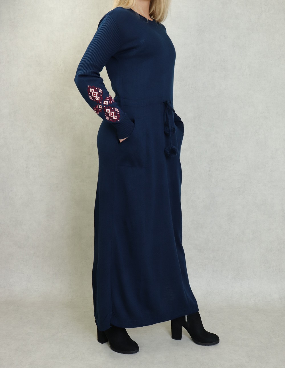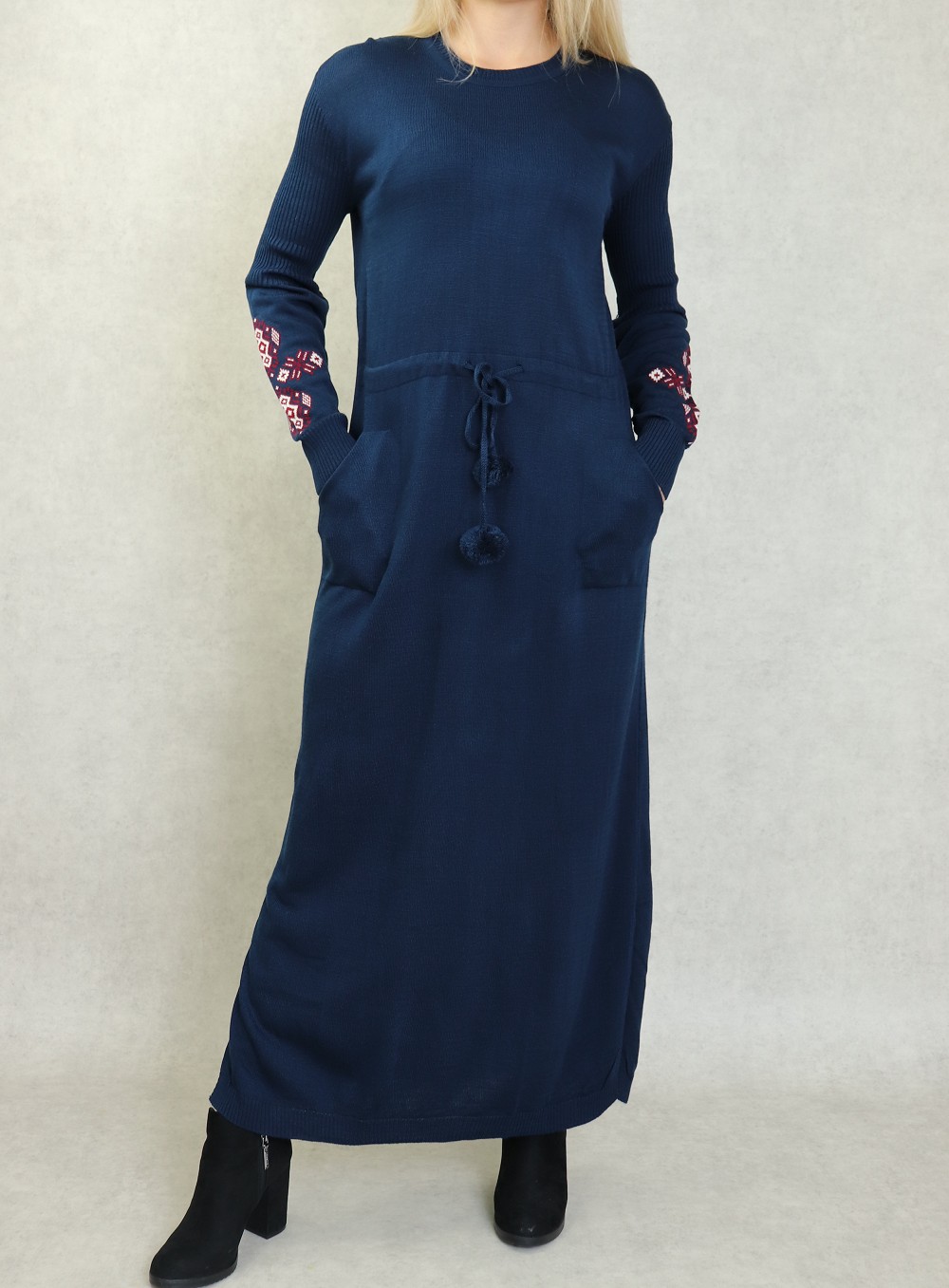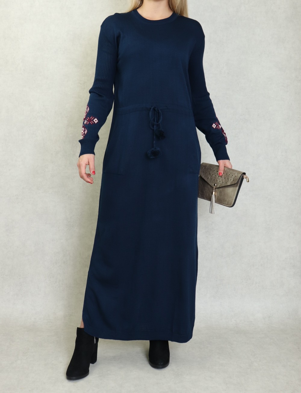 Robe originale, elle mettra en valeur votre côté chic et féminin. Encolure rond. Manches longues avec motif sur l'avant bras. Découpe taille avec un lien de serrage. Poches italiennes. Facile à vivre, douce sur la peau et bien souple, la robe pull en côtes.