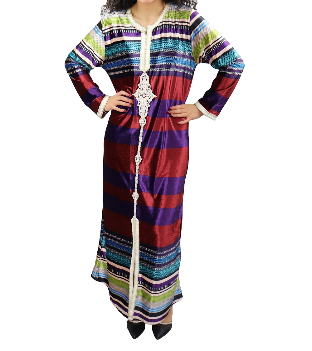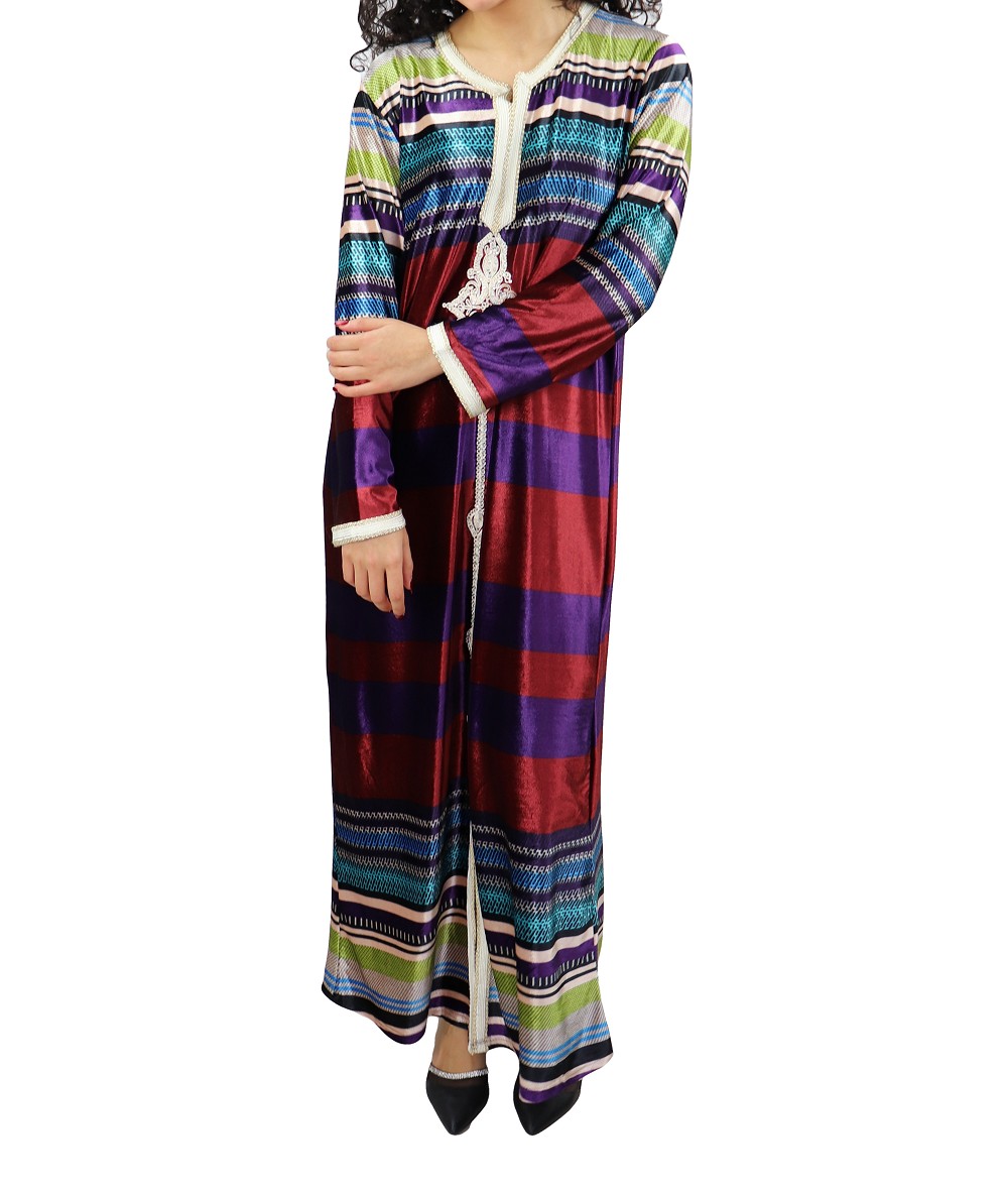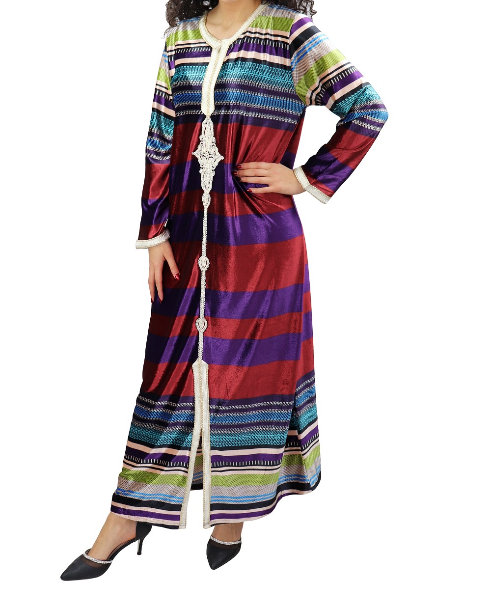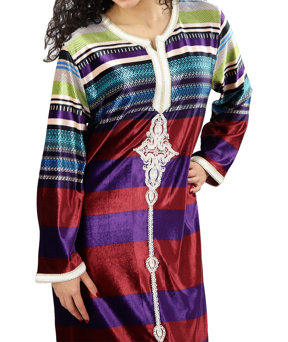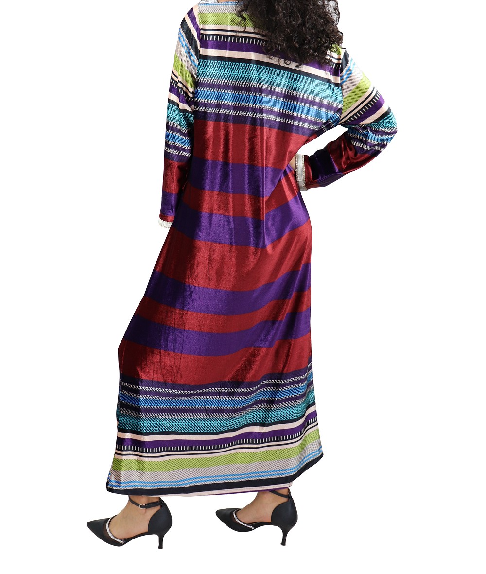 Robe longue d’intérieur, col rond semi-ouvert orné d'une broderie ainsi que les poignets, le devant et les cotés, tissu effet velours. Optez pour ce modèle joli et original avec ses rayures variées. Tissu ne nécessitant aucun repassage.