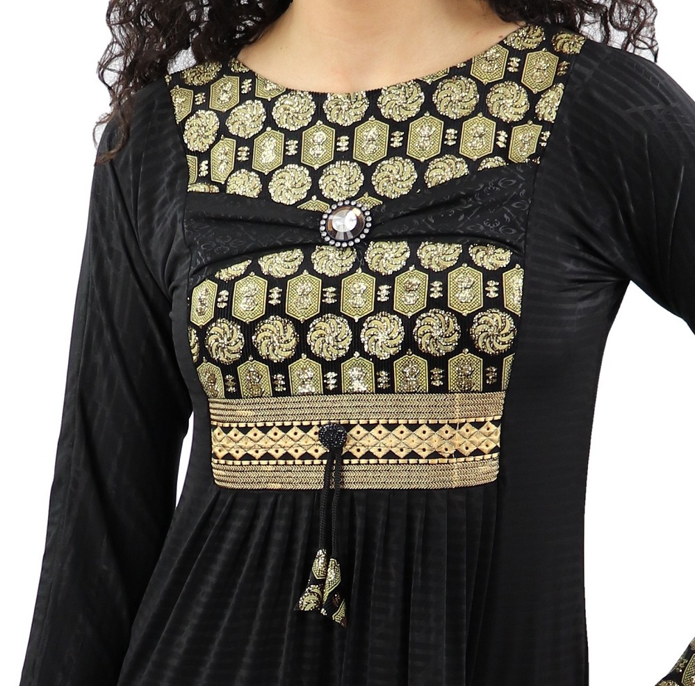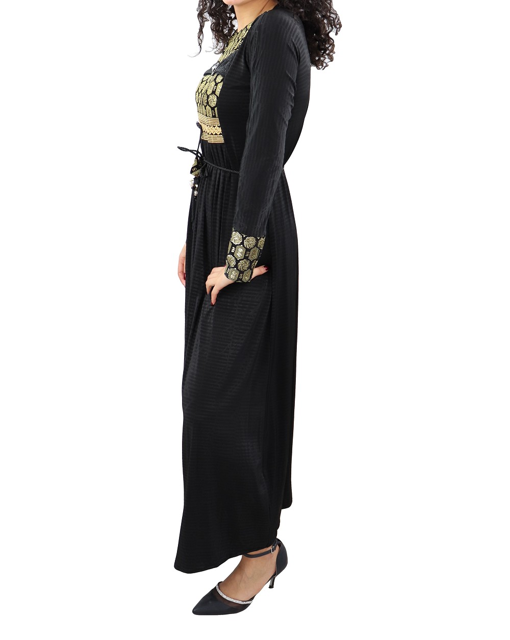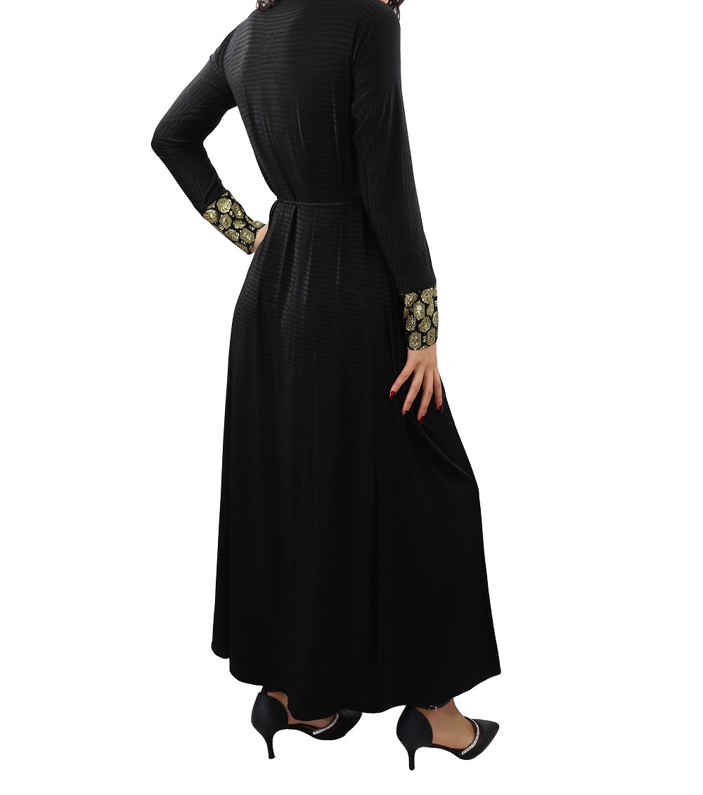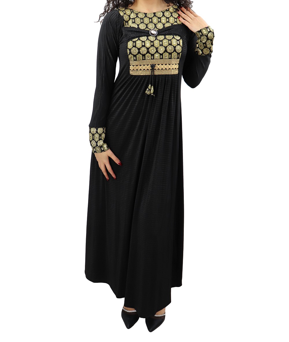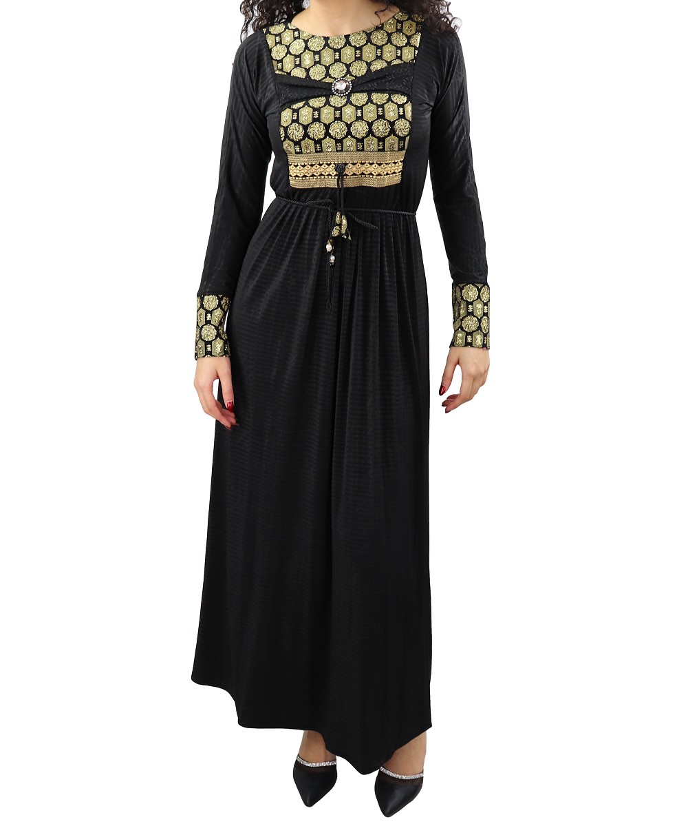 Robe de soirée Abaya Dubaï noire de qualité décorée d'un pompon doré avec motifs à base de diamants blancs et strass dorés - REF. 38175 (45.00 €)