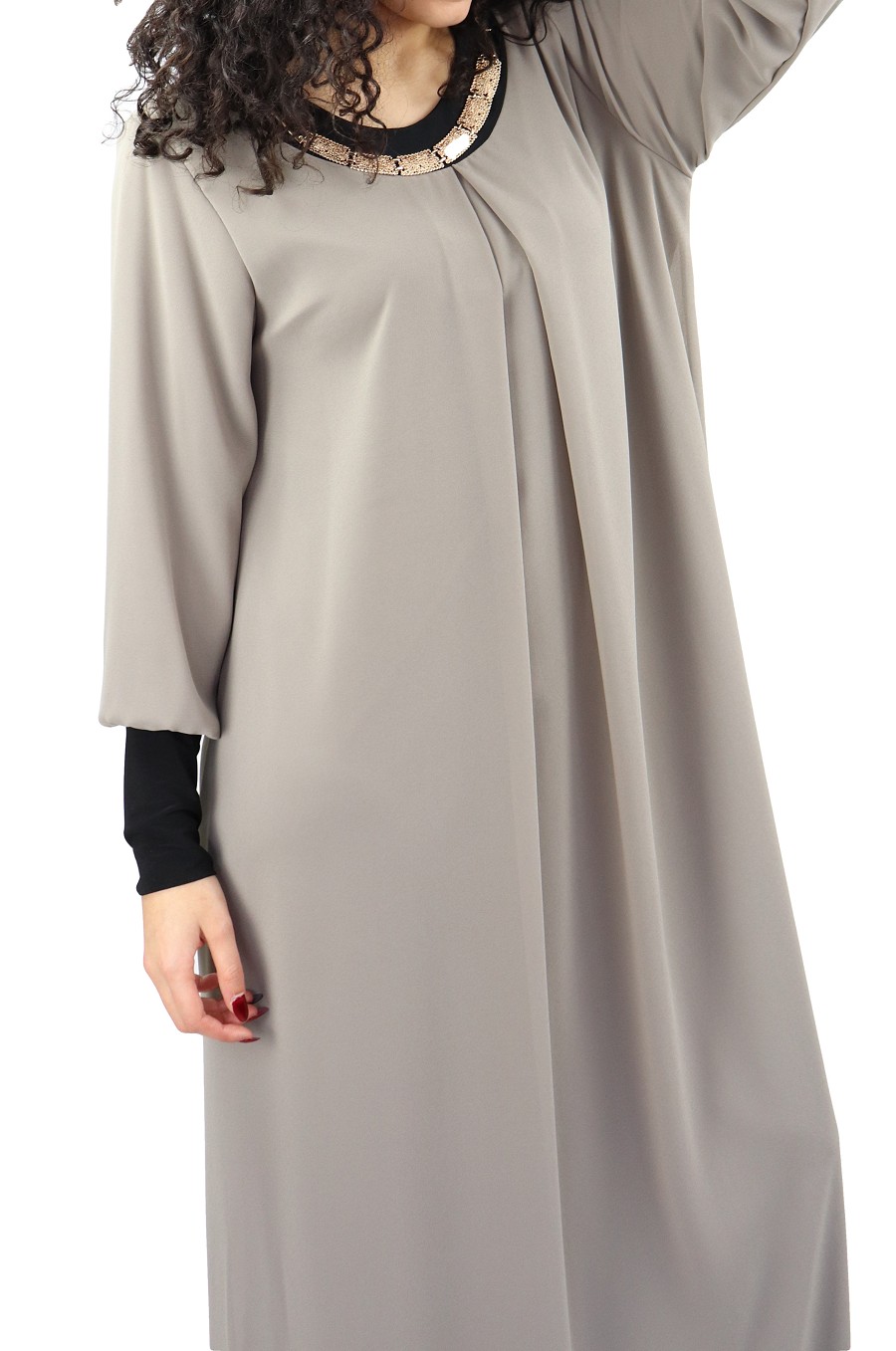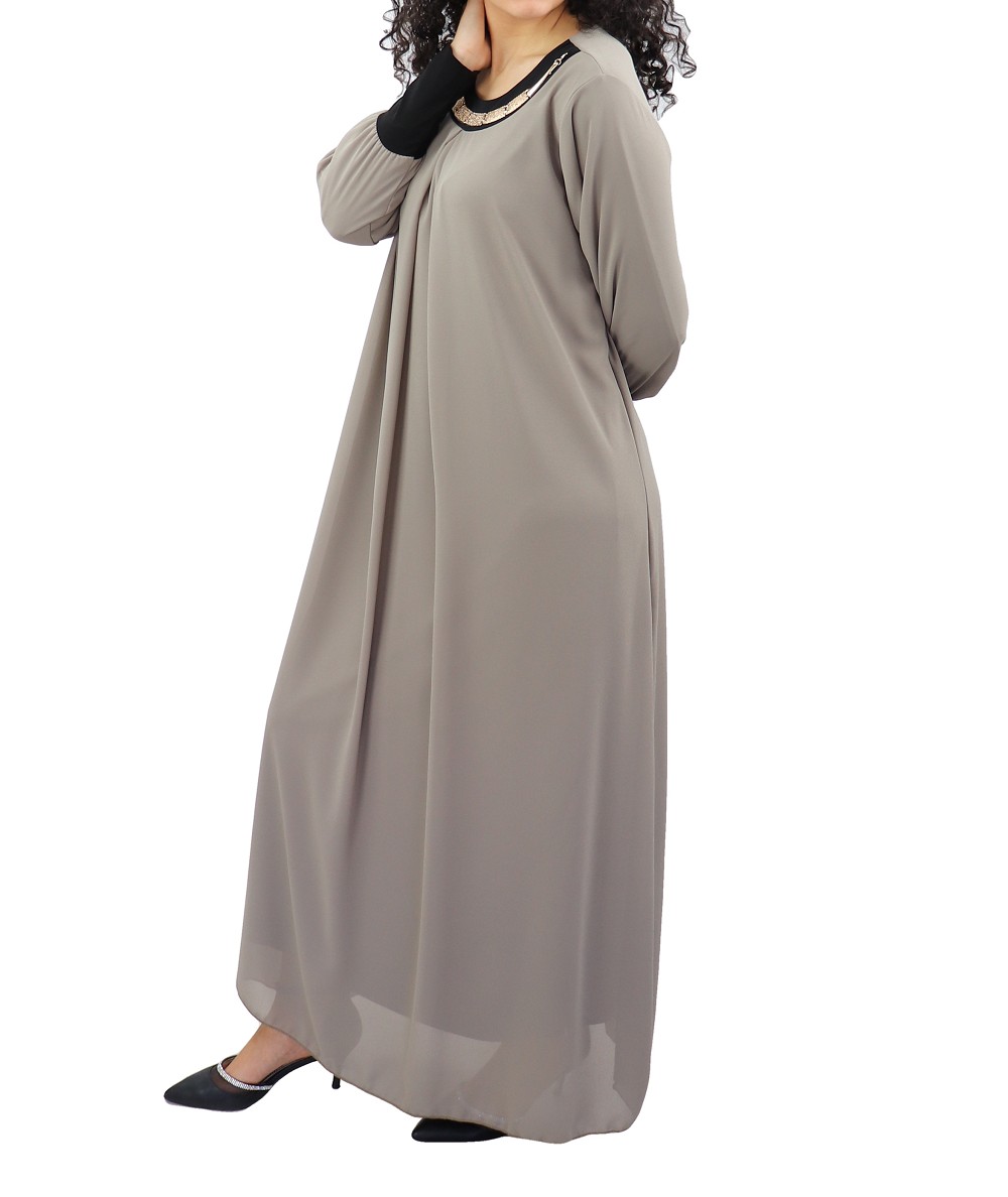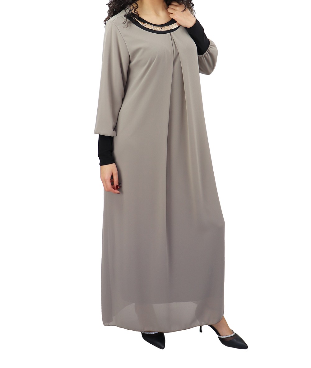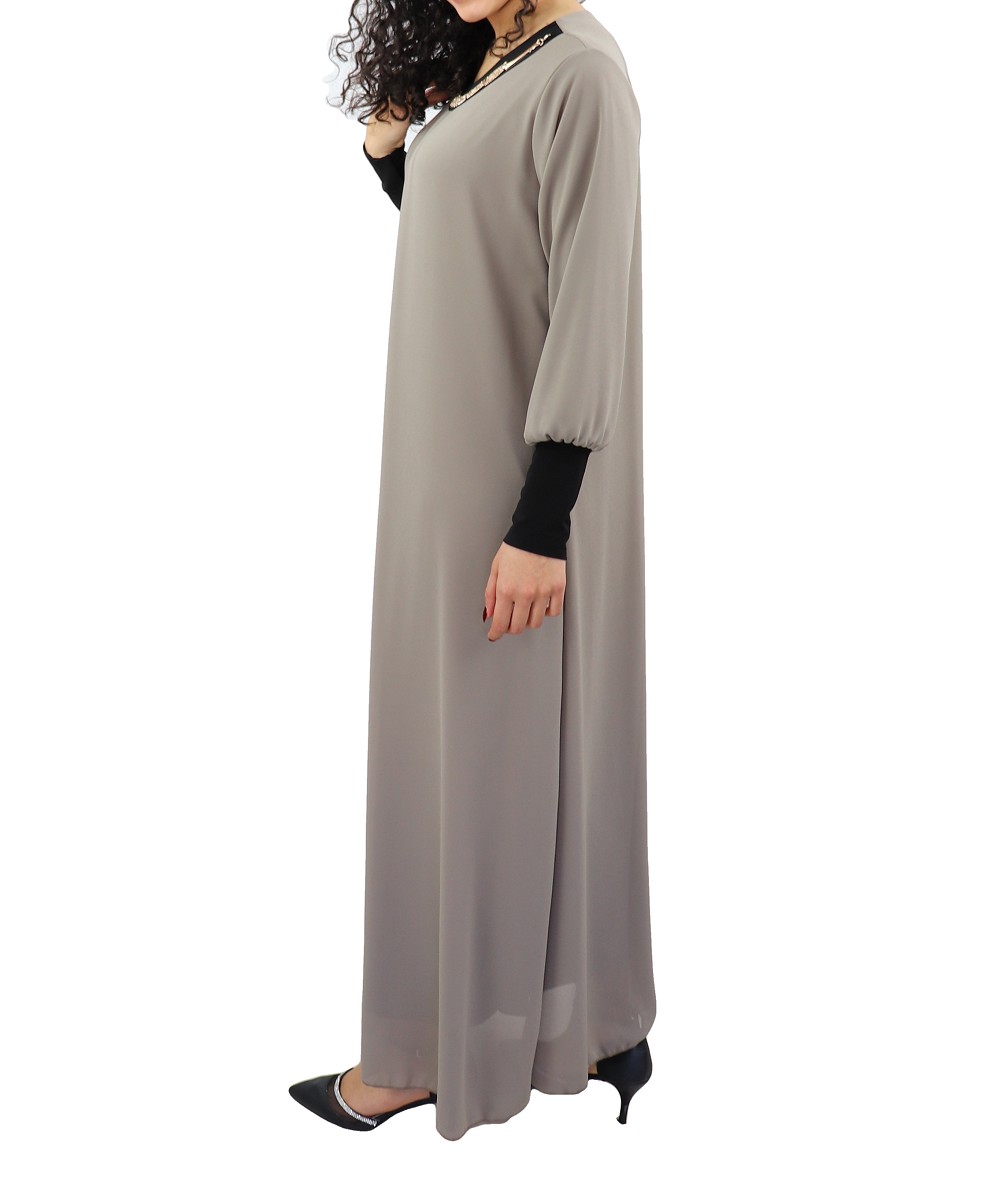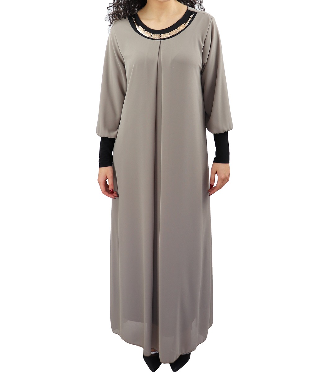 Robe longue, col rond avec un joli collier intégré, entièrement doublée, manches longues, resserrées aux poignets par une bande large élastique. Sobre et élégant, Cette tenue s’accommode pour diverses occasions aussi bien festives que quotidiennes.