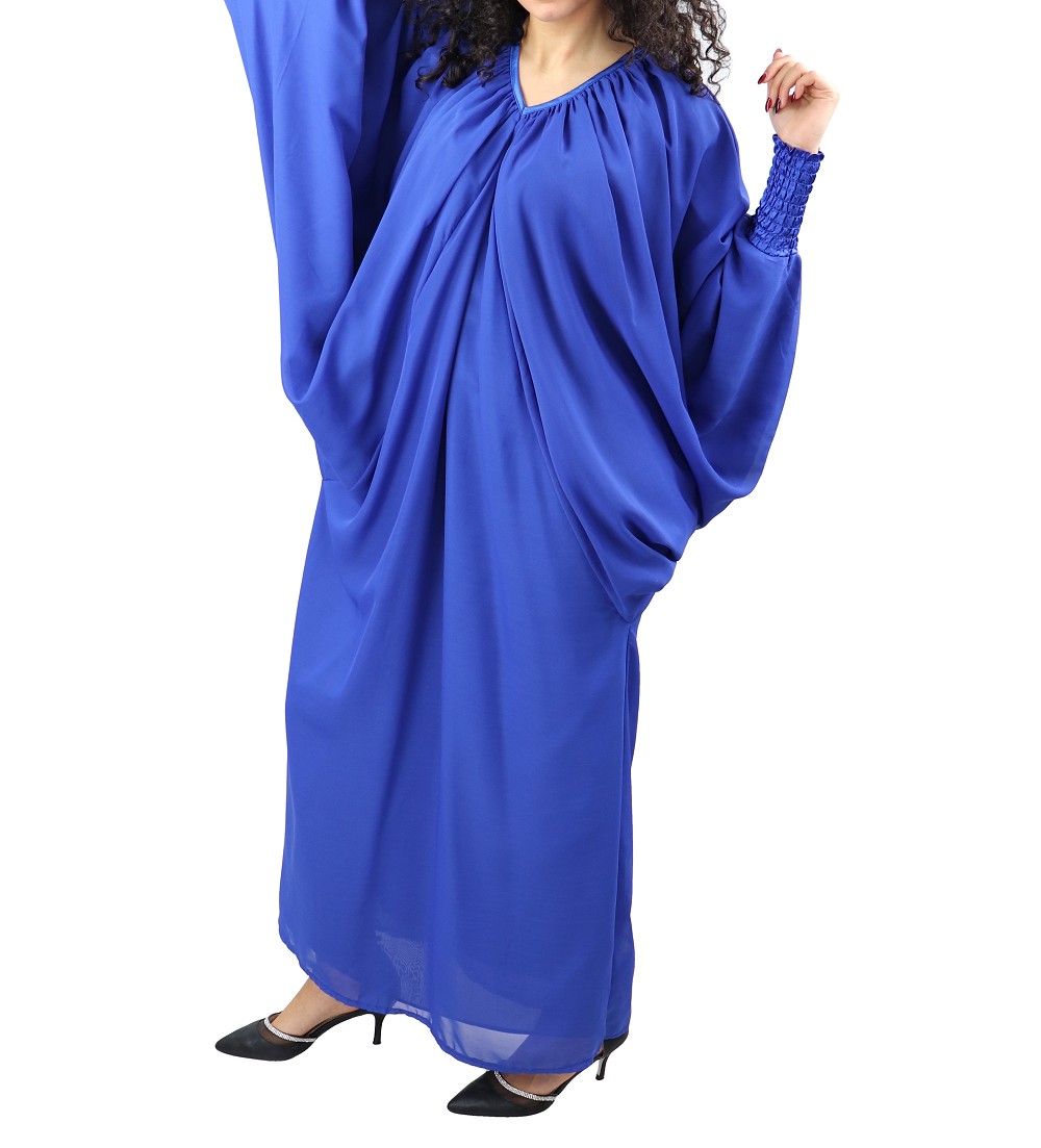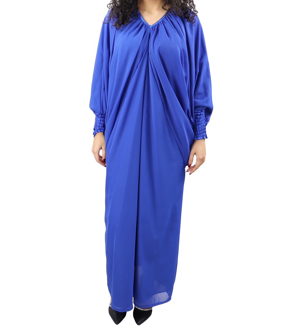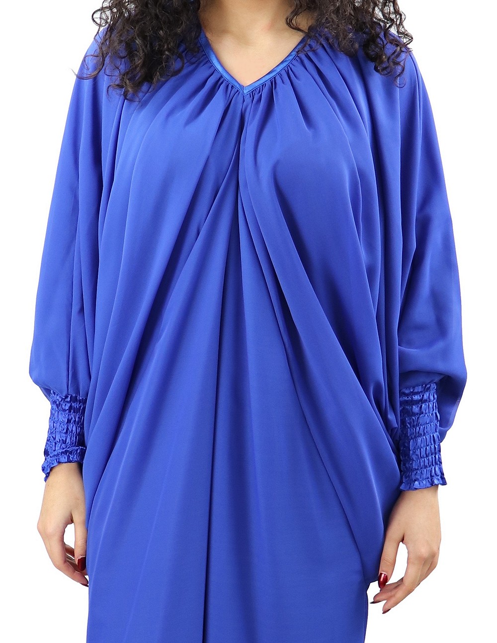 Robe confortable et habillée . Col en V satiné, manches amples resserrées aux poignets par une bande élastique froncée et satinée. Tissu léger style "organza" accompagné d'une doublure. Coupe papillon en haut et droite au niveau des hanches.