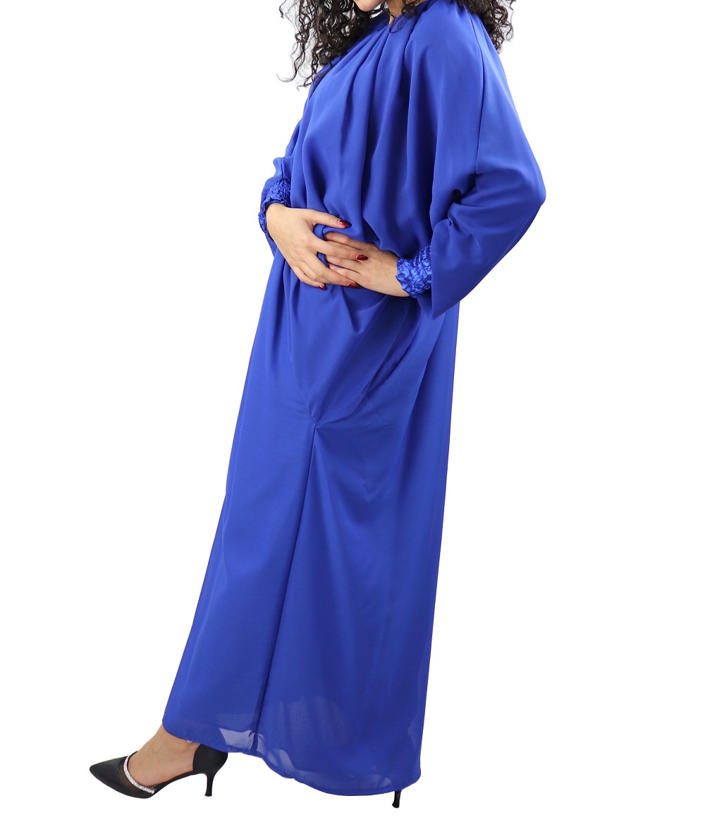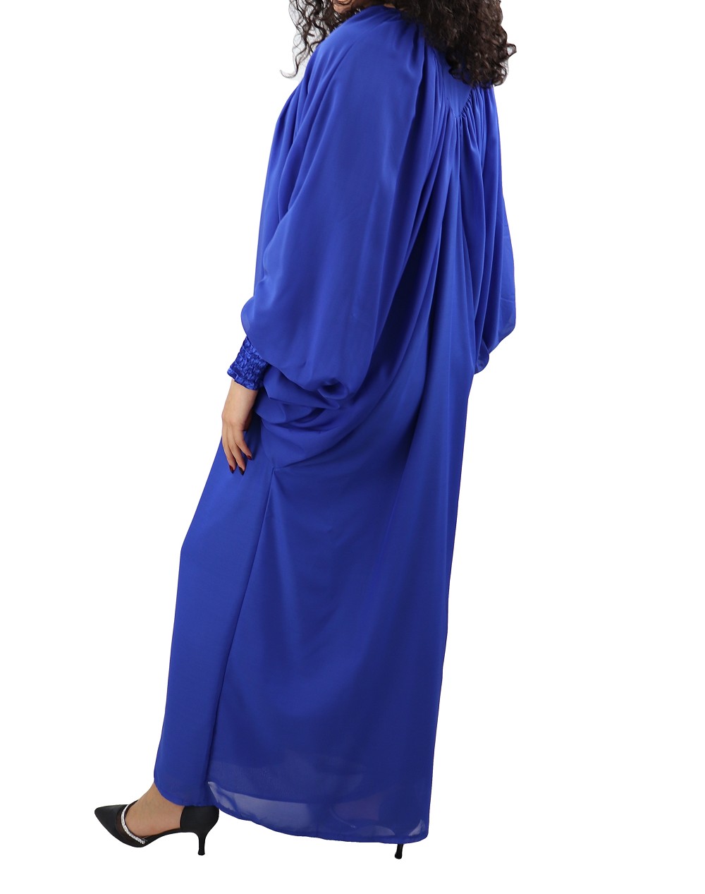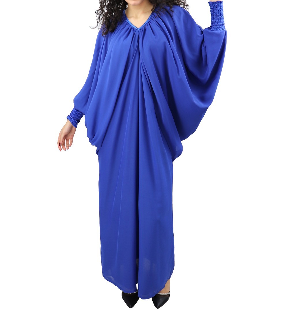 Robe confortable et habillée . Col en V satiné, manches amples resserrées aux poignets par une bande élastique froncée et satinée. Tissu léger style "organza" accompagné d'une doublure. Coupe papillon en haut et droite au niveau des hanches.