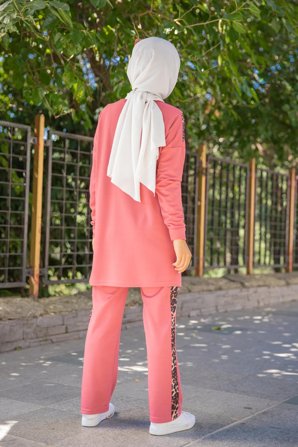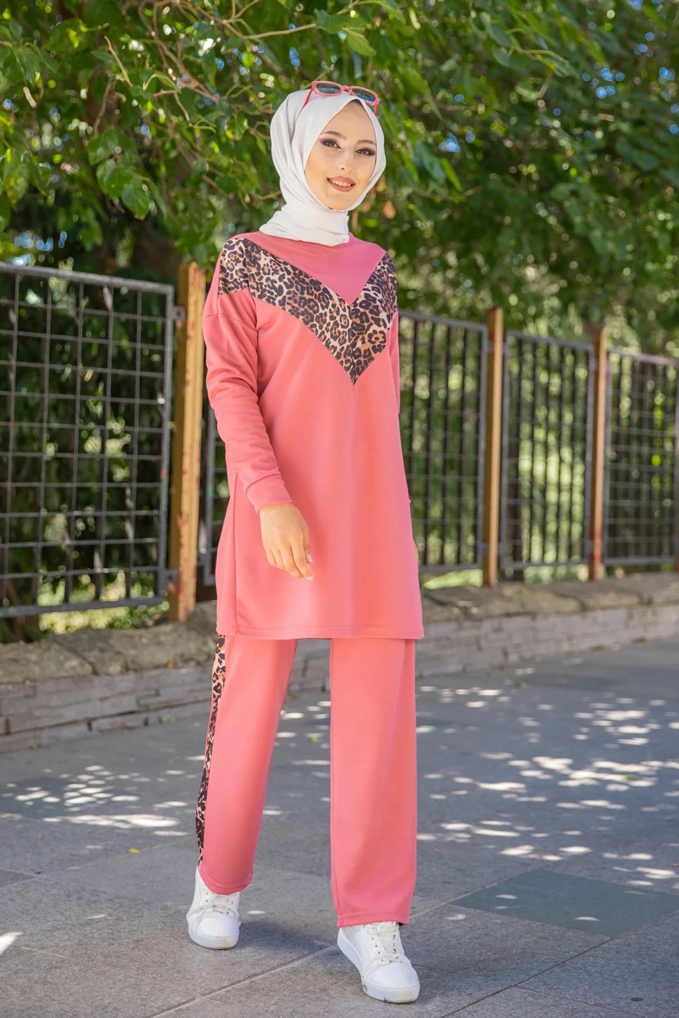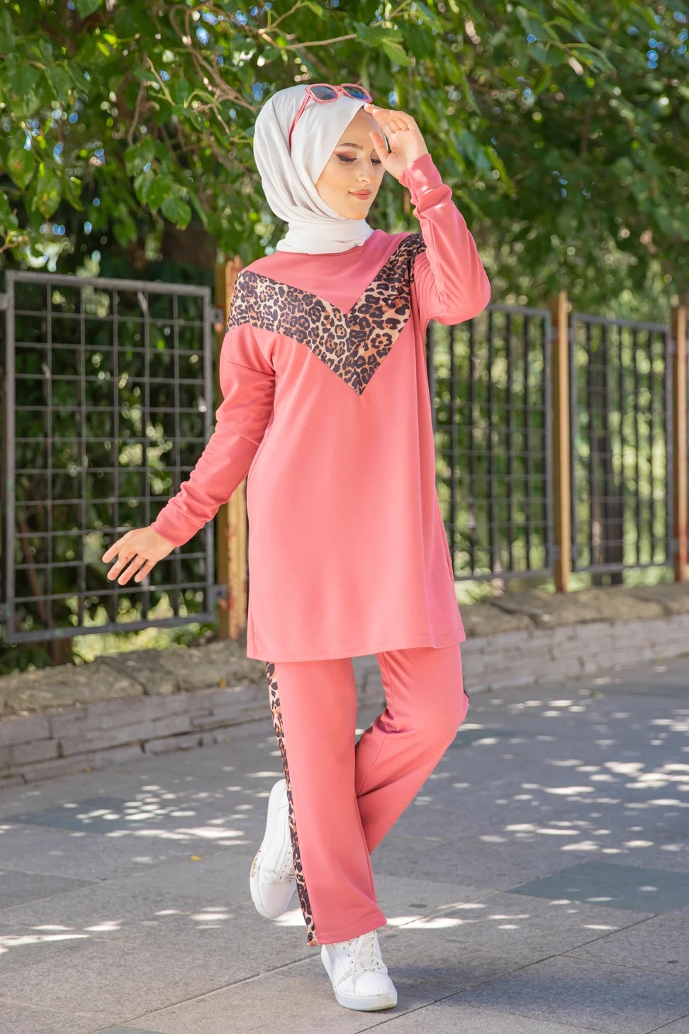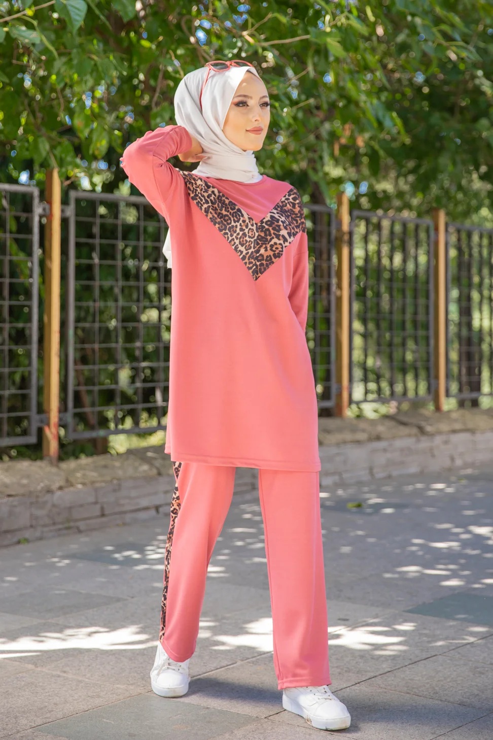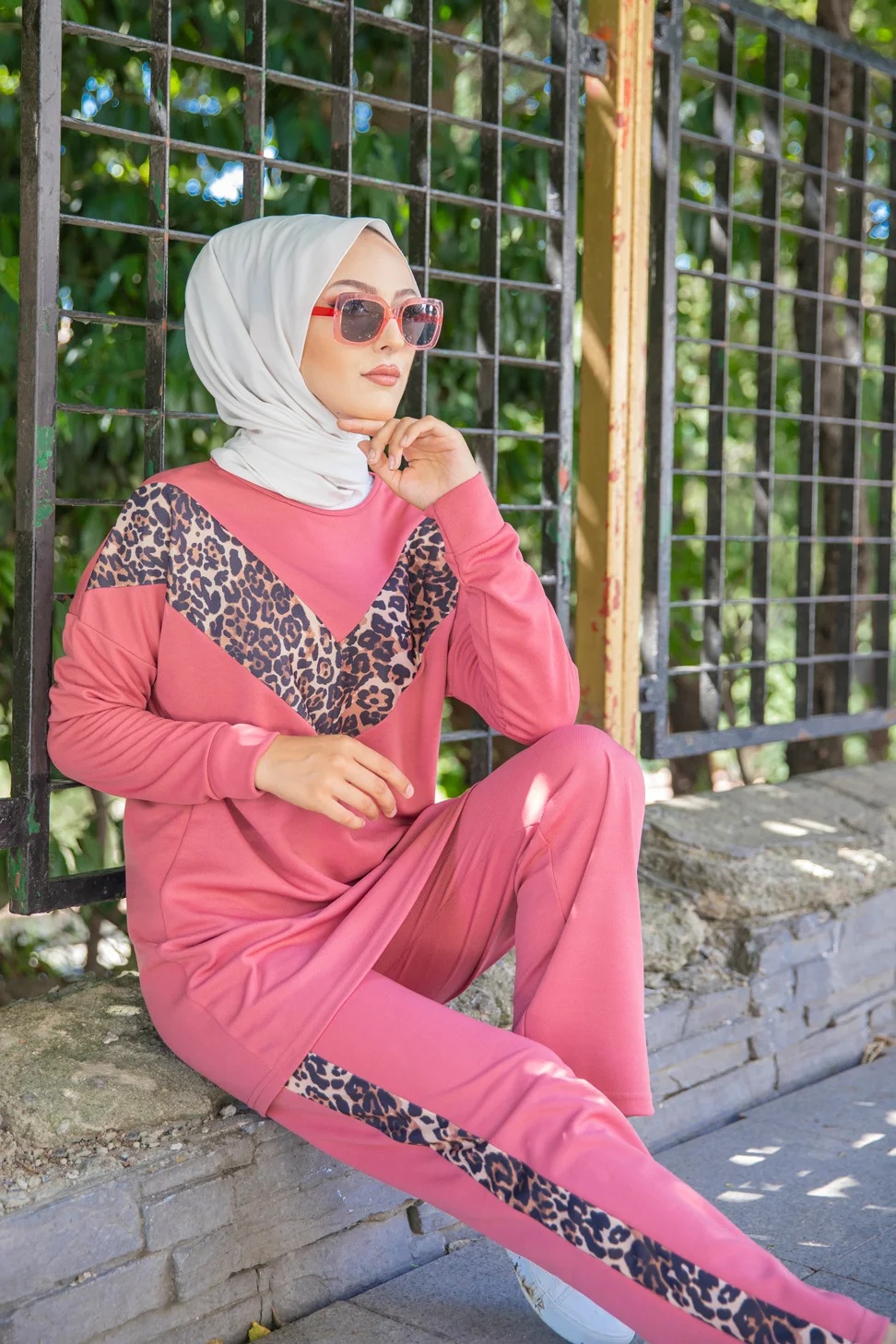 Ensemble survêtement sport, haut mi-long, col rond, manches longues, bas coupe droite, taille élastique. Un nouveau modèle disponible dans différentes couleurs. Cette tenue est parfaite pour le sport ou bien pour se mettre en mode "décontracté". Son tissu léopard le rend original.