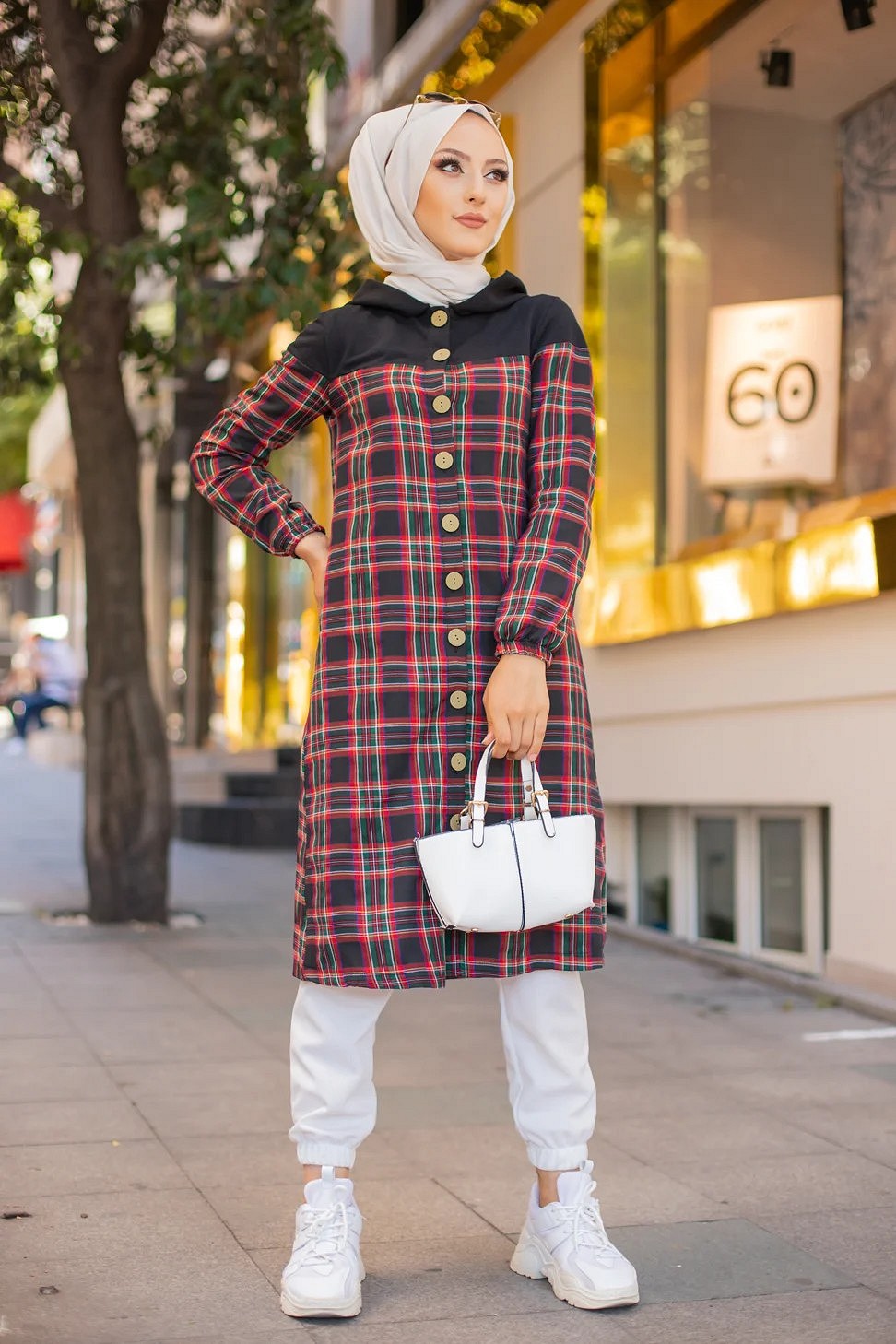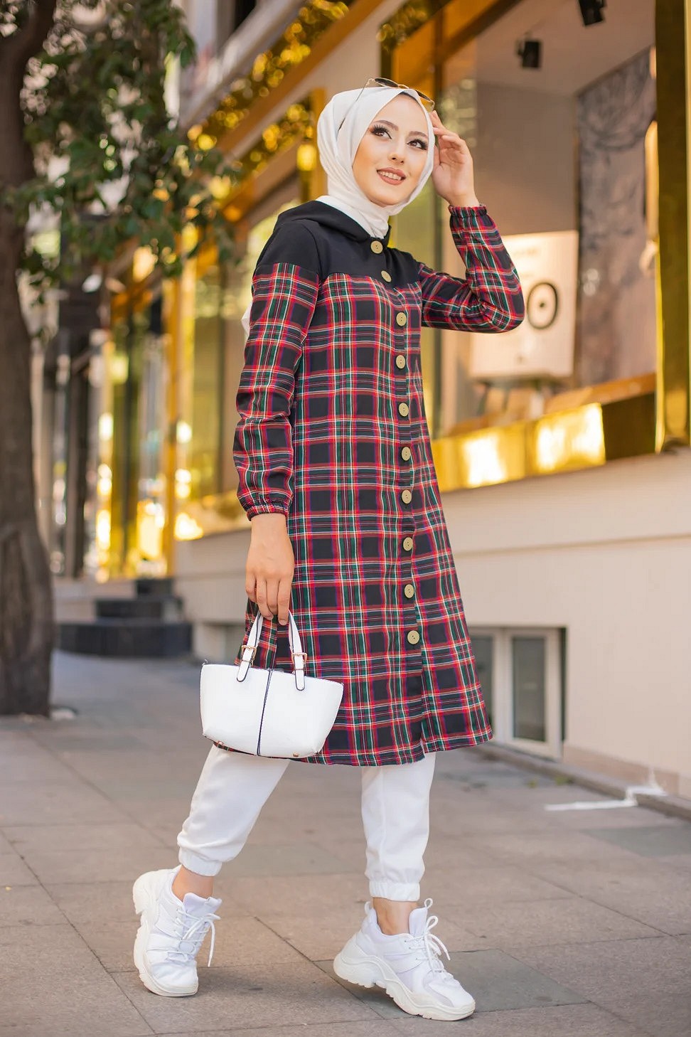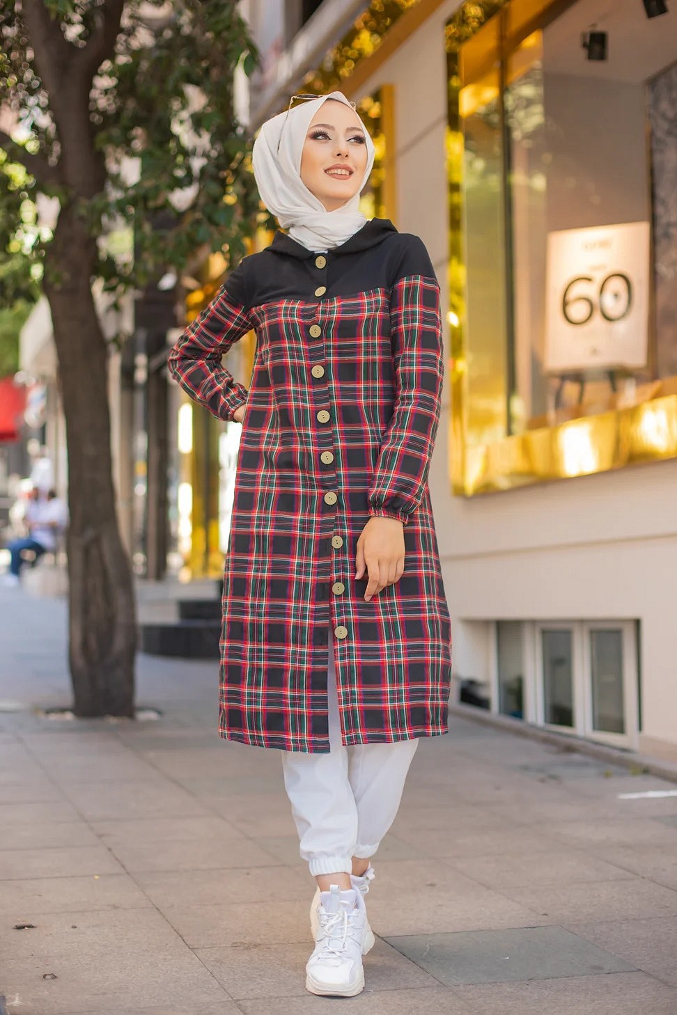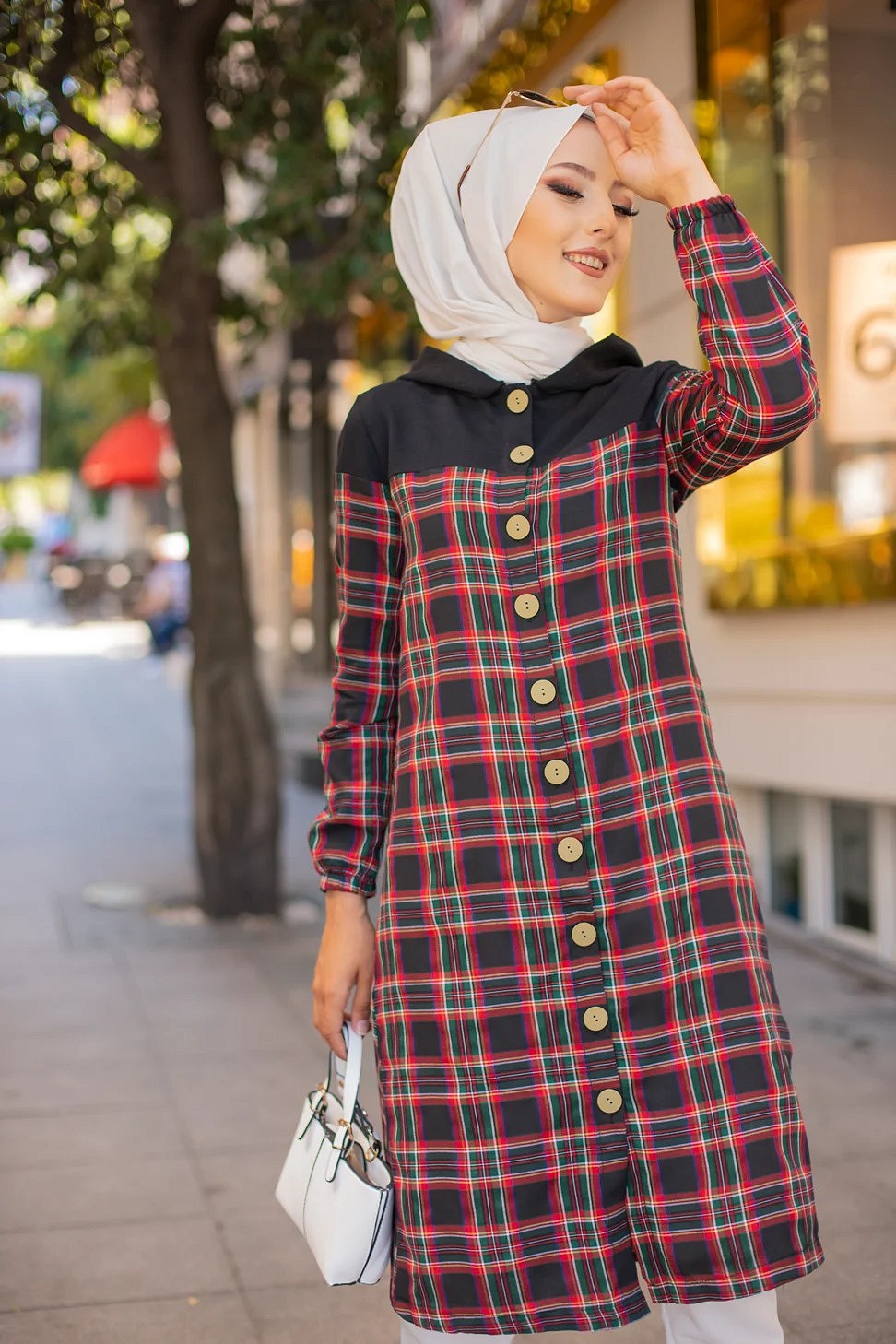 Tunique longue boutonnée à carreaux avec capuche (Vetement pour femme voilée - Mode Musulmane) Vetement & Accessoire