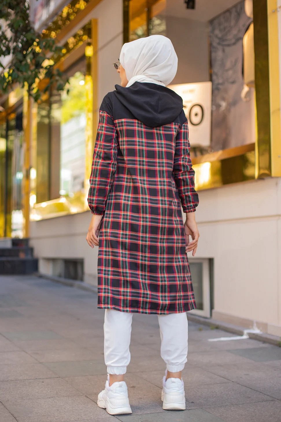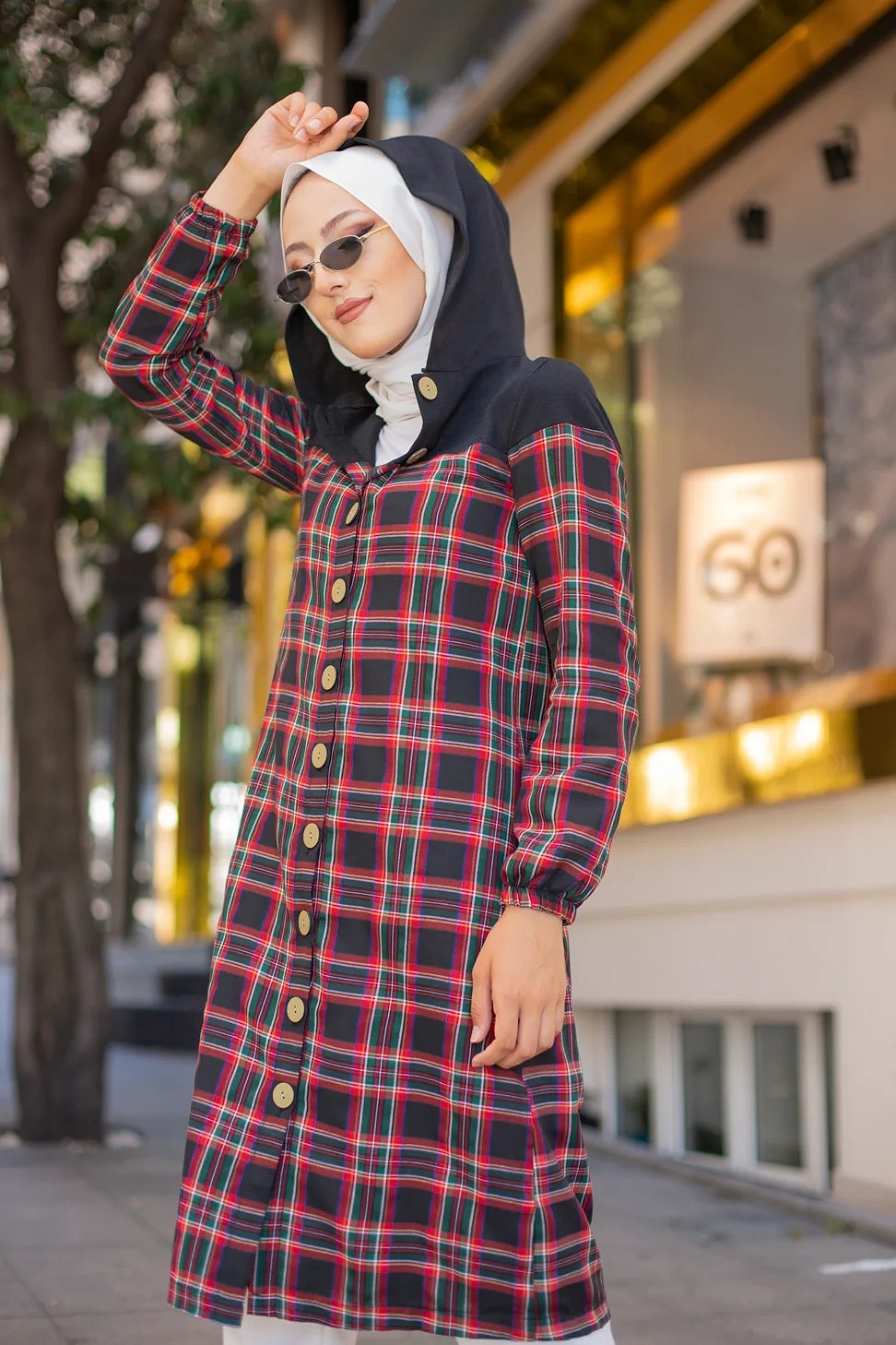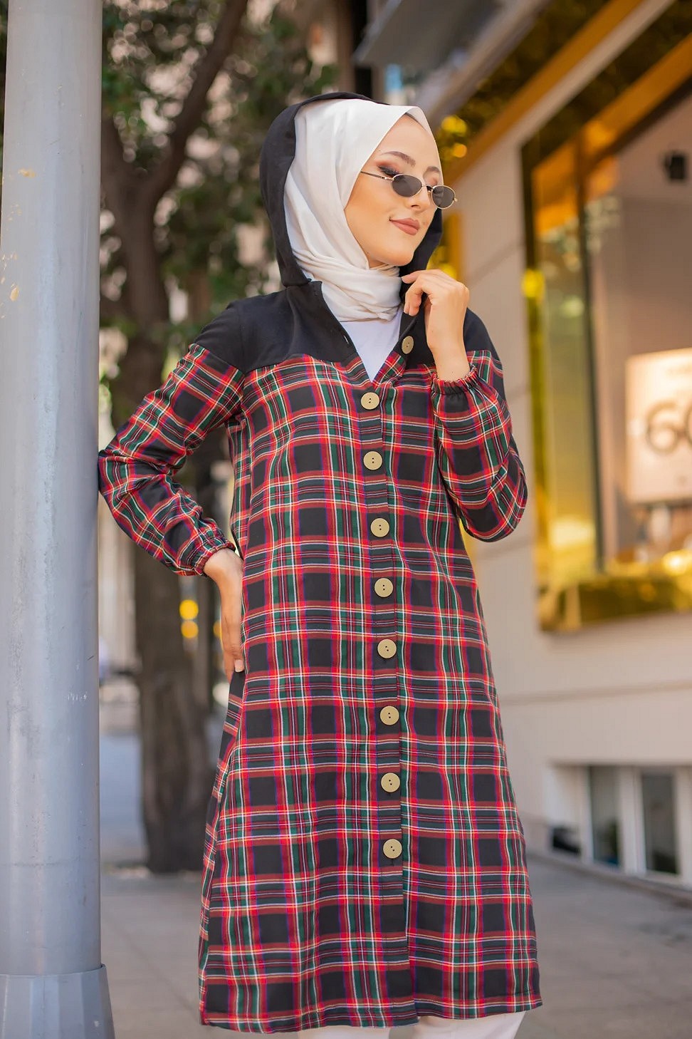 Tunique longue boutonnee a carreaux avec capuche (Vetement pour femme voilee - Mode Musulmane)