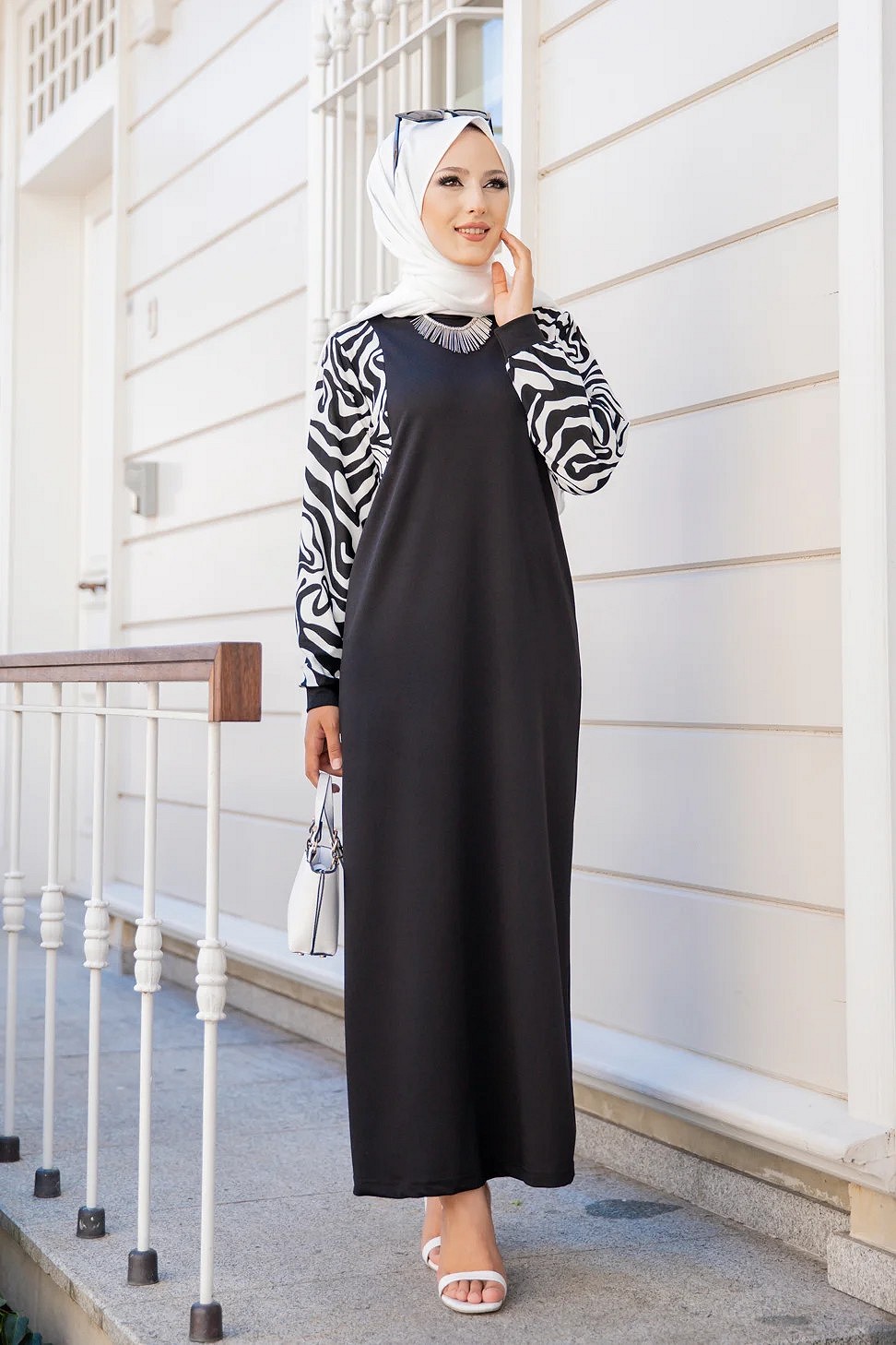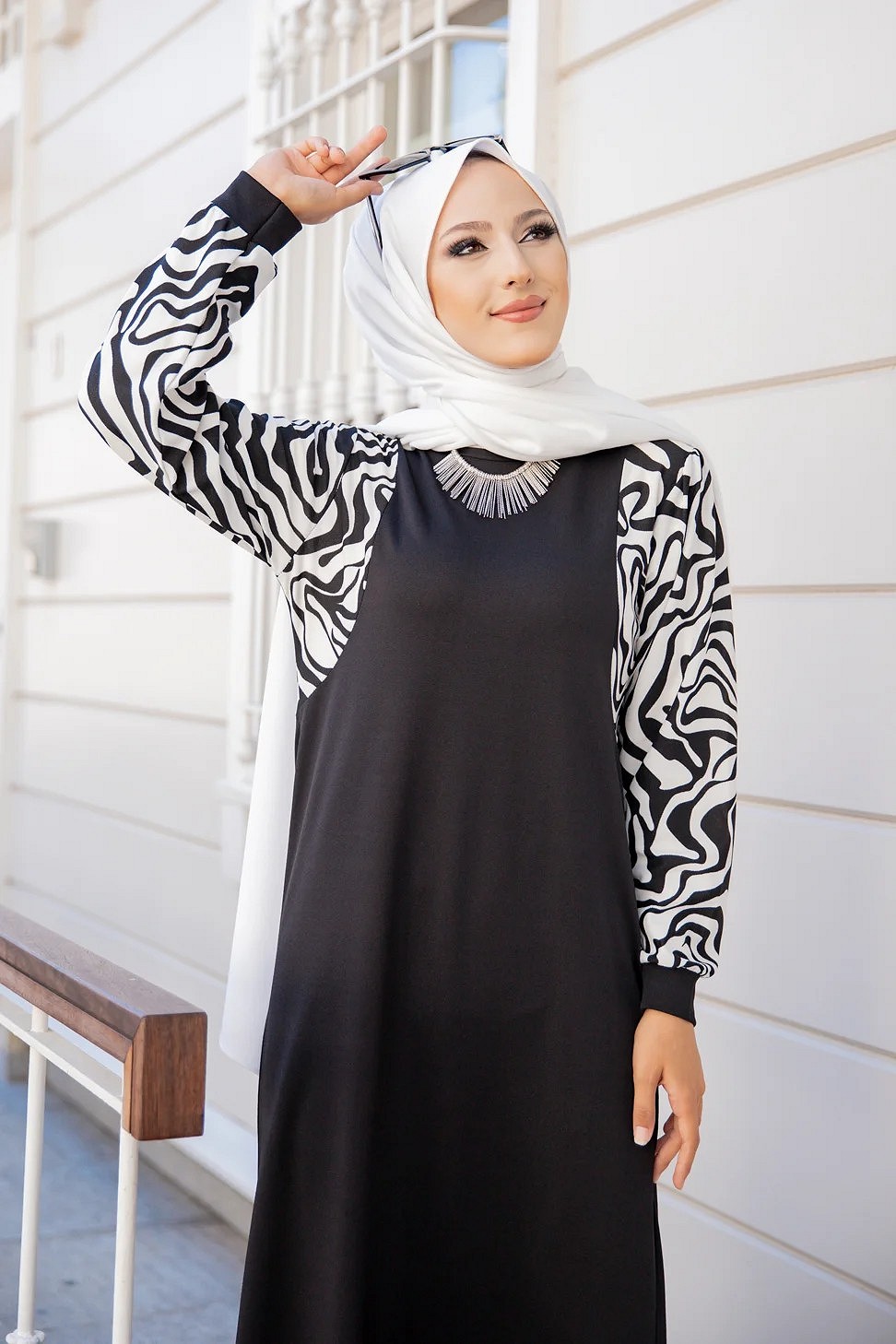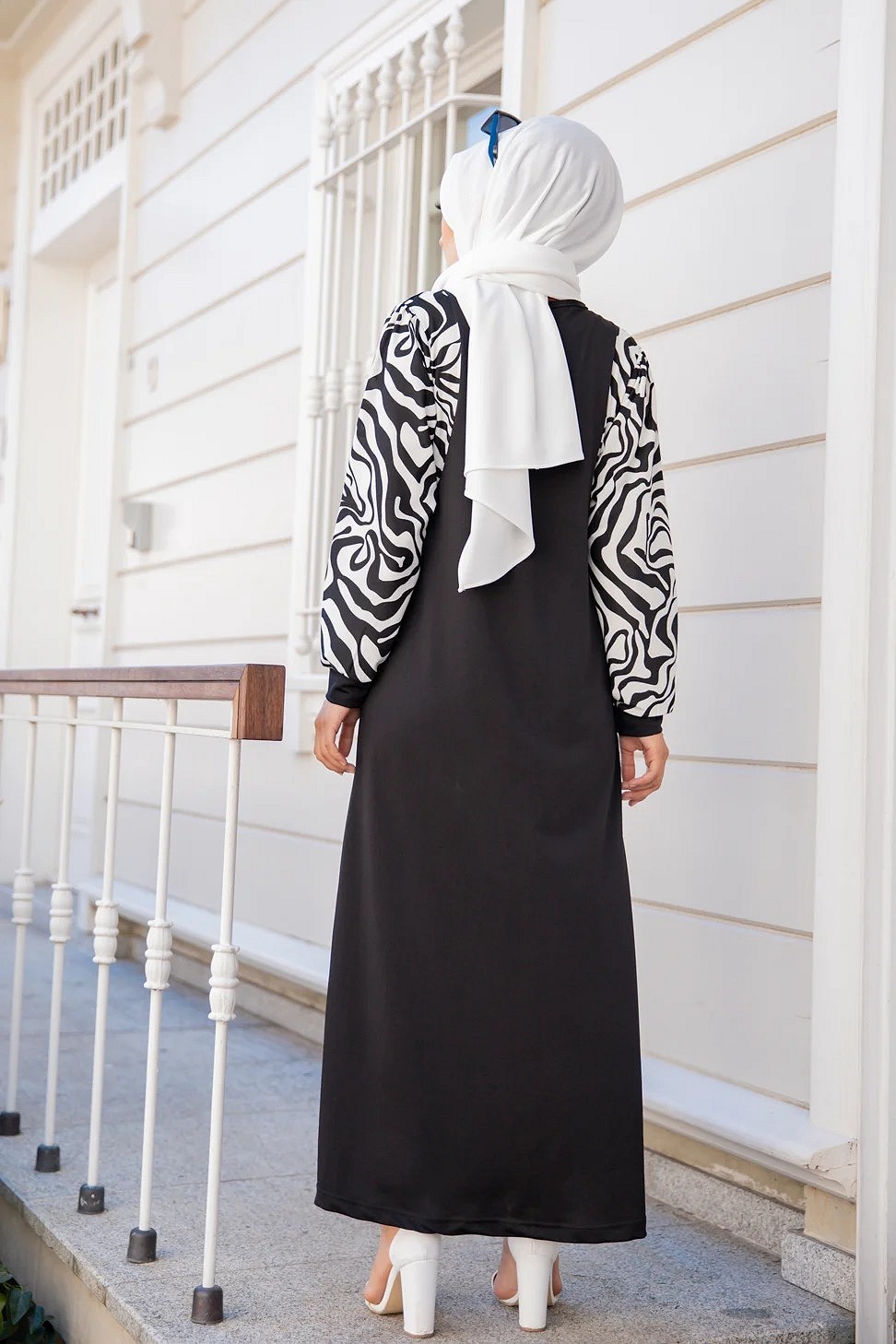 Robe longue, col rond, manches décorées zébrées blanc, coupe droite, tissu fluide.