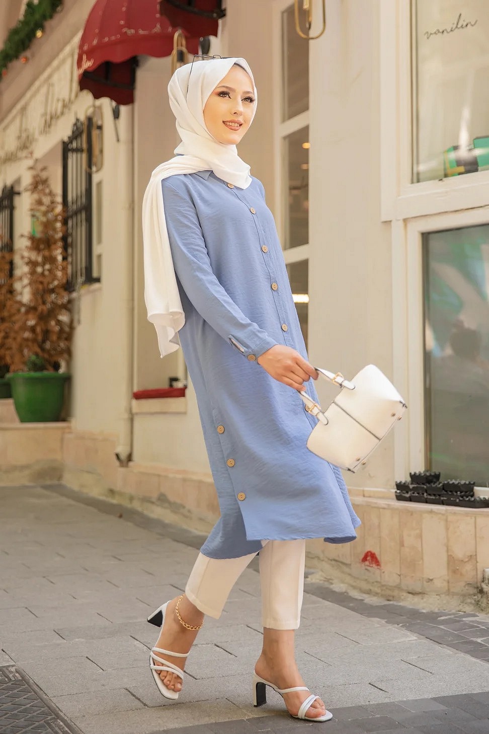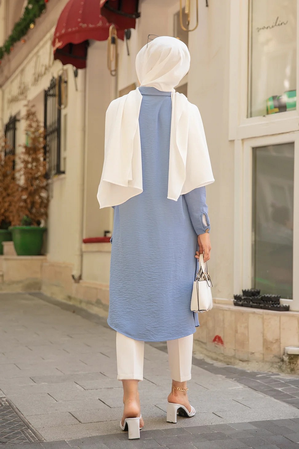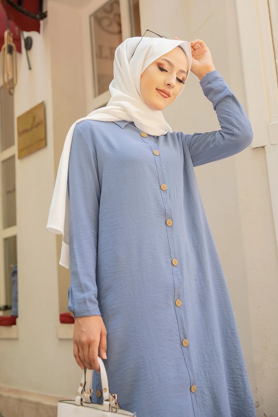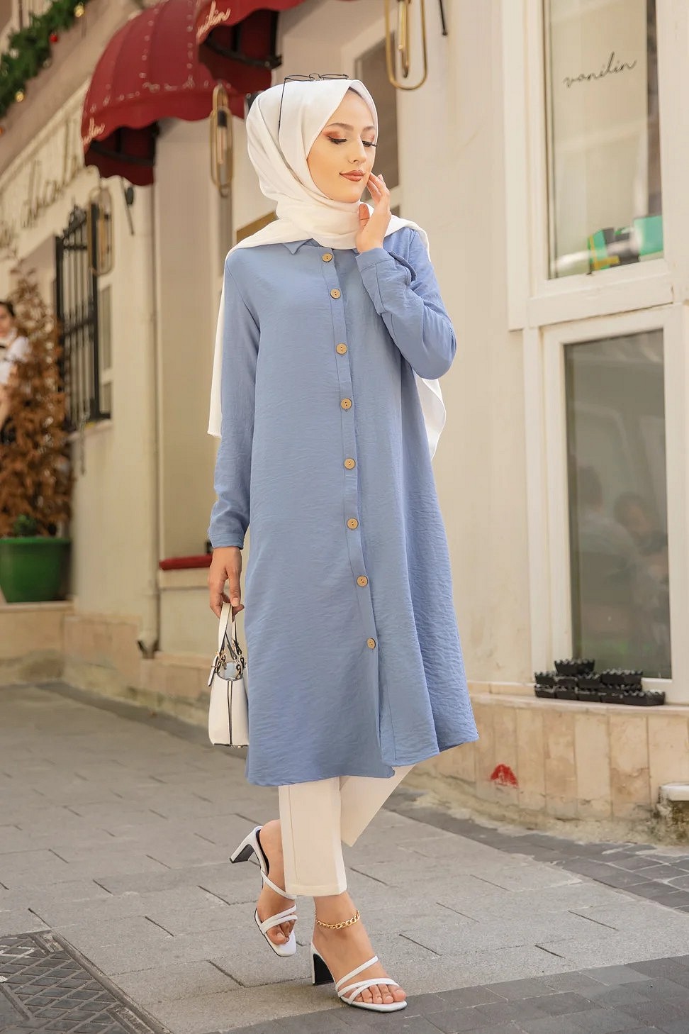 Chemise longue,boutonnée sur toute la longueur, coupe droite, tissu fluide et opaque.