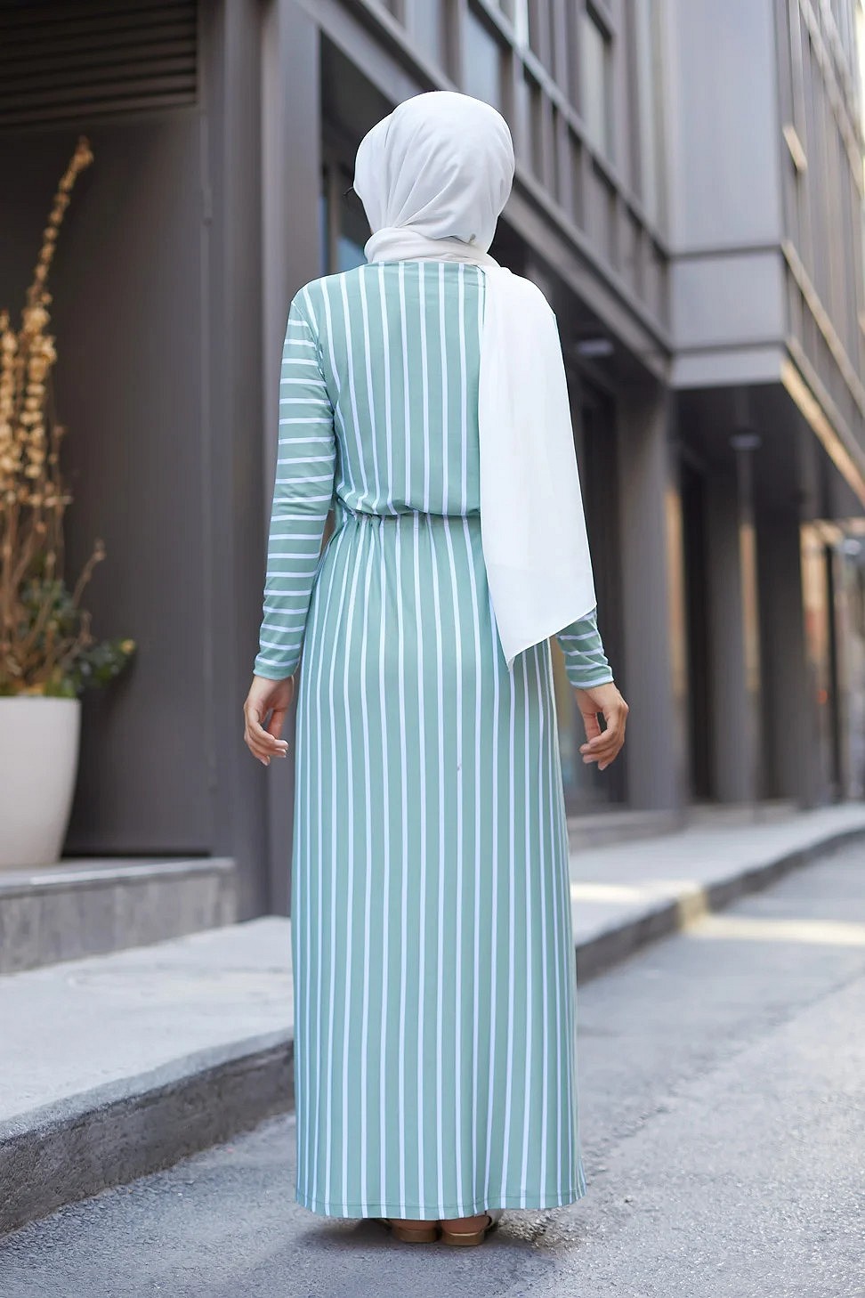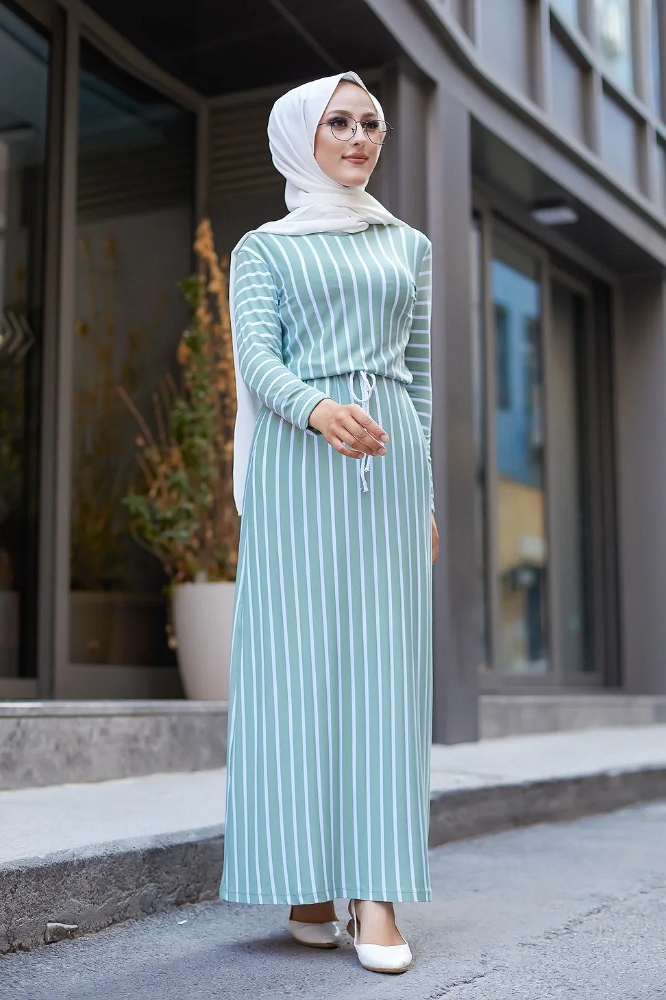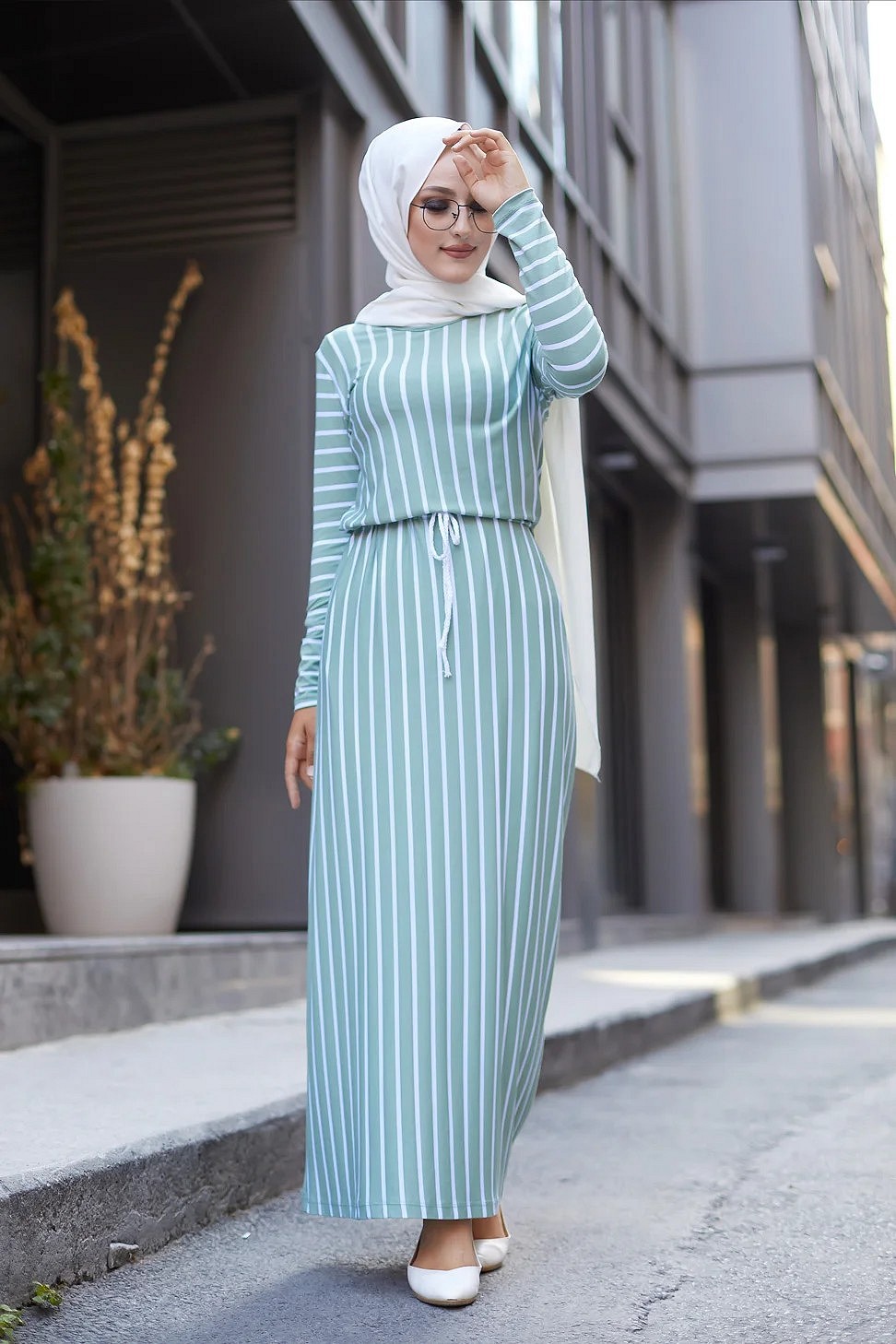 Robe très longue à rayures ceinture intégrée (Mode Musulmane) - Couleur Menthe Vetement & Accessoire