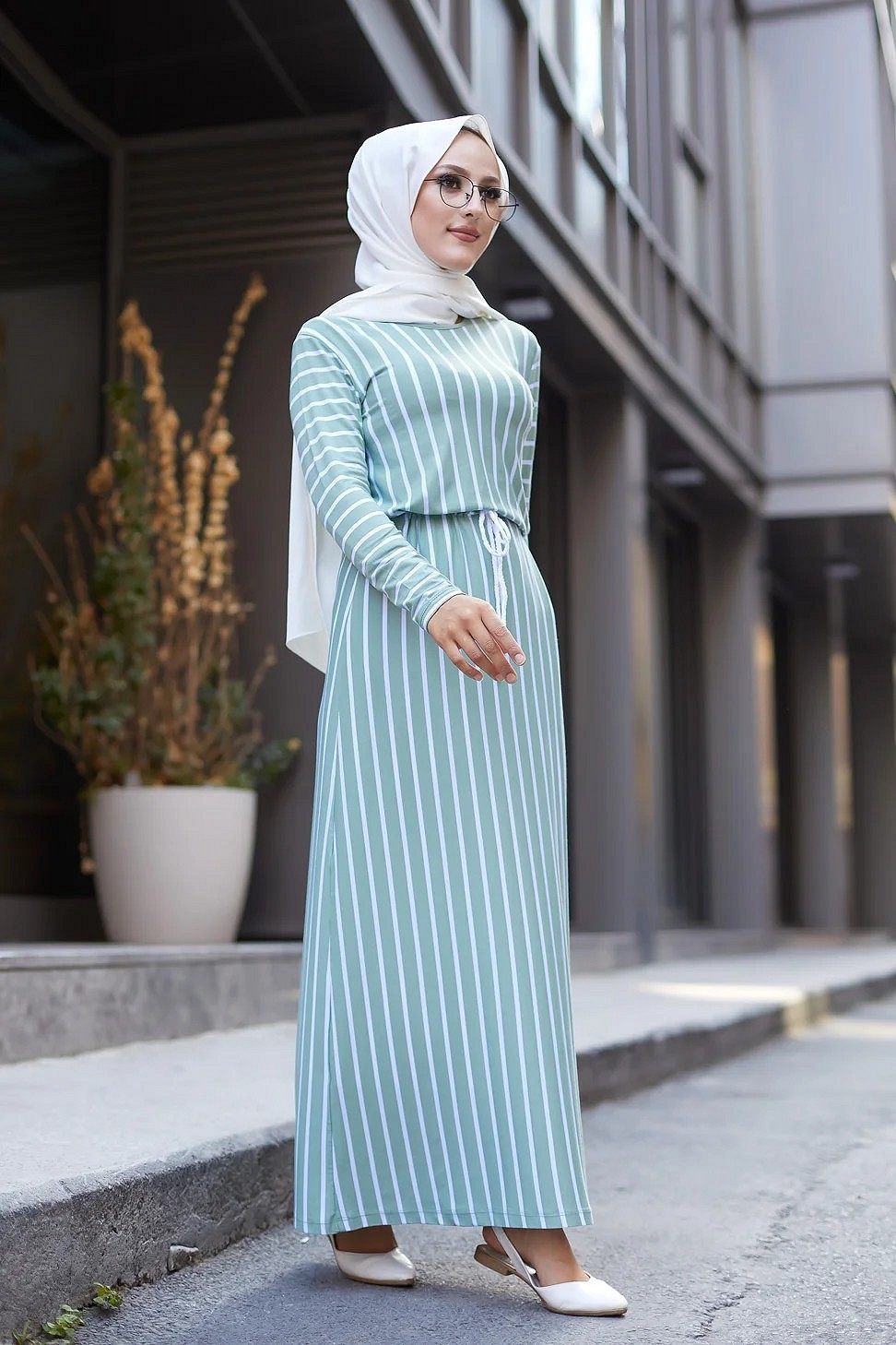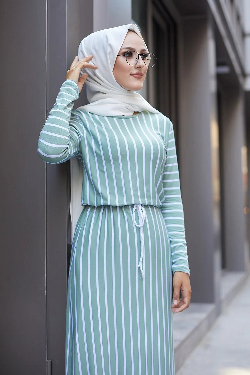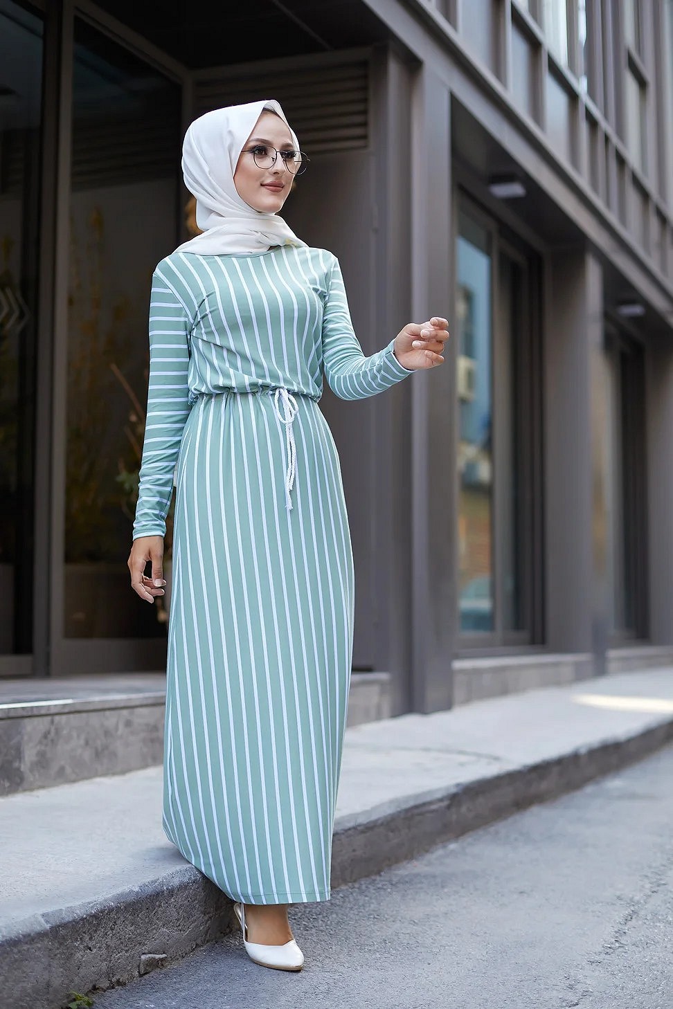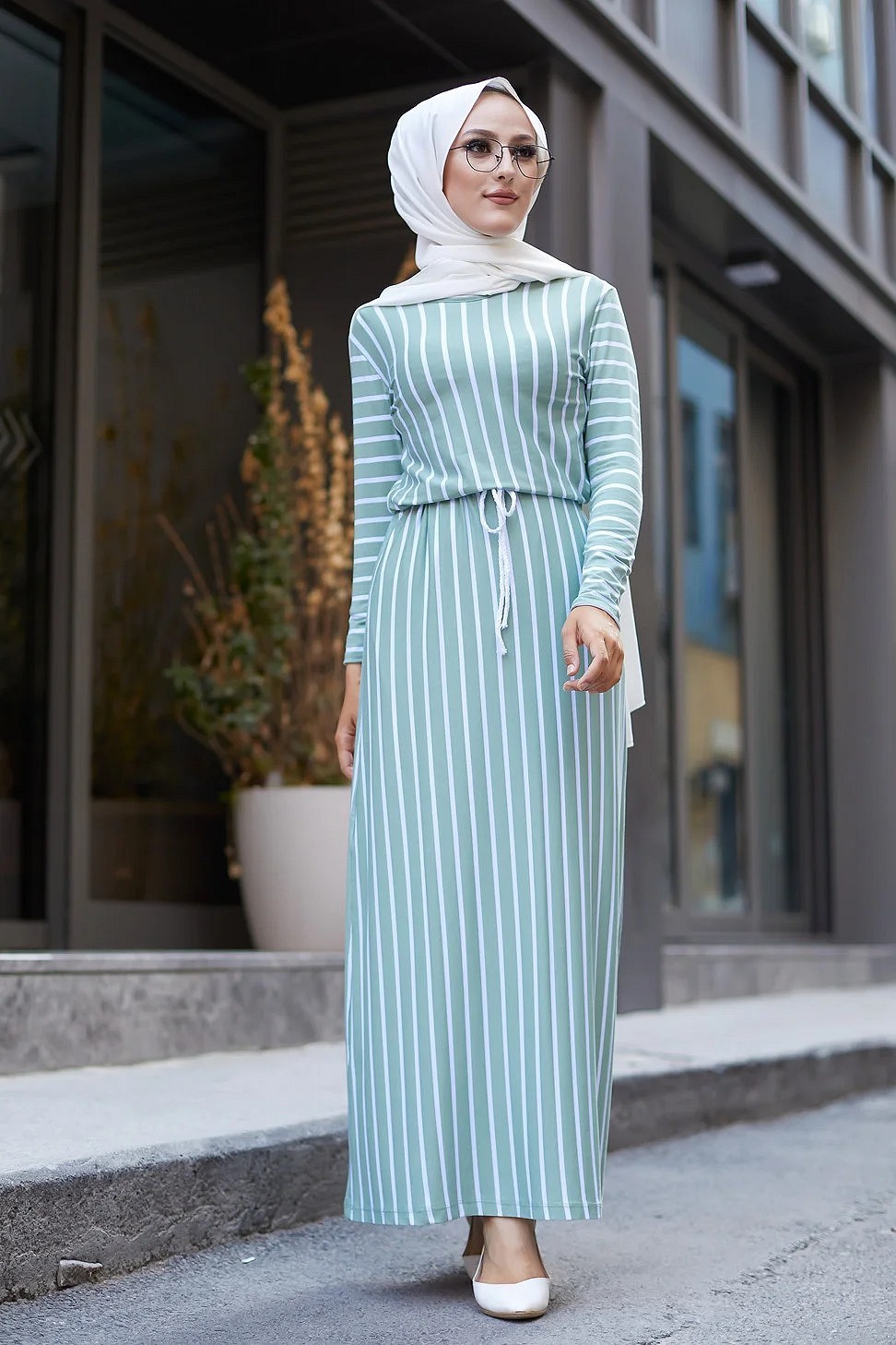 Robe très longue à rayures ceinture intégrée (Mode Musulmane) - Couleur Menthe Vetement & Accessoire