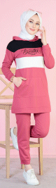 Survêtement tricolore à capuche imprimé "Breathe" (Vetement de sport pour femme musulmane) - Couleur Rose, noir et blanc - REF. 34586 (29.90 €)