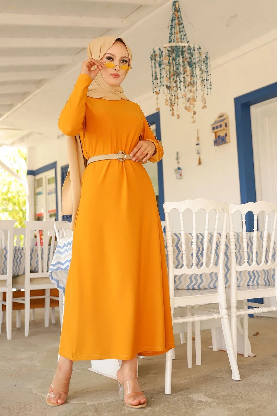 Robe decoree de boutons pour femme voilee - Vetement islamique moderne - Couleur Moutarde