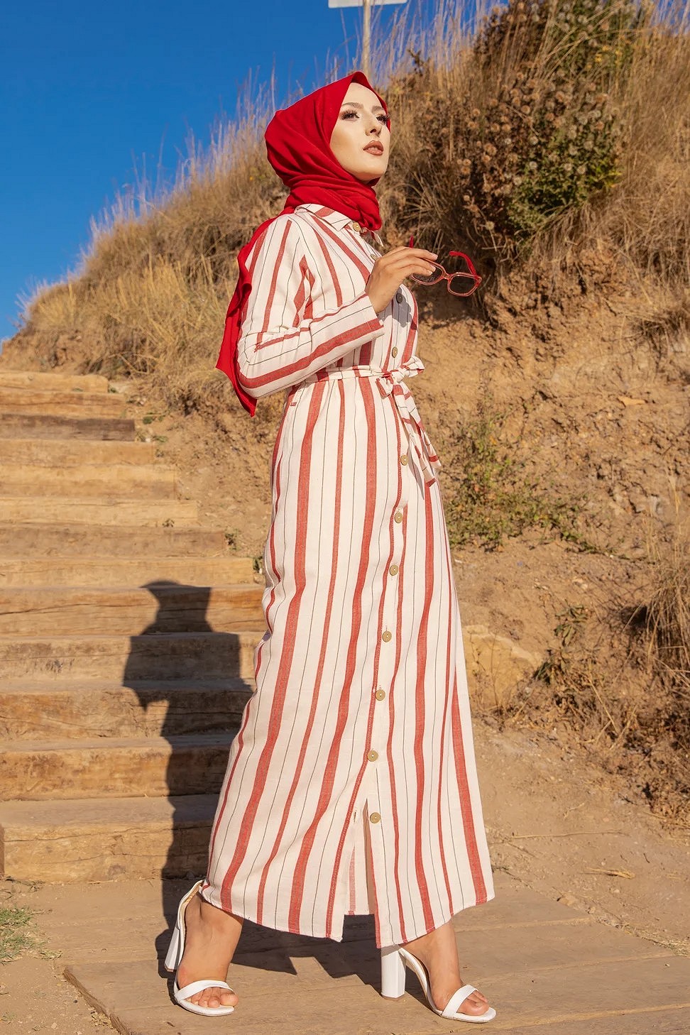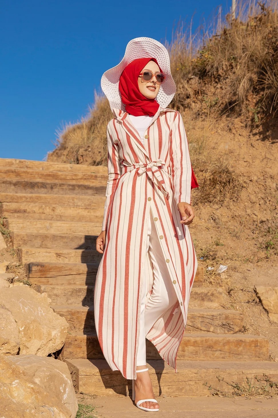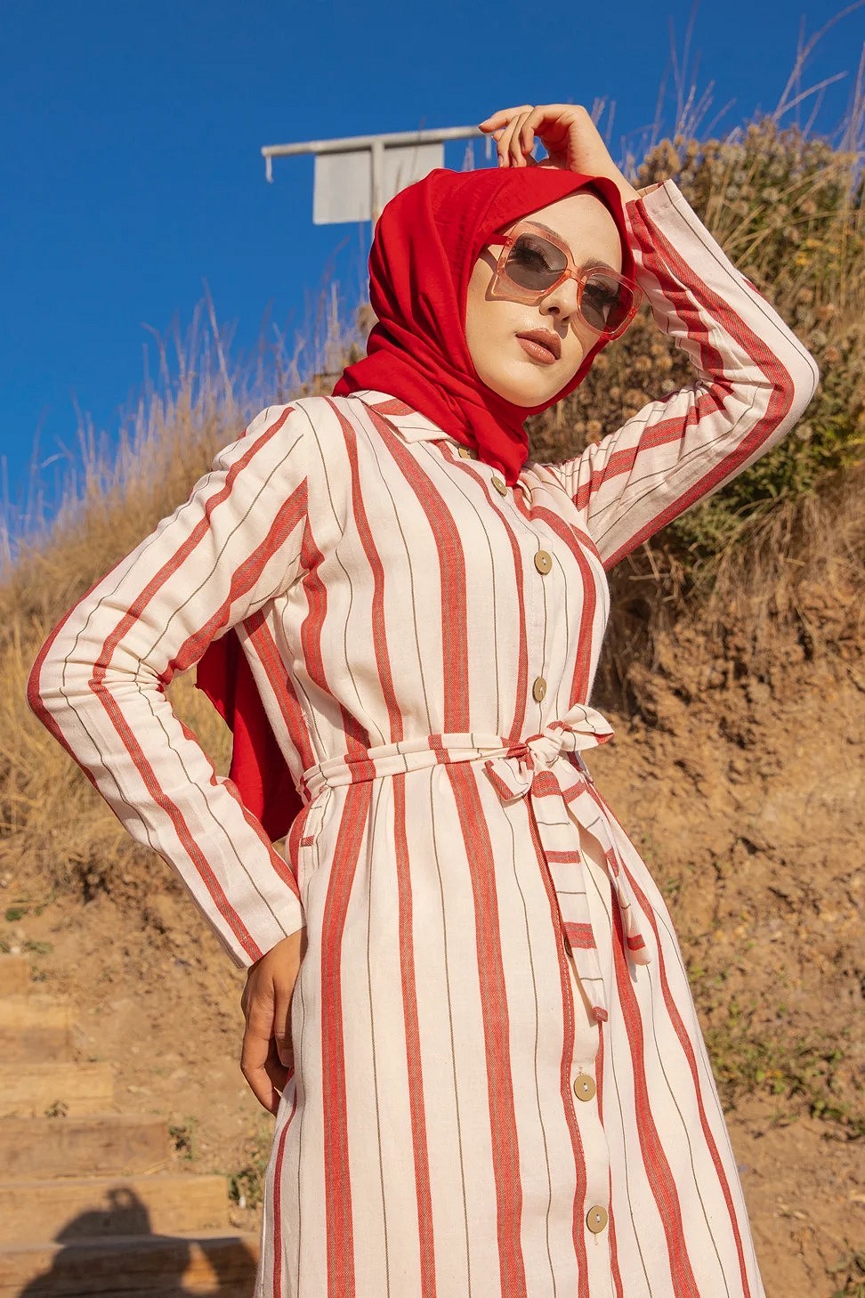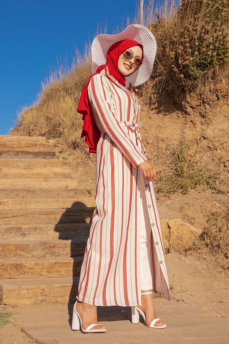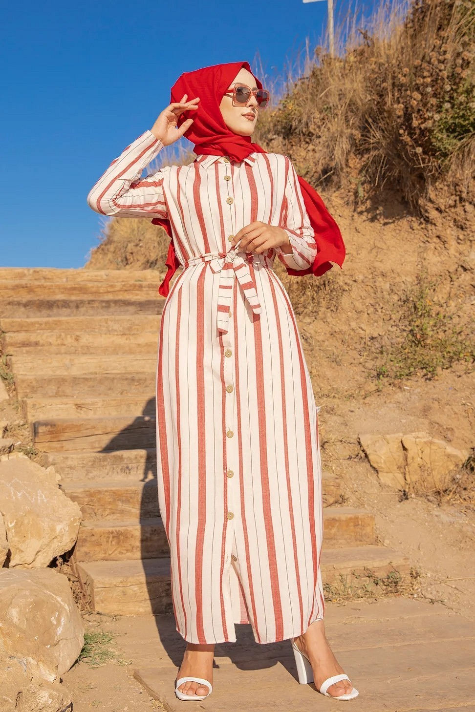 Robe chemise tres longue a rayures (Vetement decontracte pour femme musulmane) - Couleur creme et rouge