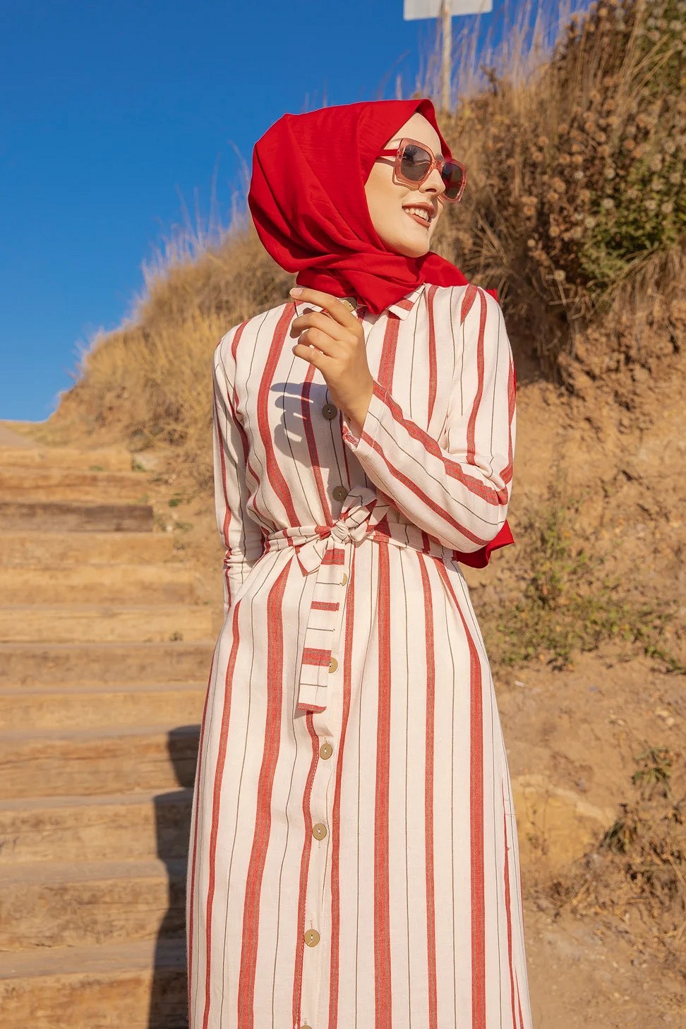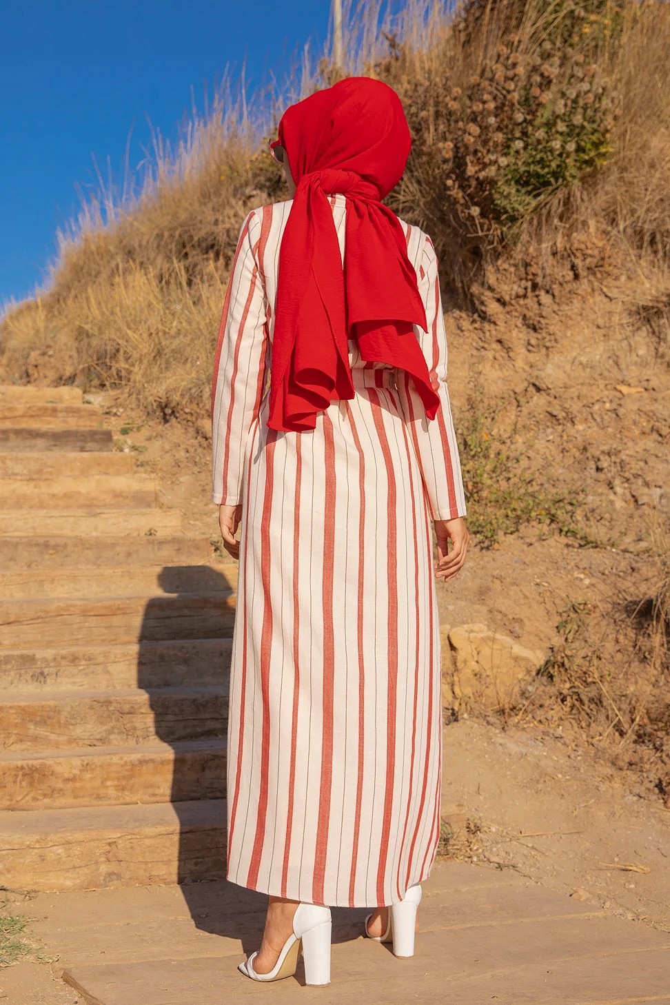 Robe chemise très longue à rayures (Vêtement décontracté pour femme musulmane) - Couleur crème et rouge Vetement & Accessoire