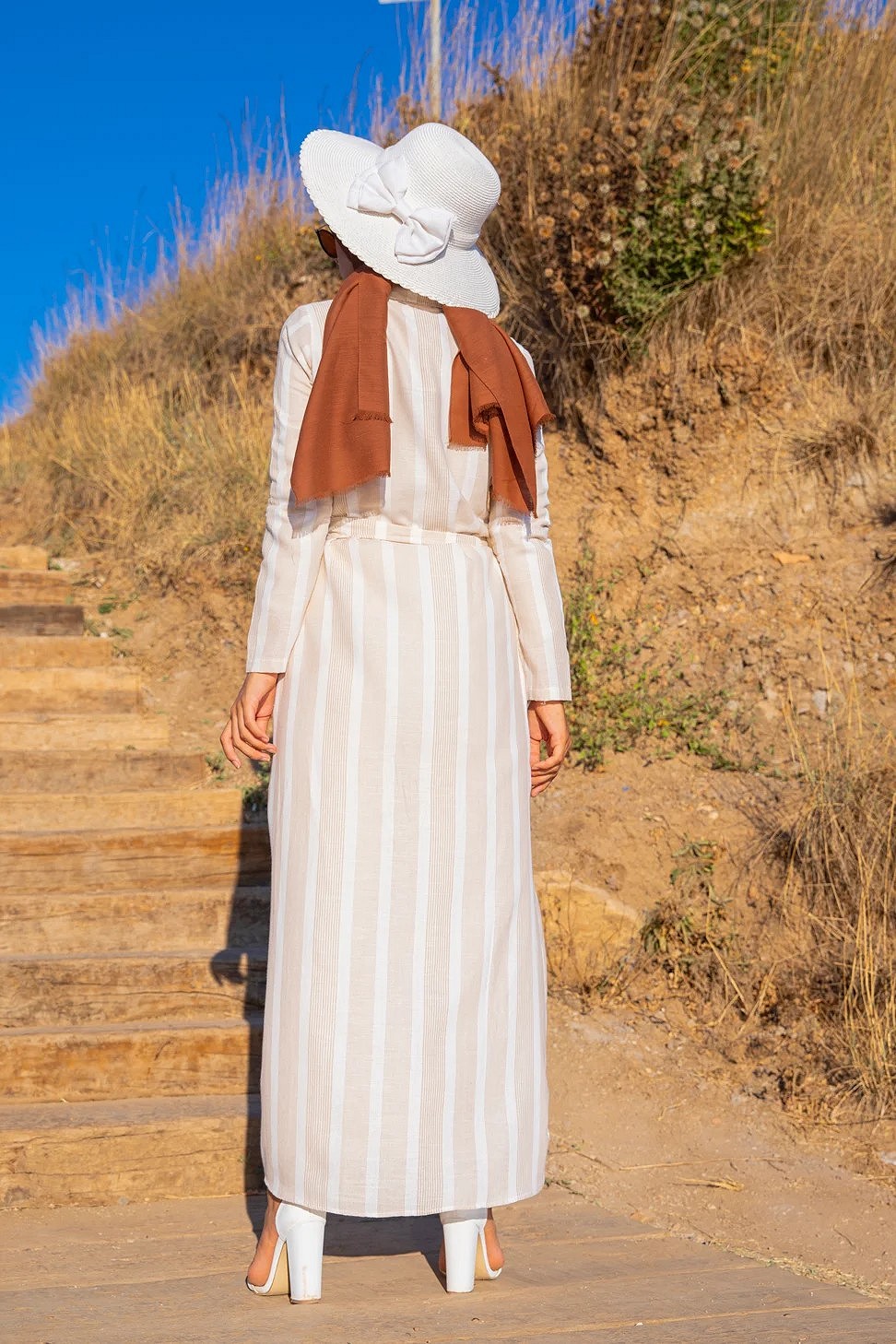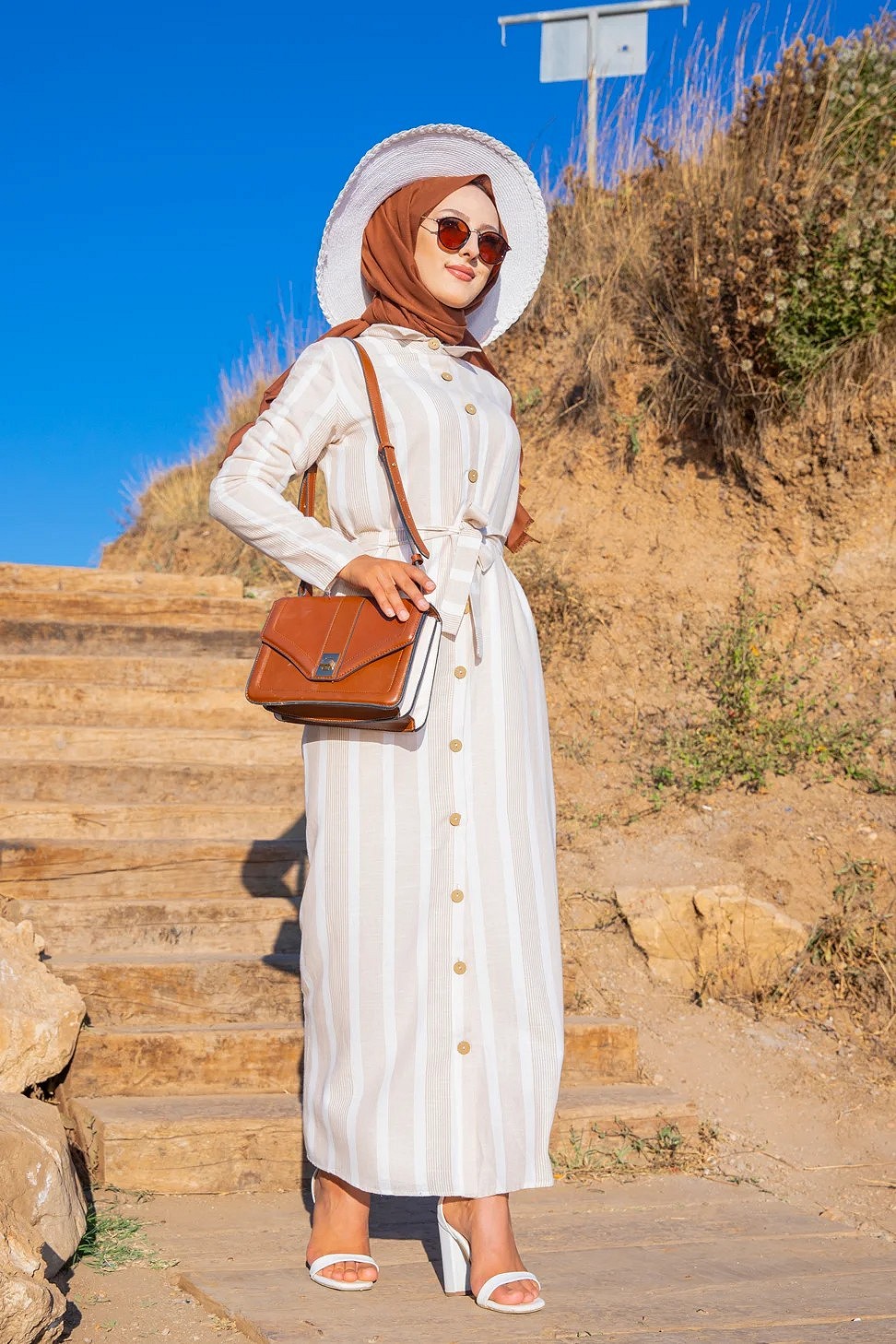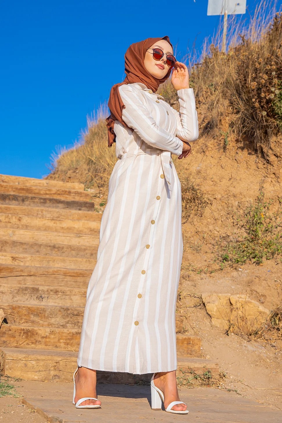 Robe chemise longue a rayures (Vetement hijab turque) - Couleur beige et blanc