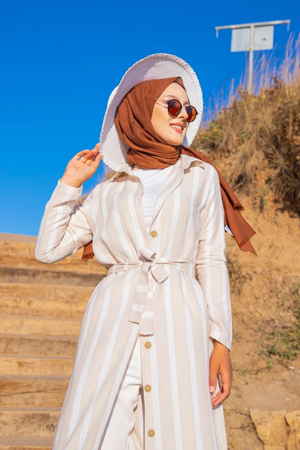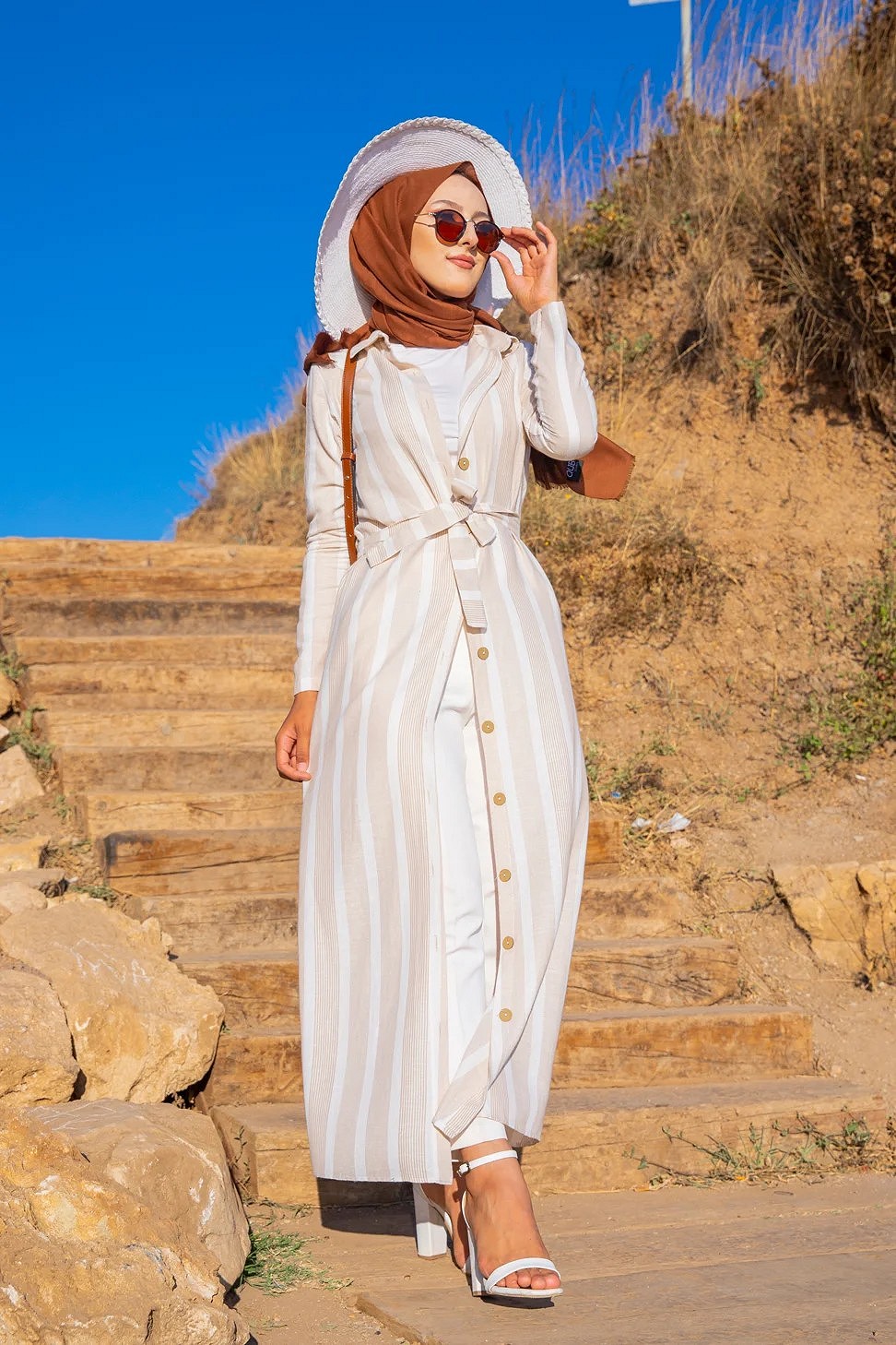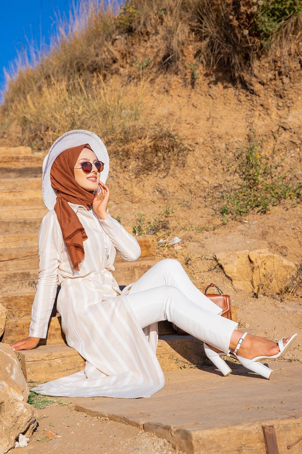 Robe chemise longue a rayures (Vetement hijab turque) - Couleur beige et blanc
