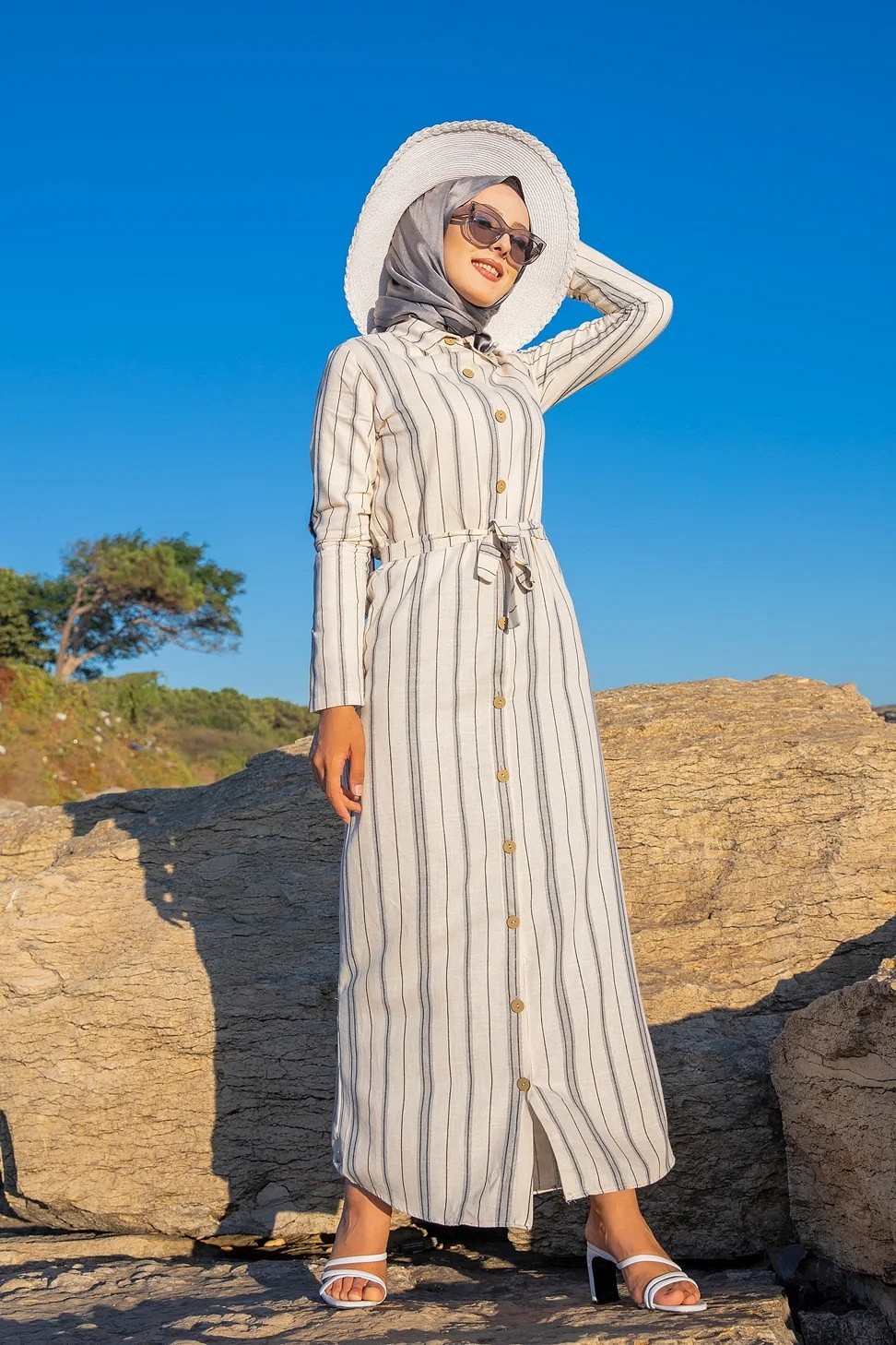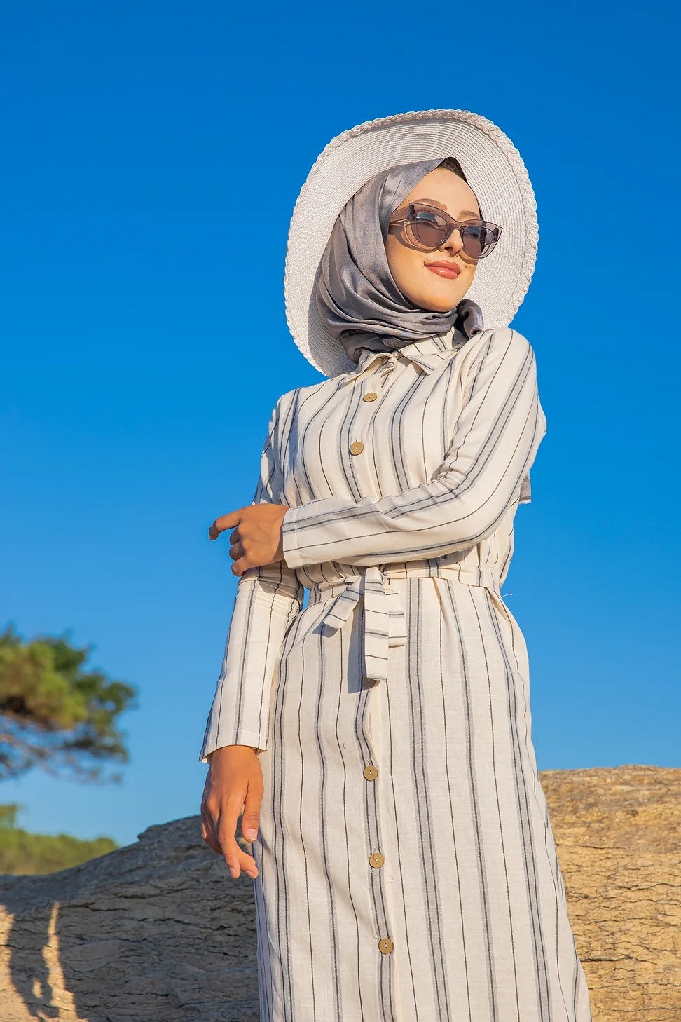 Robe chemise très longue à rayures (Hijab femme voilée chic) - Couleur Crème et gris Vetement & Accessoire