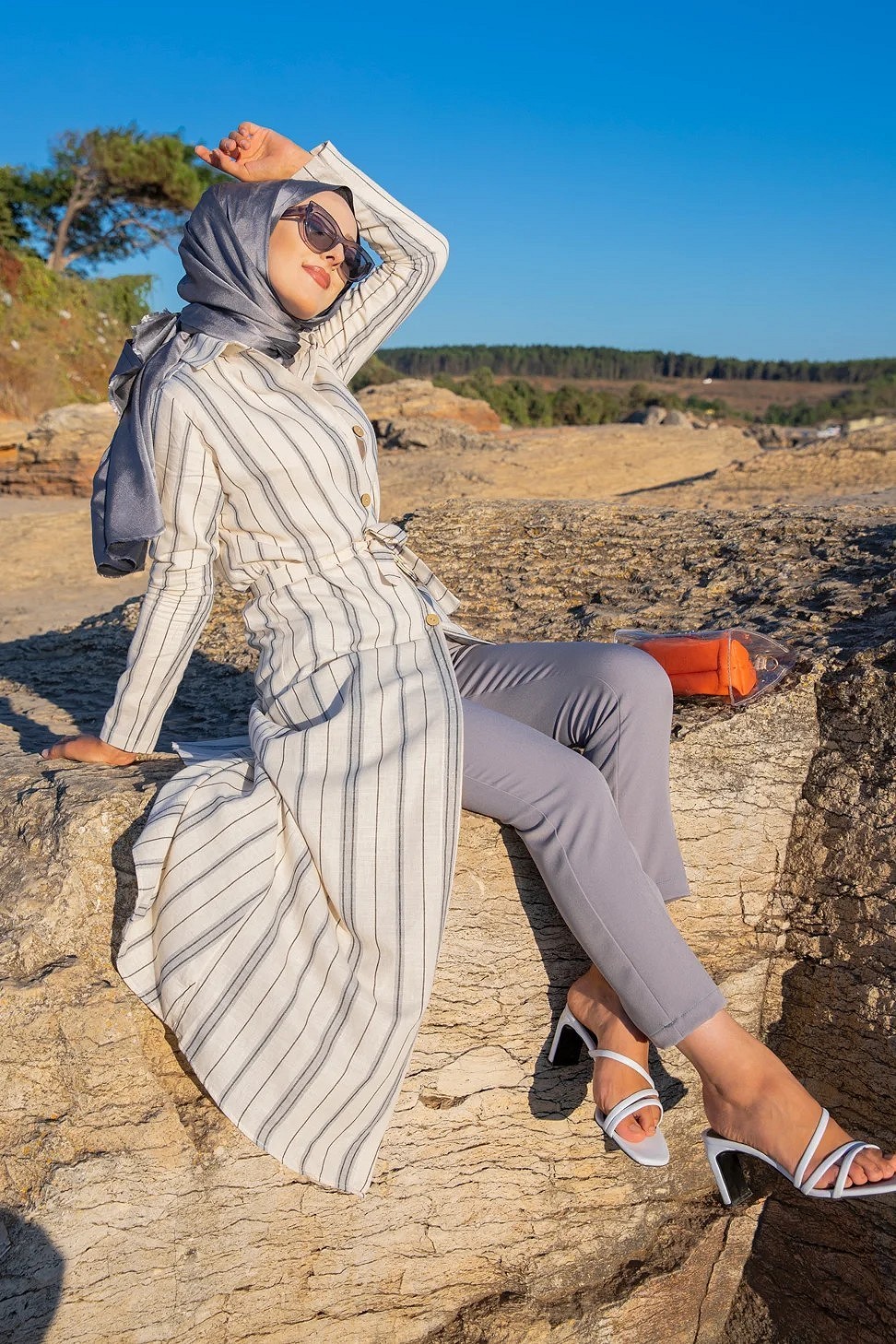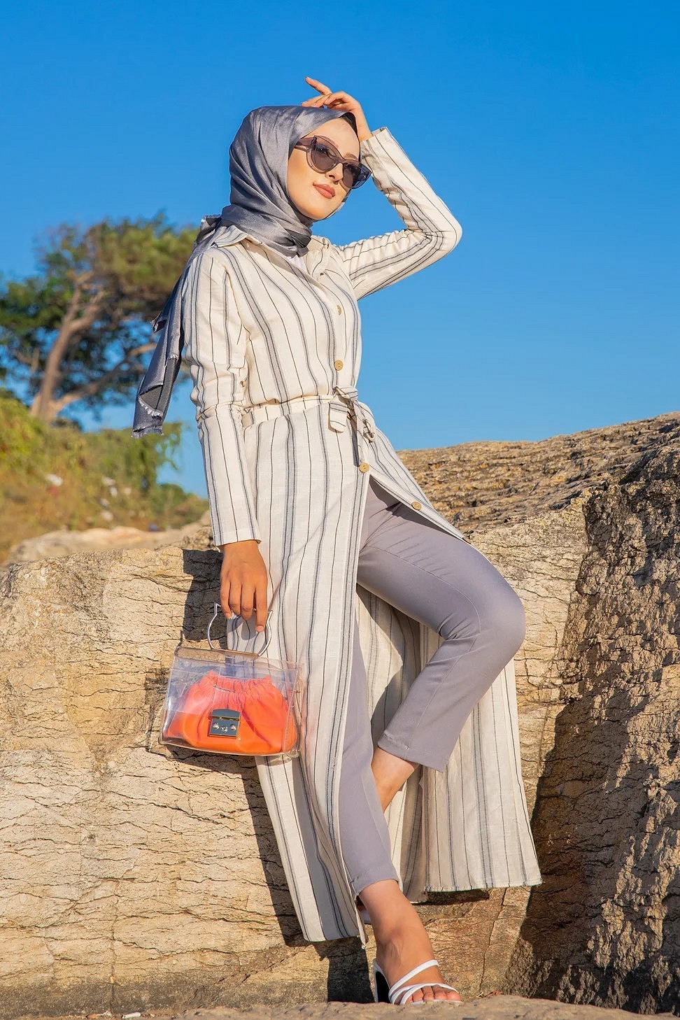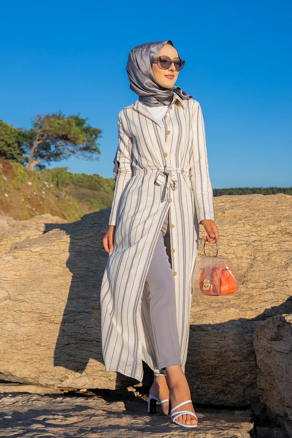 Robe chemise tres longue a rayures (Hijab femme voilee chic) - Couleur Creme et gris