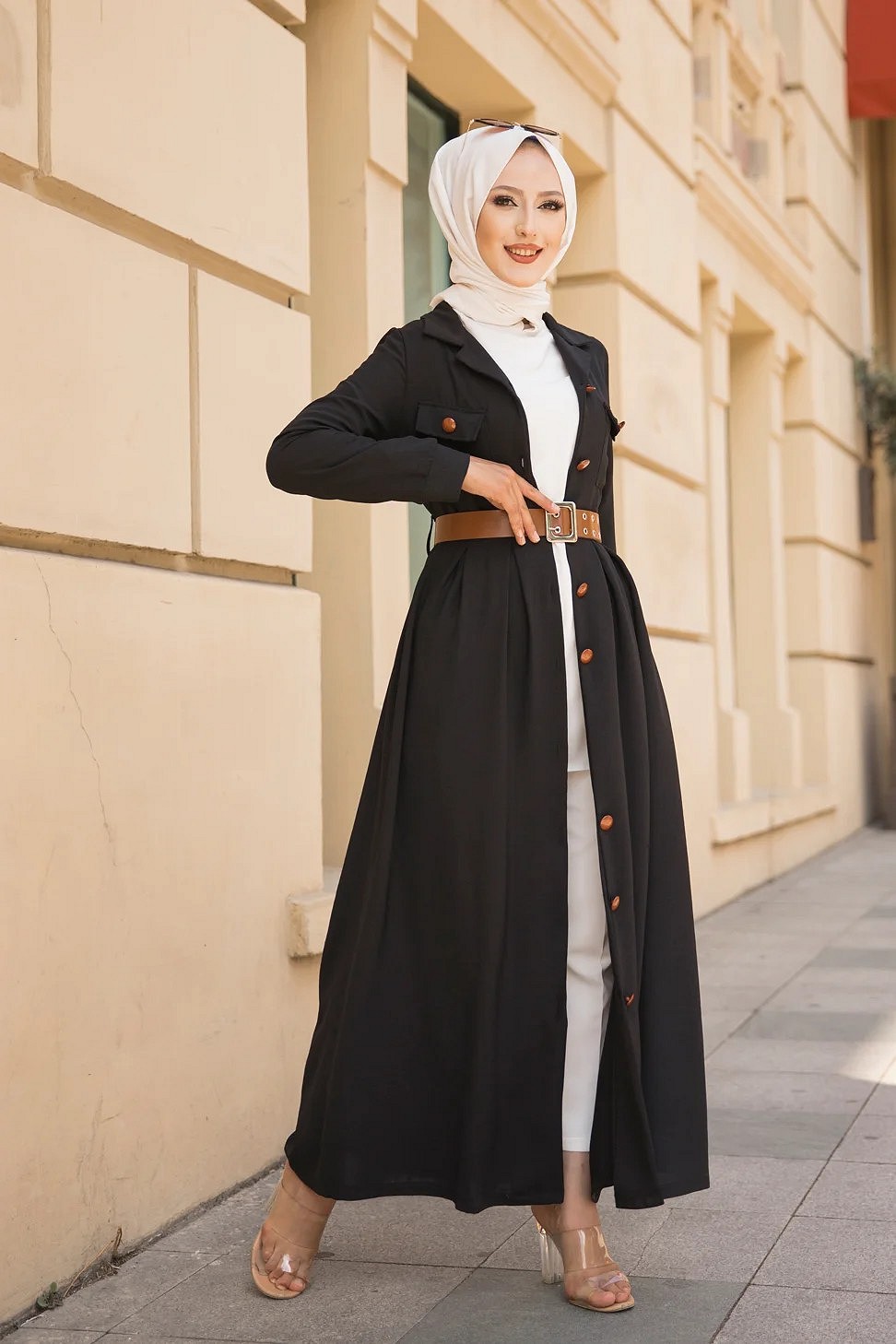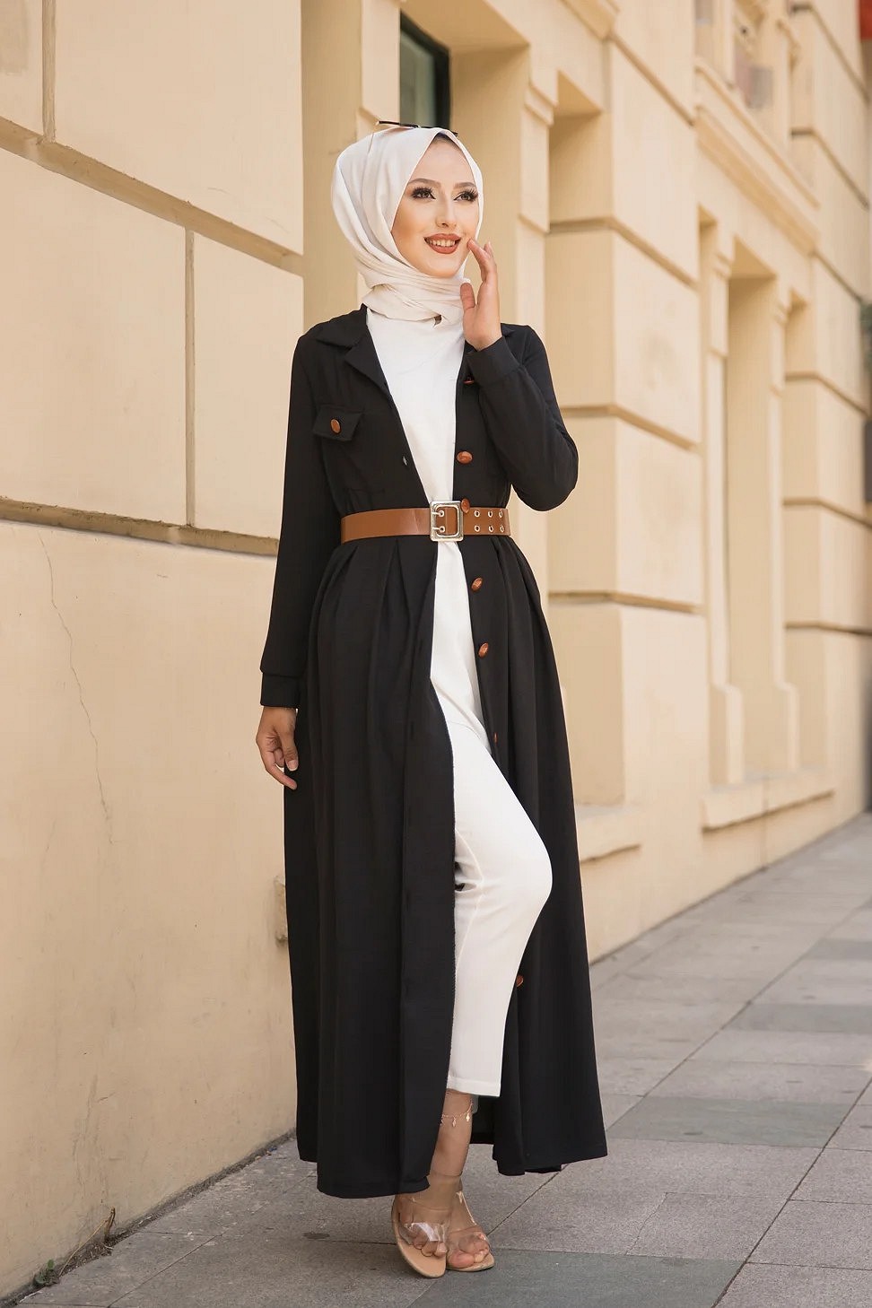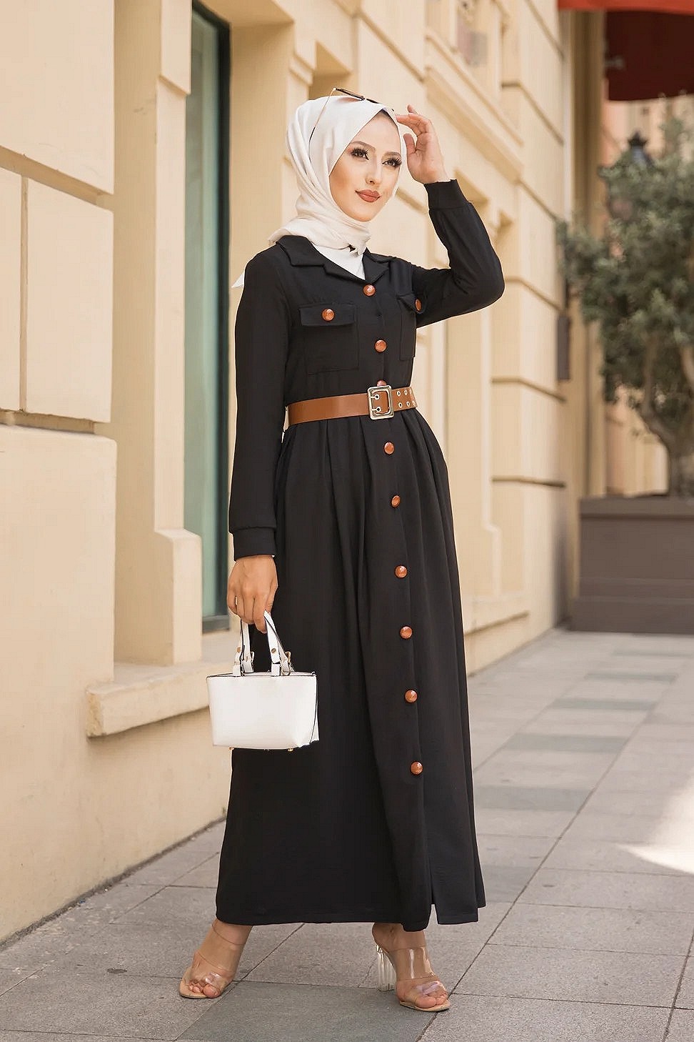 Robe longue casual boutonnee avec sa ceinture (Vetement hijab chic pour femme) - Couleur Noir