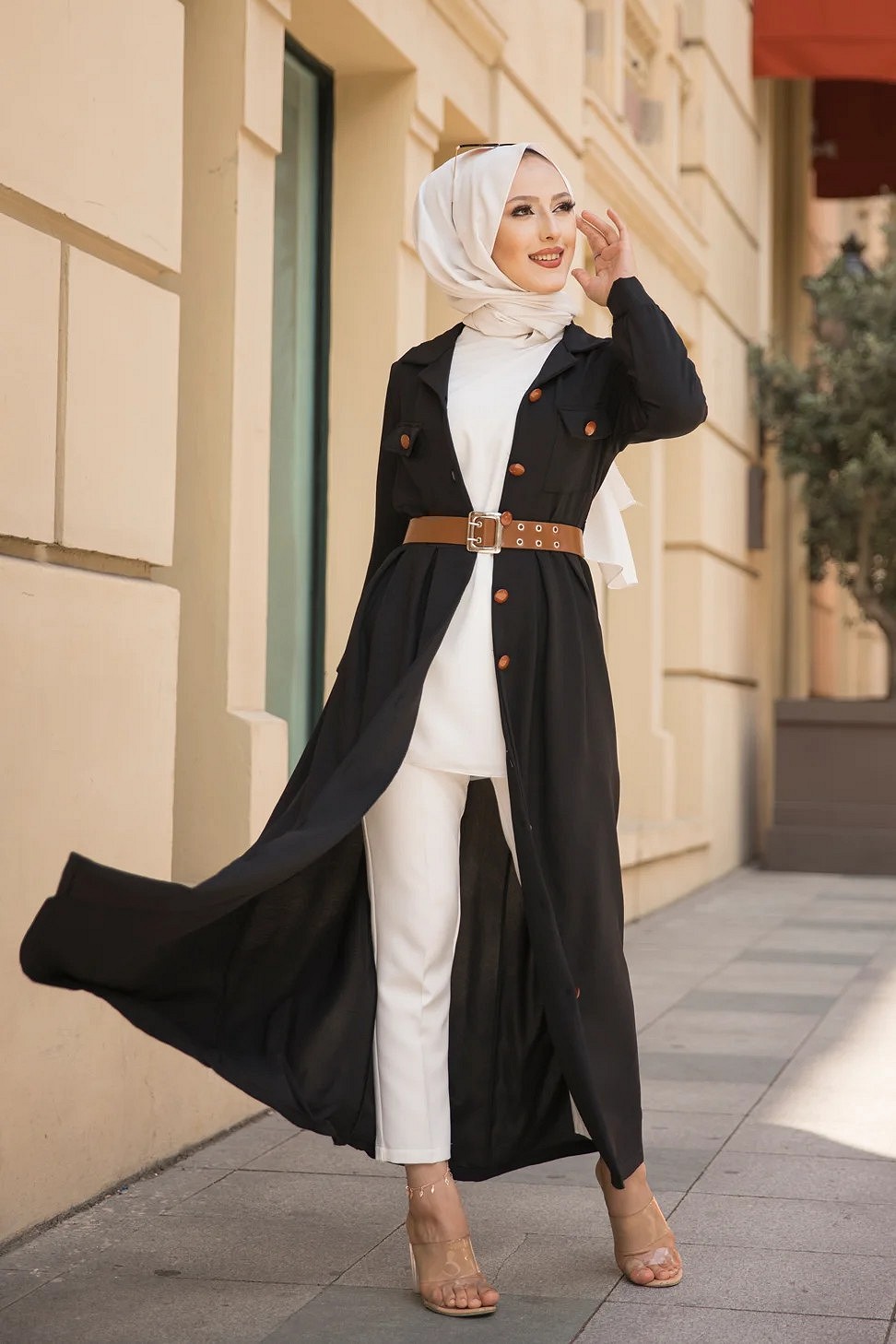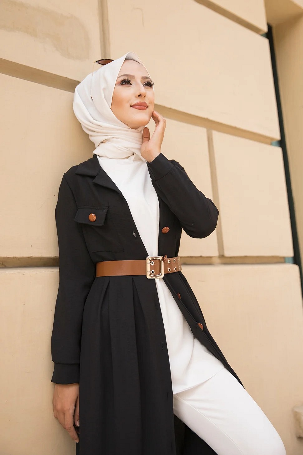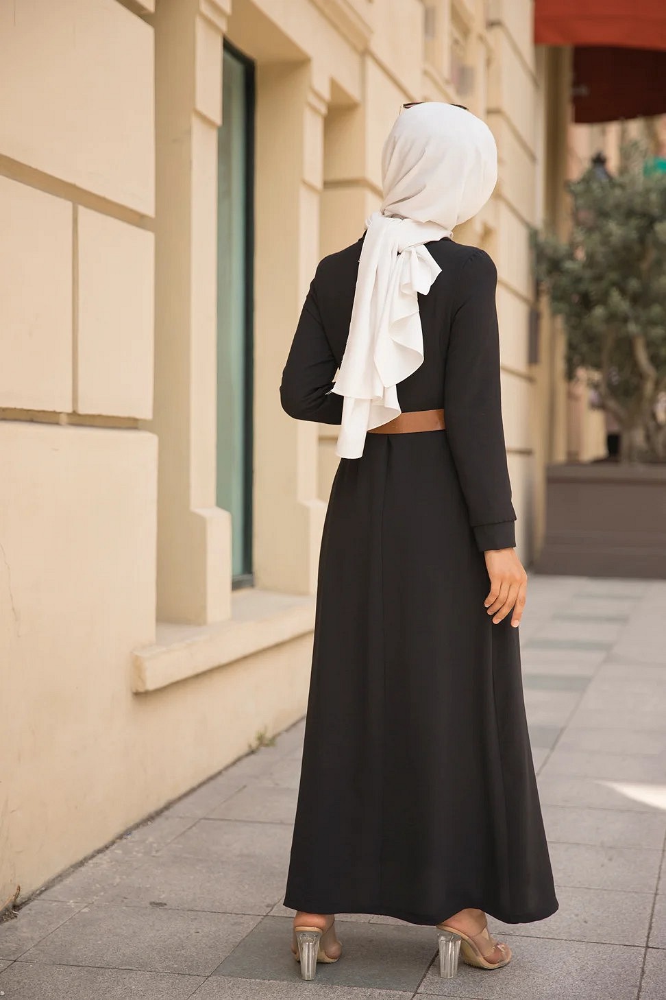 Robe longue casual boutonnee avec sa ceinture (Vetement hijab chic pour femme) - Couleur Noir