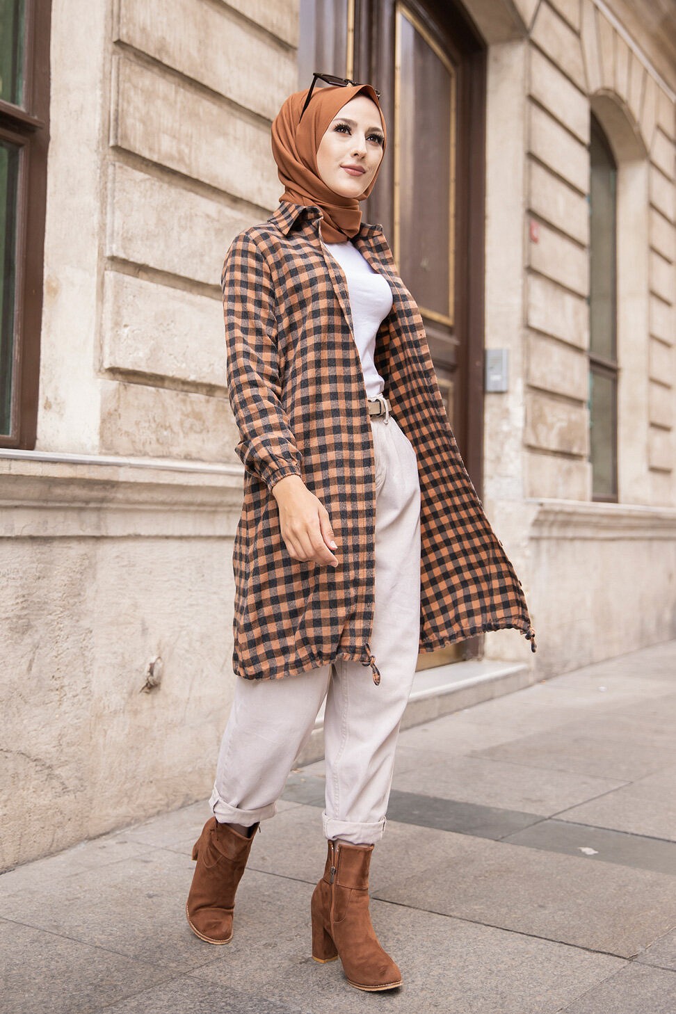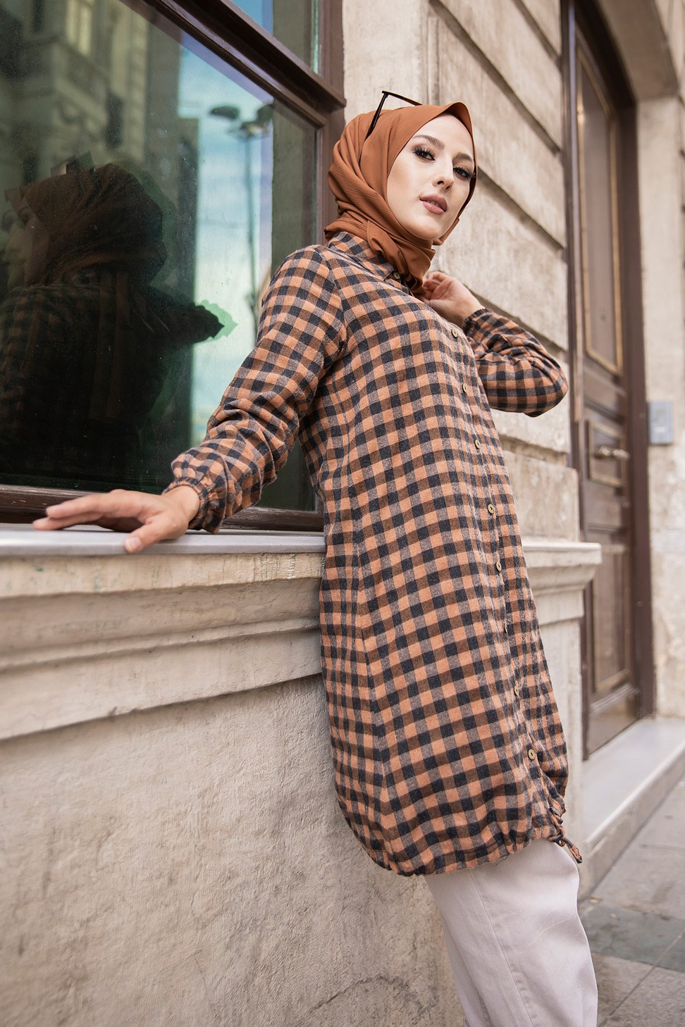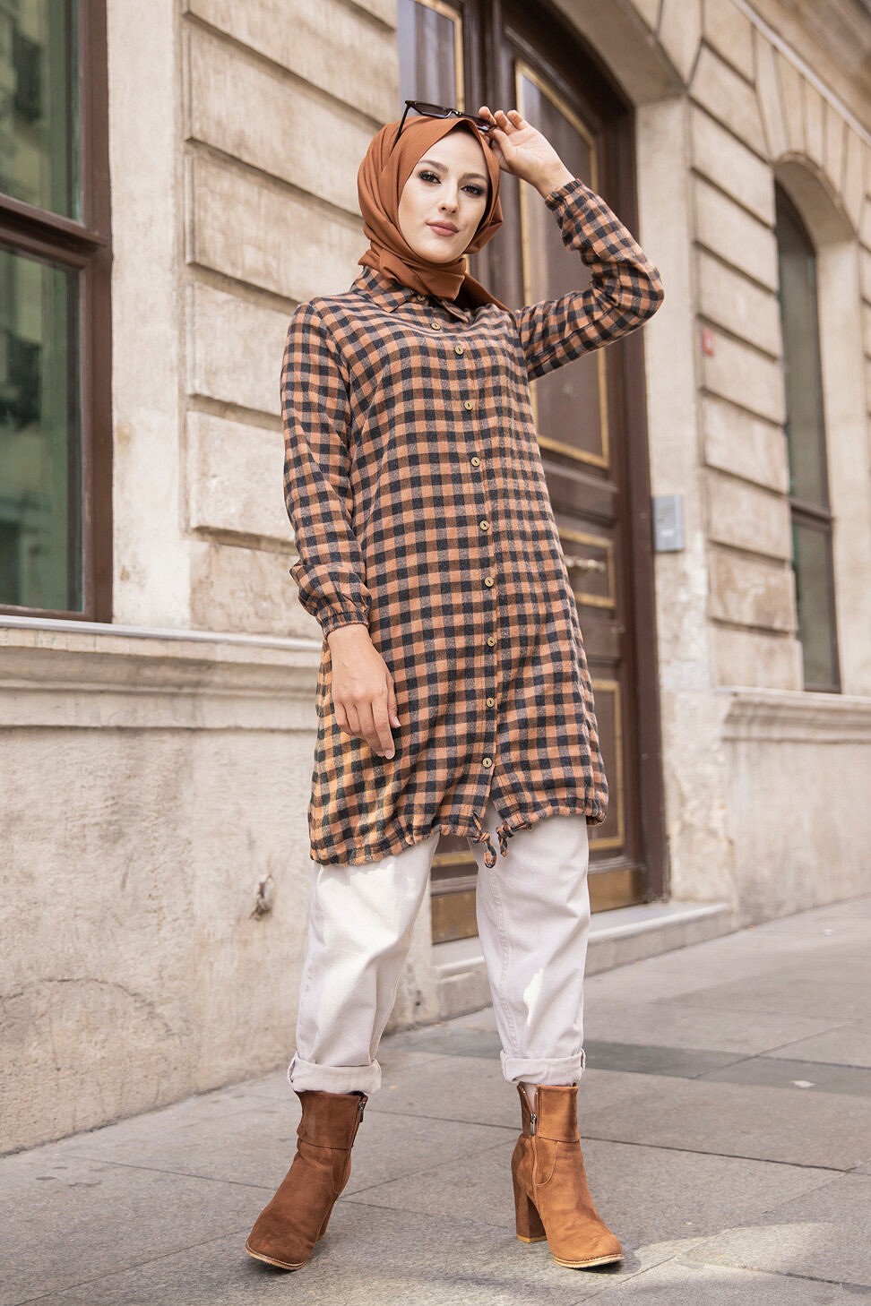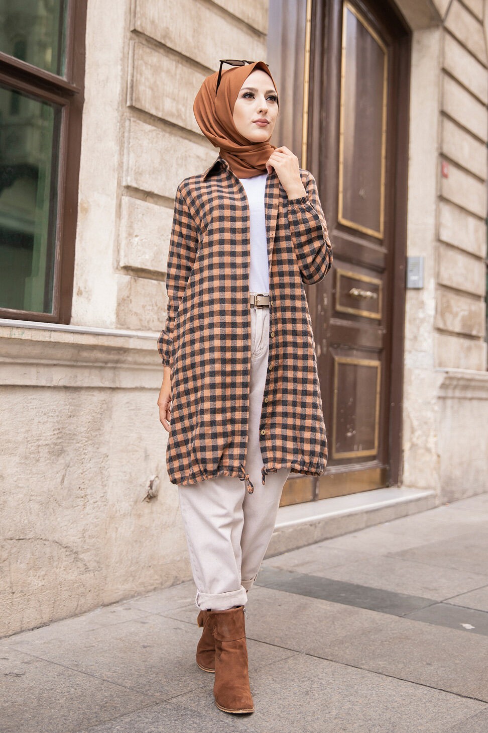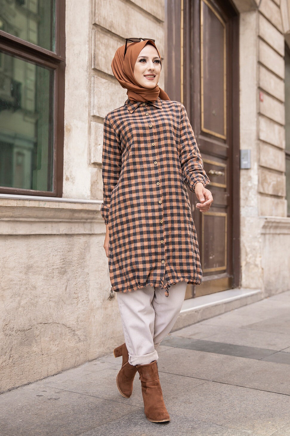 Tunique longue boutonnée à carreaux avec capuche (Vetement Turque pour femme voilée - Mode islamique) - REF. 38636 (25.00 €)