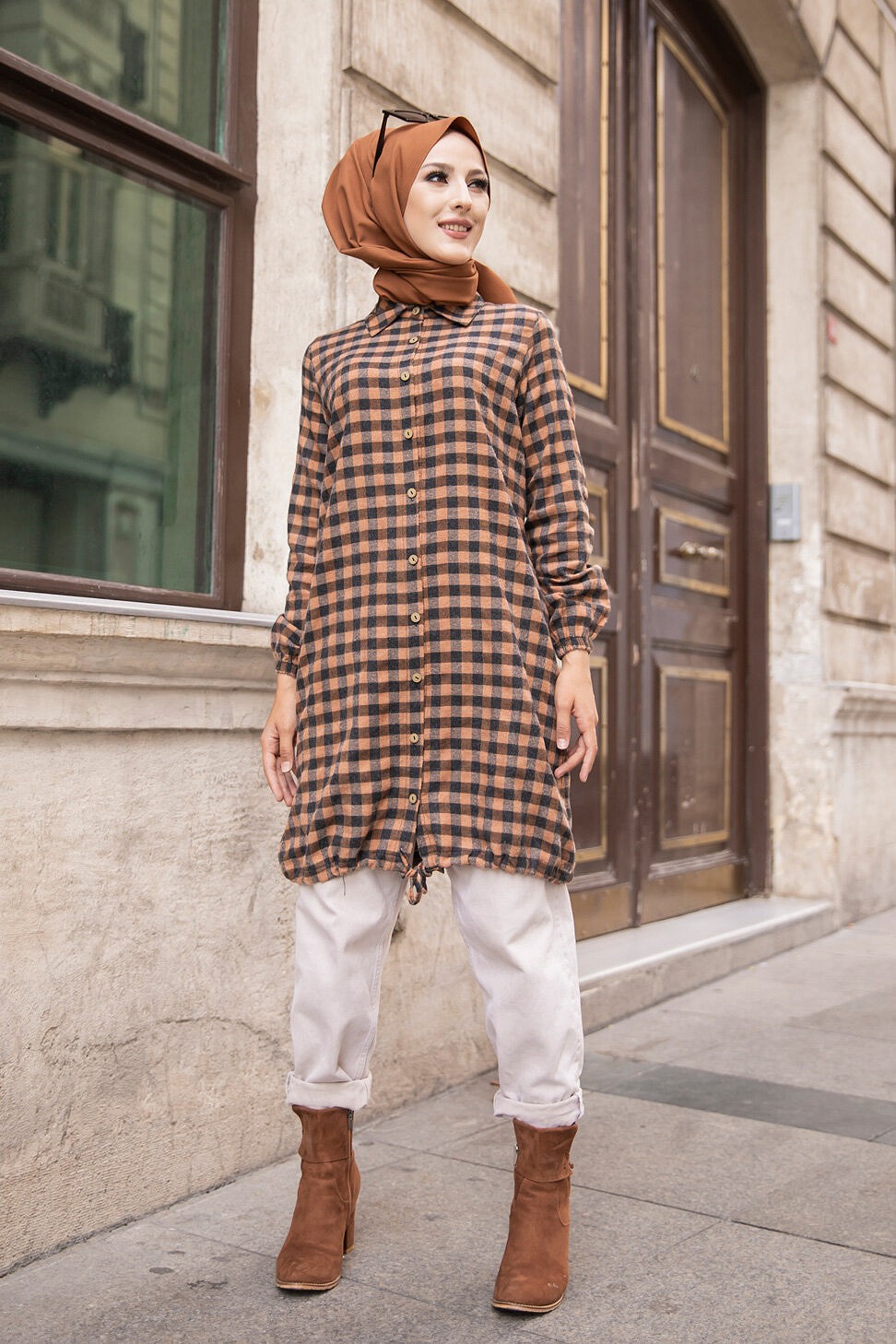 Surchemise-Tunique à carreaux pour femme (Vêtements Hijab - Saison Automne Hiver) - Couleur moutarde - REF. 35211 (26.90 €)