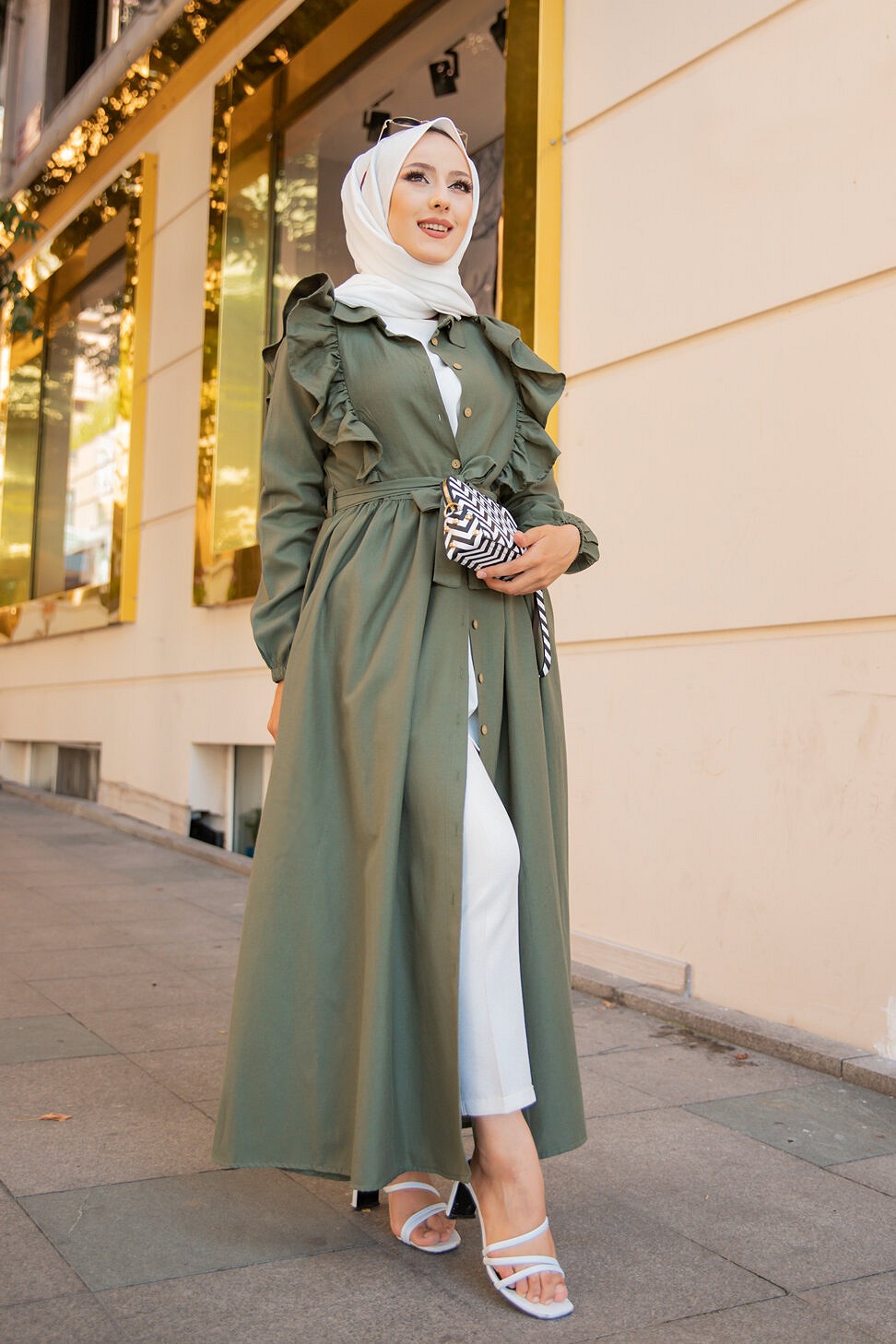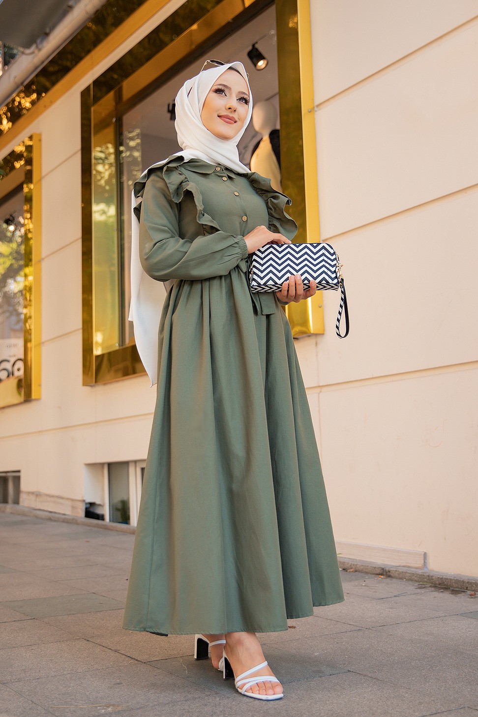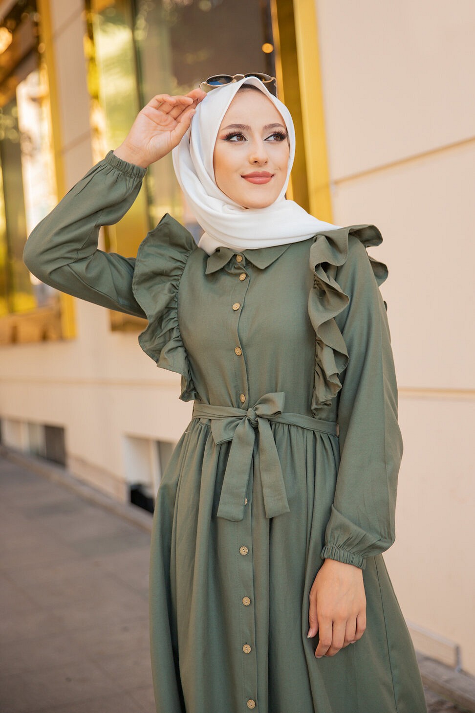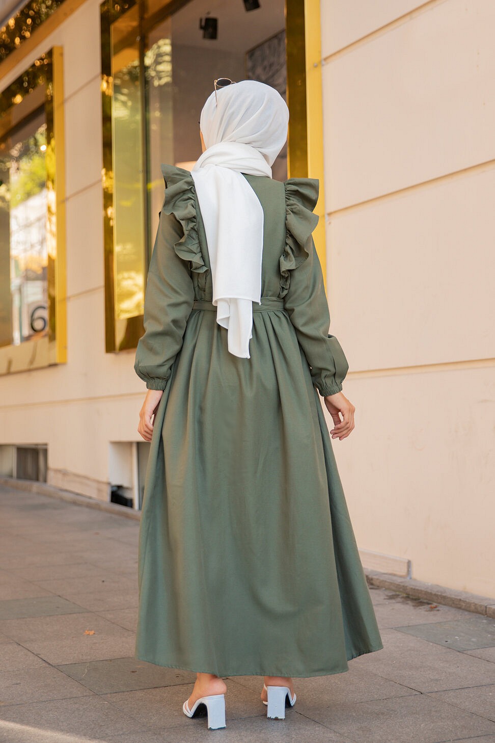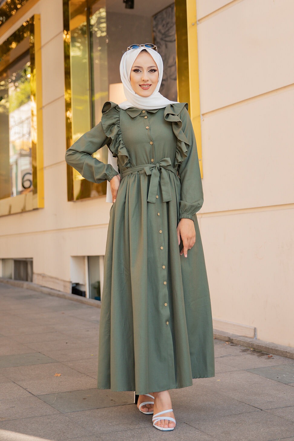 Robe longue boutonnee a froufrou (Tenue pour femme voilee) - Couleur vert Kaki