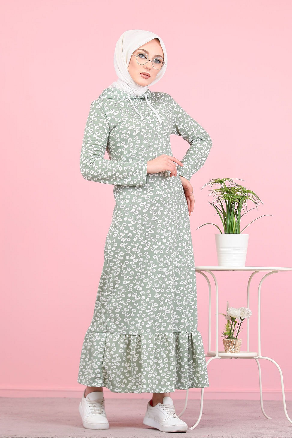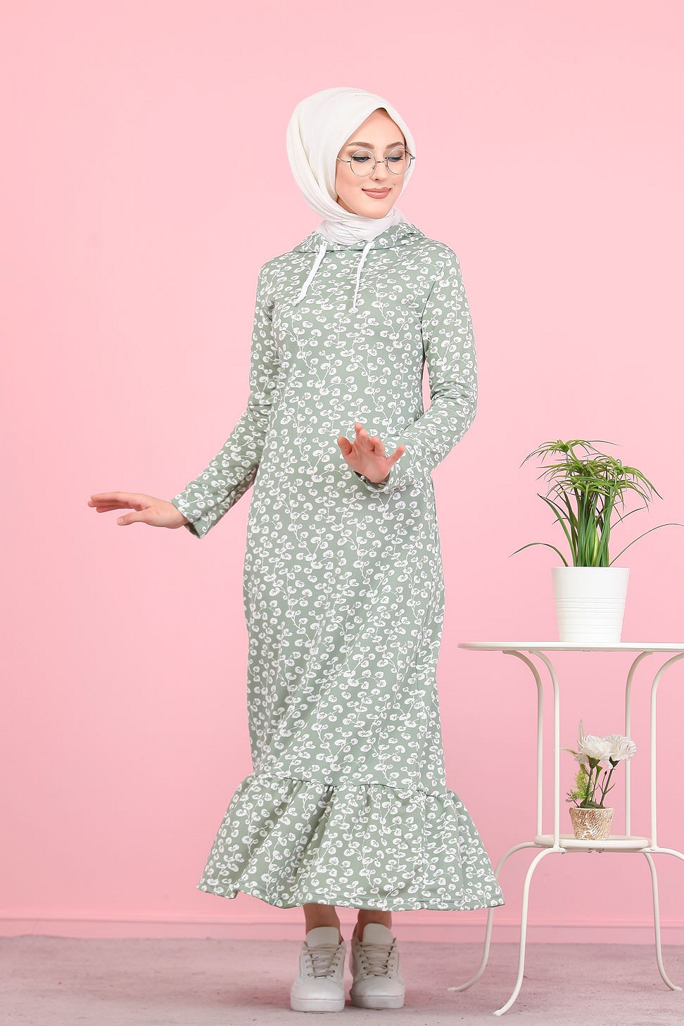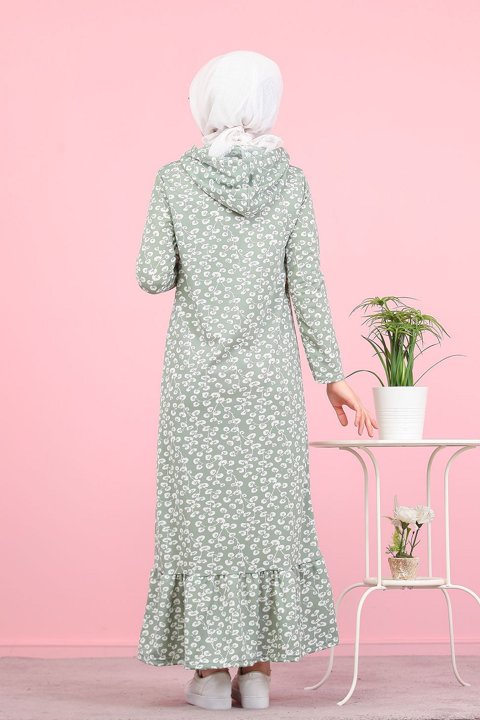 Robe longue à capuche finition volante à motifs feuilles nénuphar (Vetement pour femme voilée) - Couleur vert claire Vetement & Accessoire