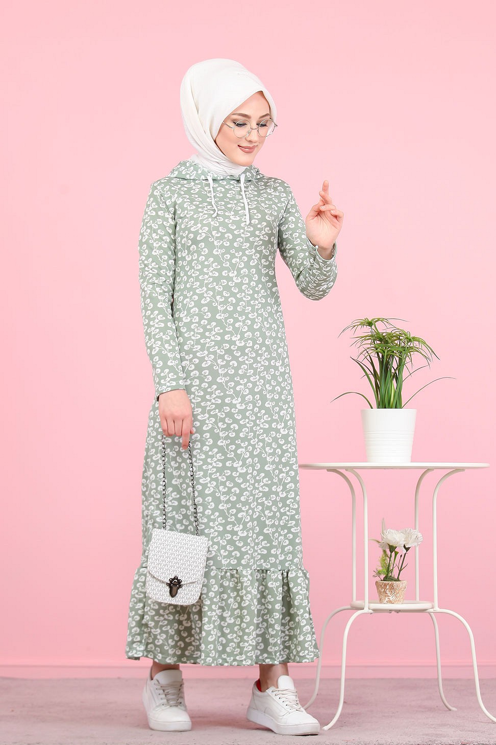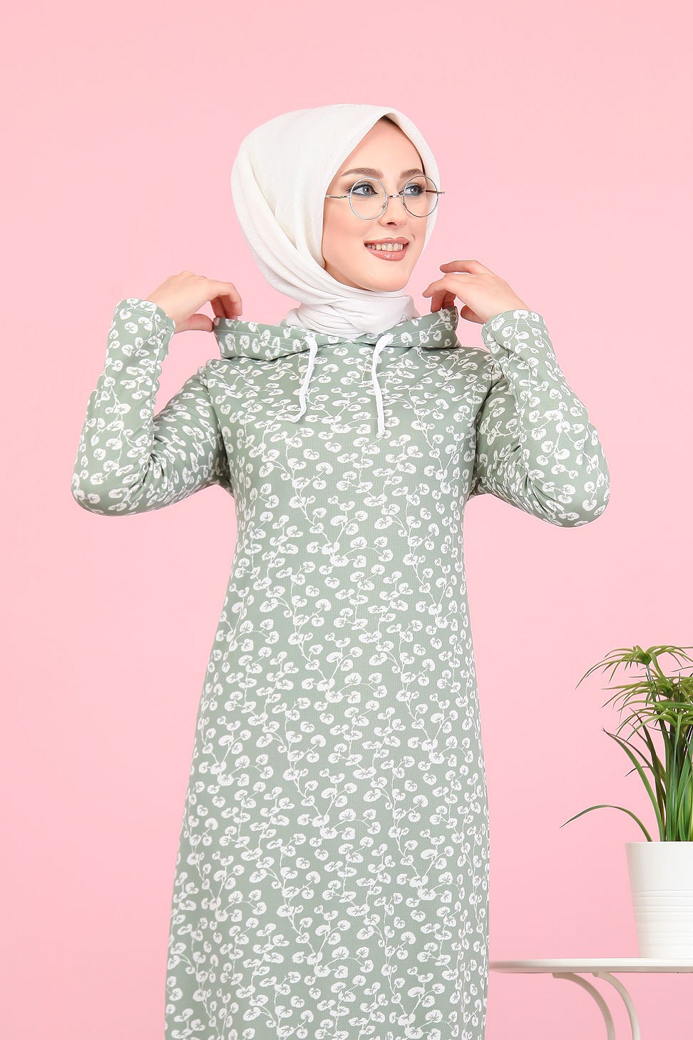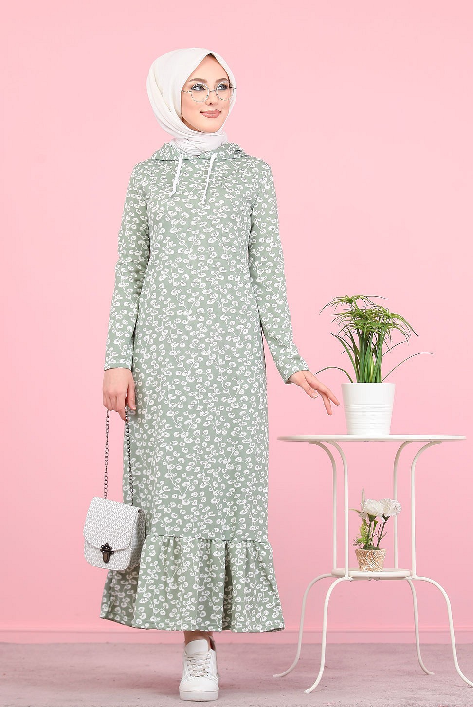 Robe longue à capuche finition volante à motifs feuilles nénuphar (Vetement pour femme voilée) - Couleur vert claire Vetement & Accessoire