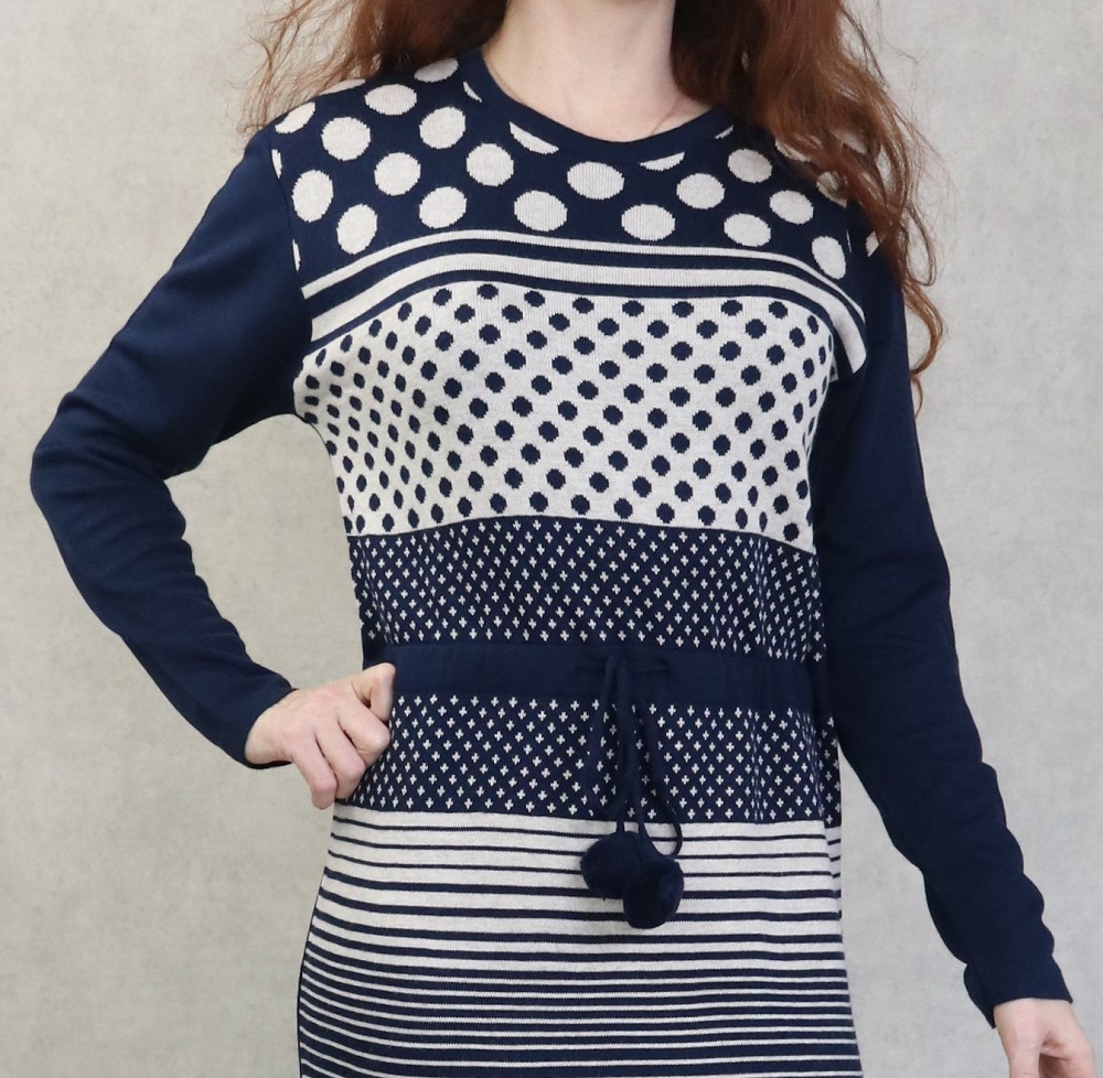 Robe maxi longue en maille fine et douce. Modèle avec plusieurs motifs sur toute la longueur. Encolure ronde. Ceinture intérieur à pompon à nouer. Petites fentes latérales en bas de la robe. Non doublée.