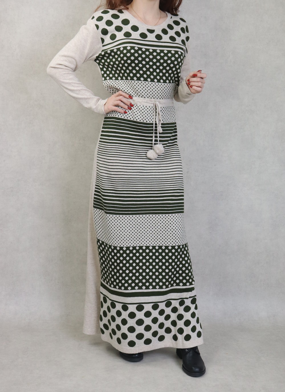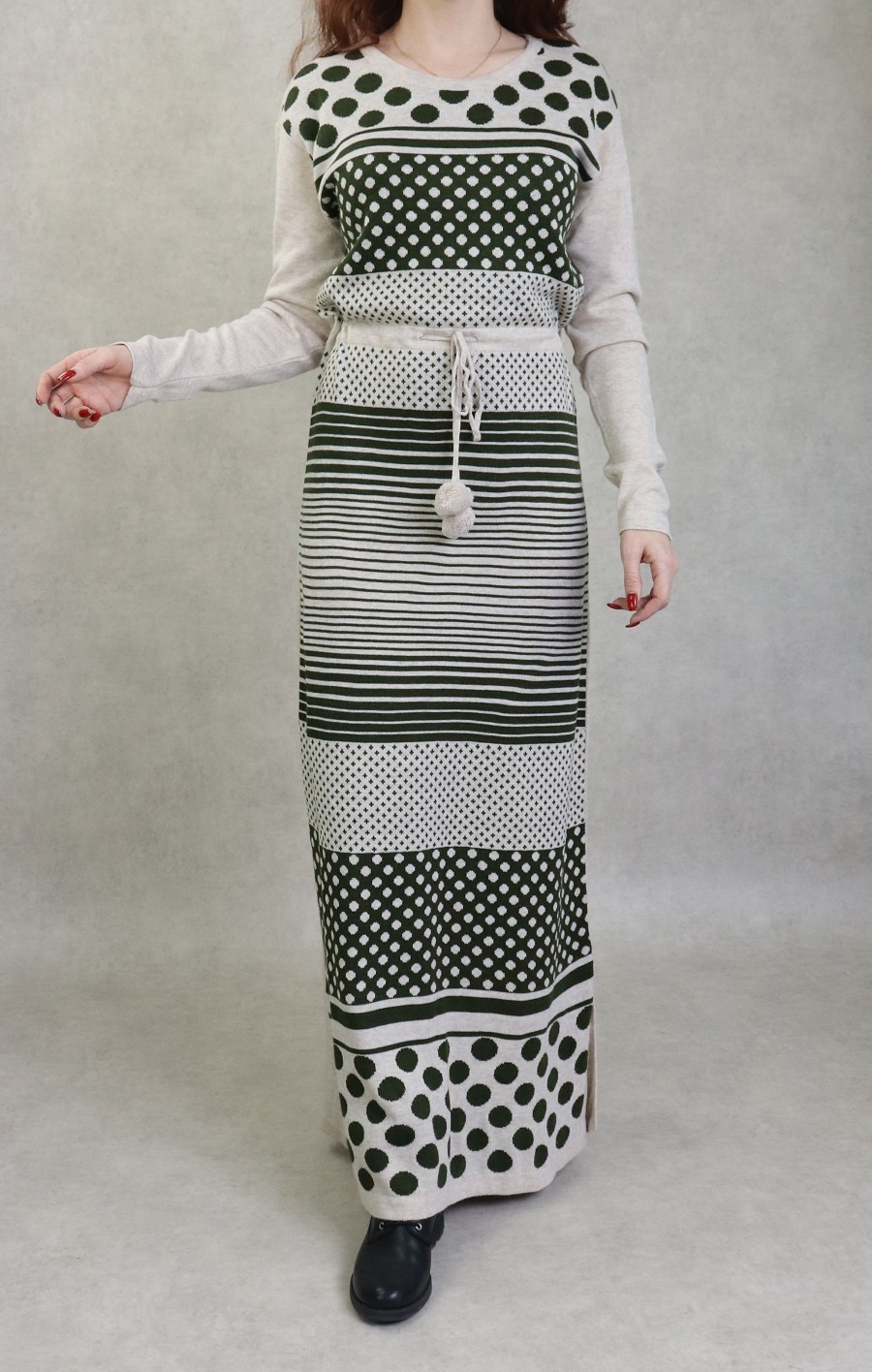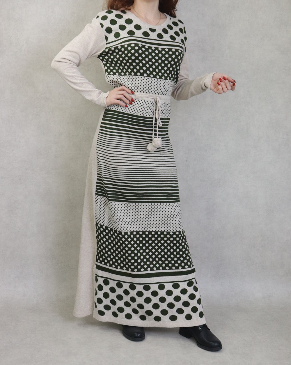 Robe maxi-longue en maille a motifs bicolore pour femme (Mode Automne-Hiver) - Couleur Vert kaki et beige