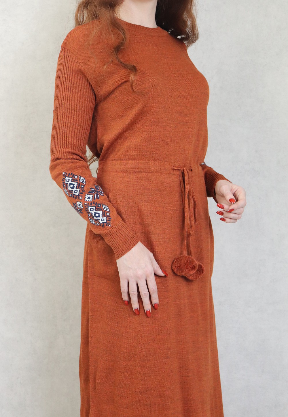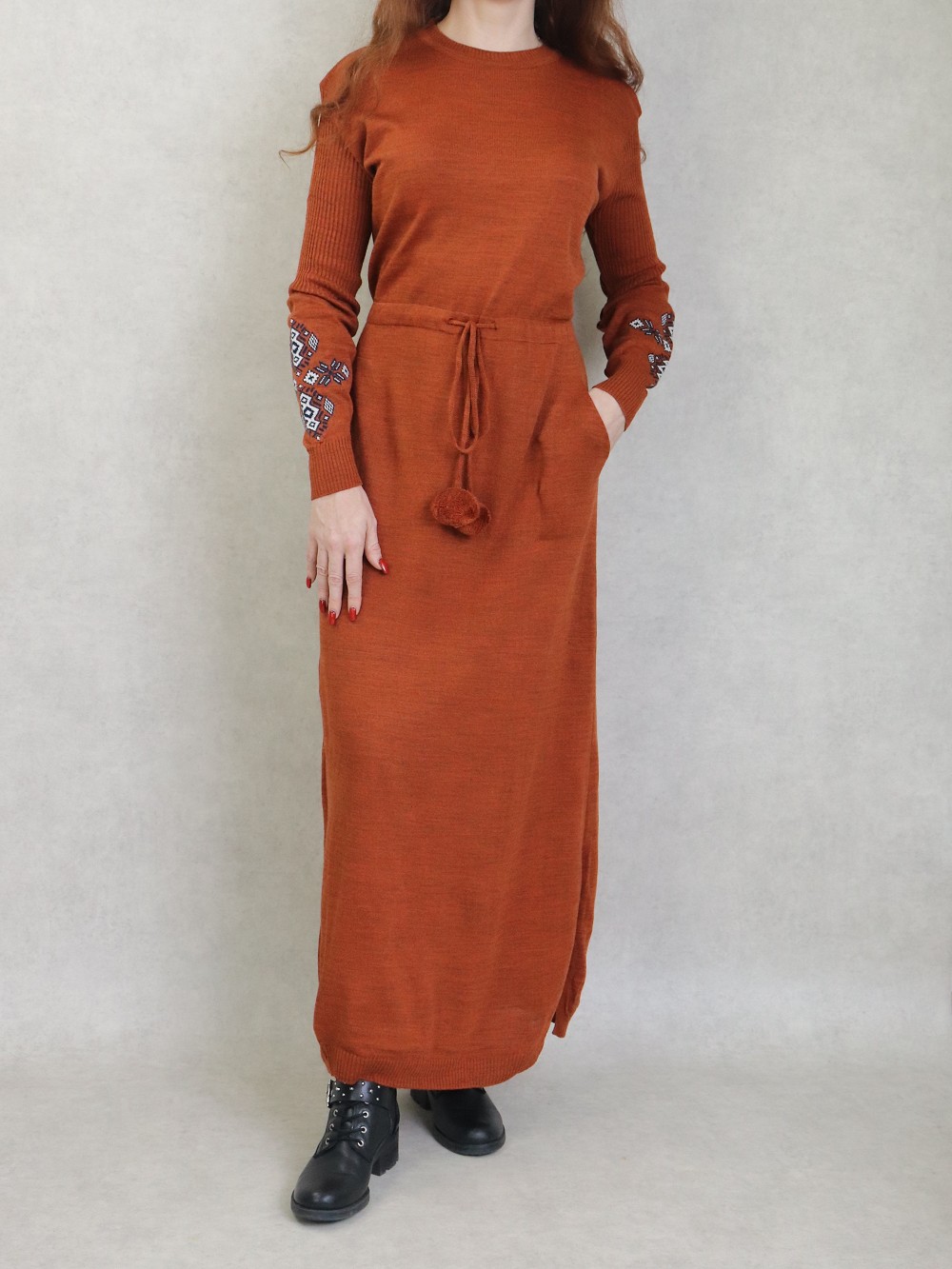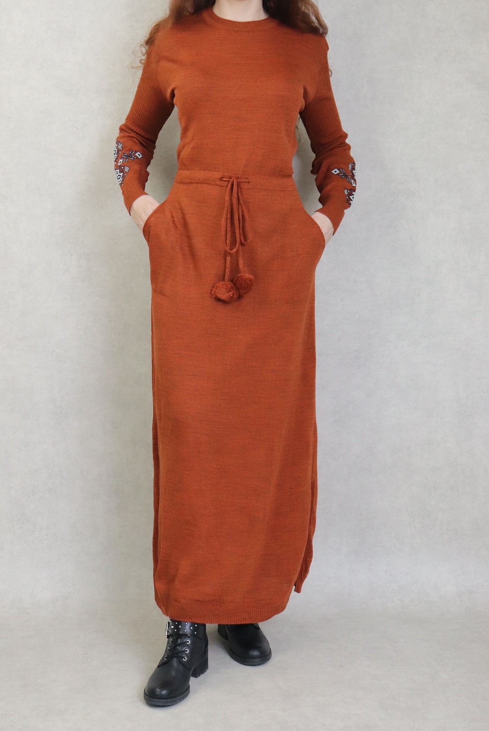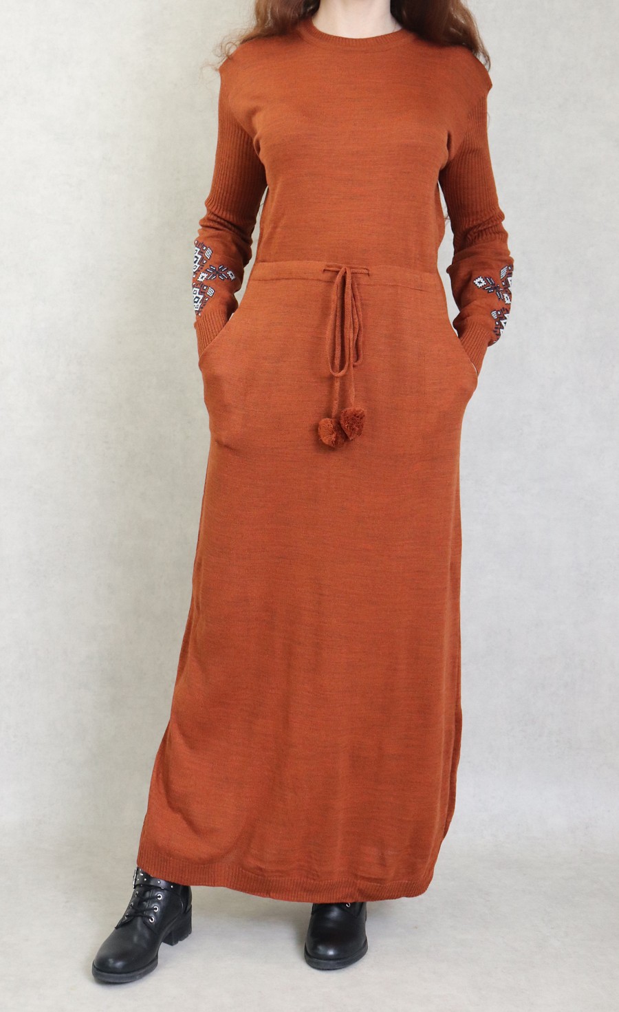 Robe originale, elle mettra en valeur votre côté chic et féminin. Encolure rond. Manches longues avec motif brodé sur l'avant bras. Découpe taille avec un lien de serrage. Poches italiennes. Facile à vivre, douce sur la peau et bien souple, la robe pull en côtes.