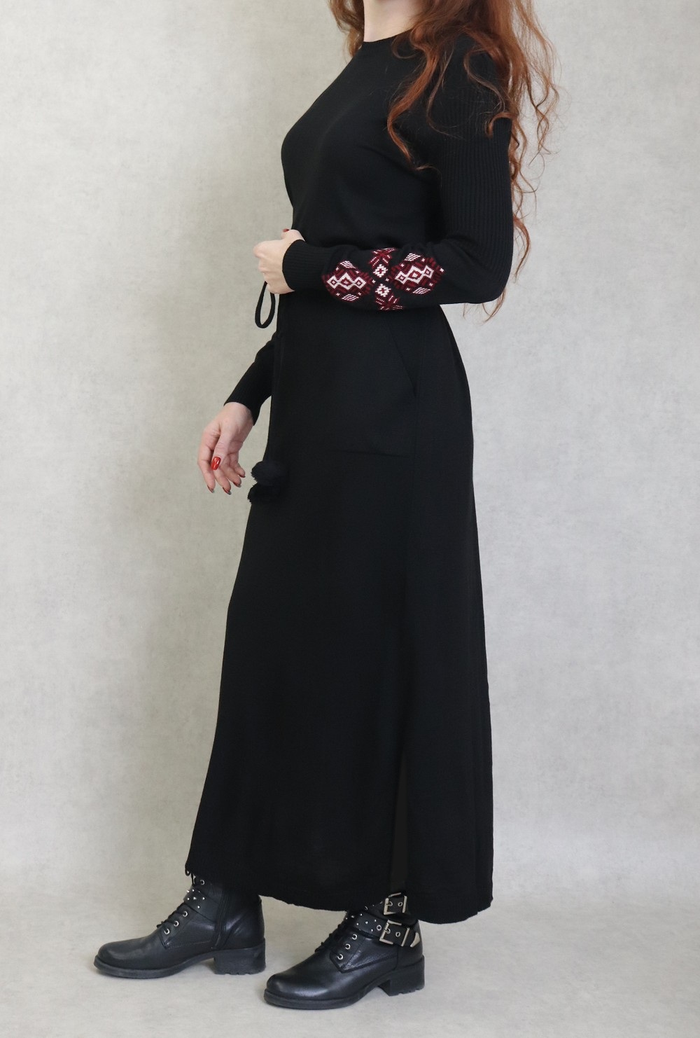 Robe originale, elle mettra en valeur votre côté chic et féminin. Encolure rond. Manches longues avec motif brodé sur l'avant bras. Découpe taille avec un lien de serrage. Poches italiennes. Facile à vivre, douce sur la peau et bien souple, la robe pull en côtes.