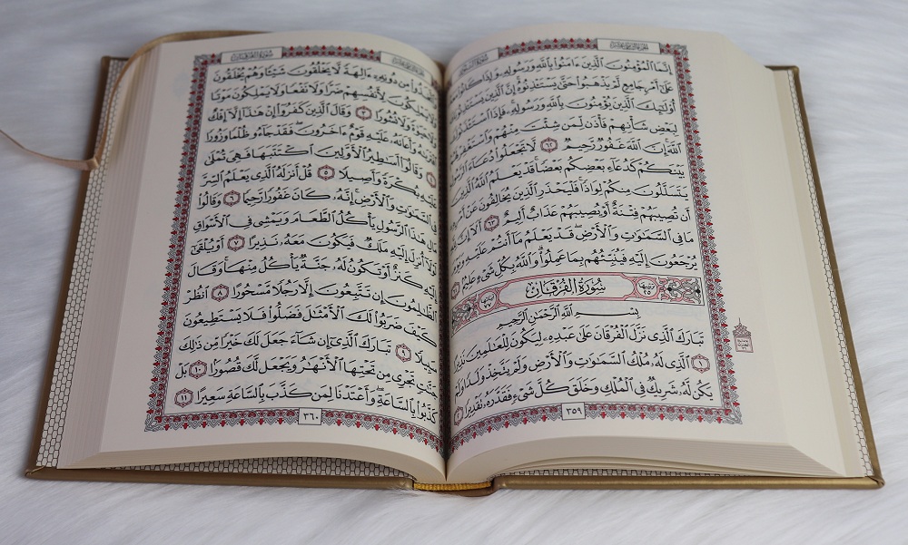 Très beau Coran, en langue arabe uniquement, selon l'école de récitation "Hafs" (رواية حفص), couverture en similicuir de luxe avec décorations dorées, papier de qualité supérieur (chamois) et impression en noir + une seconde couleur, doté d'un ruban marque page. Existe en plusieurs autres couleurs de couverture.