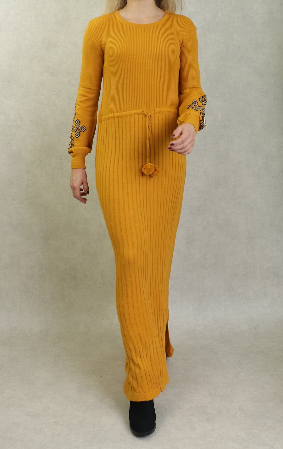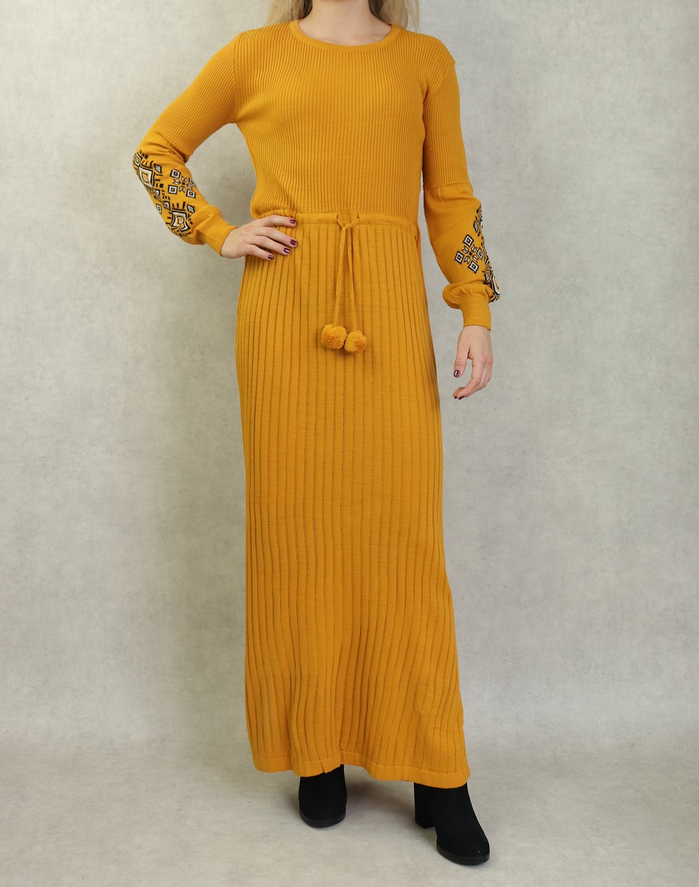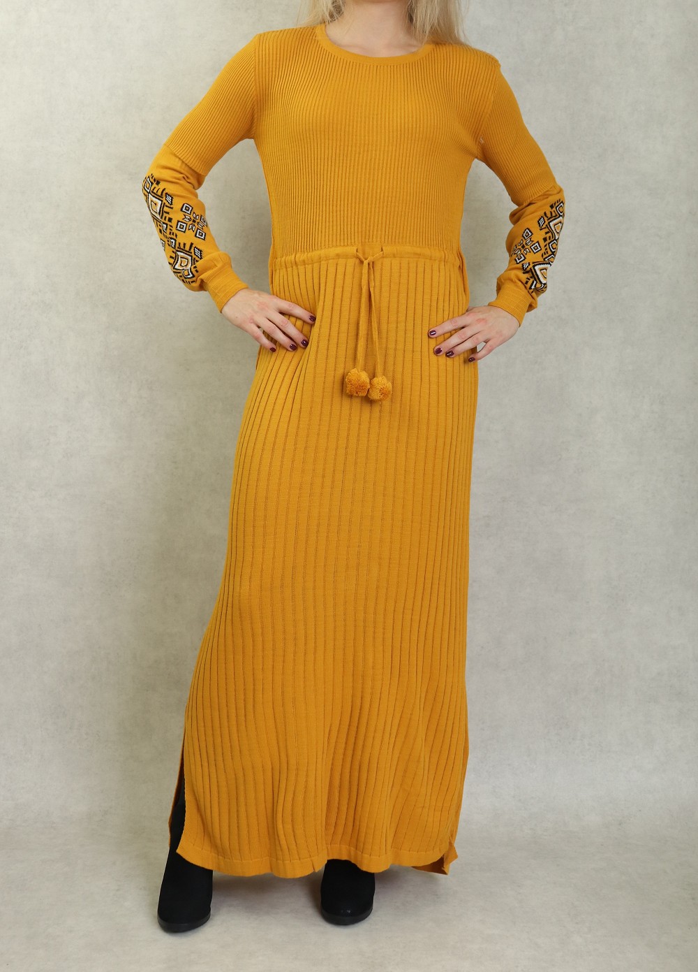 Robe longue en maille fine manche longue pour femme (Saison Automne - Hiver) - Couleur Jaune moutarde