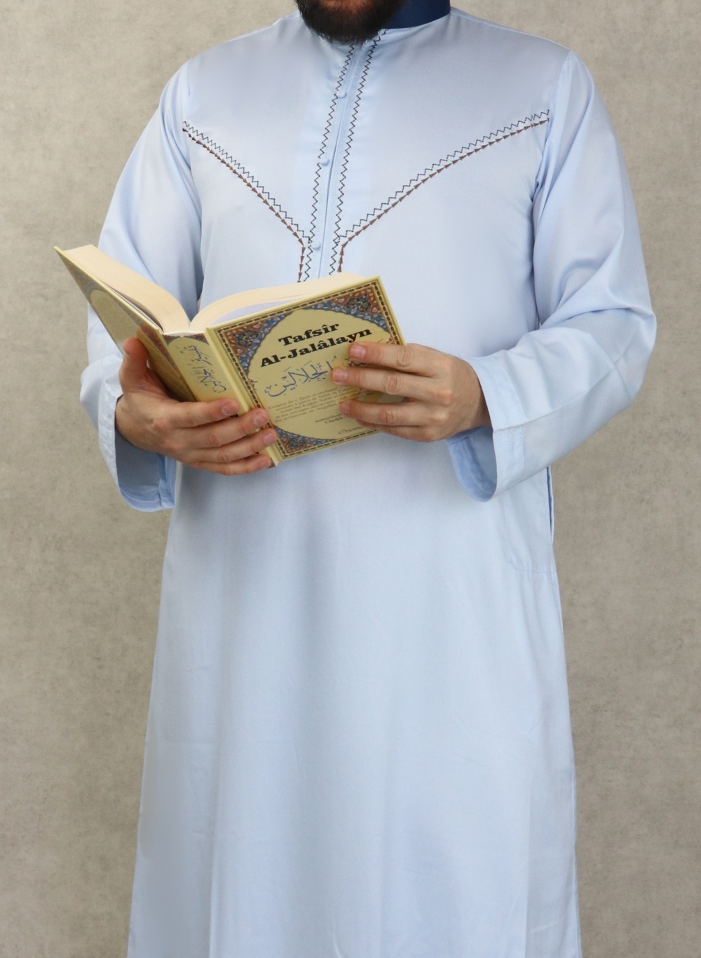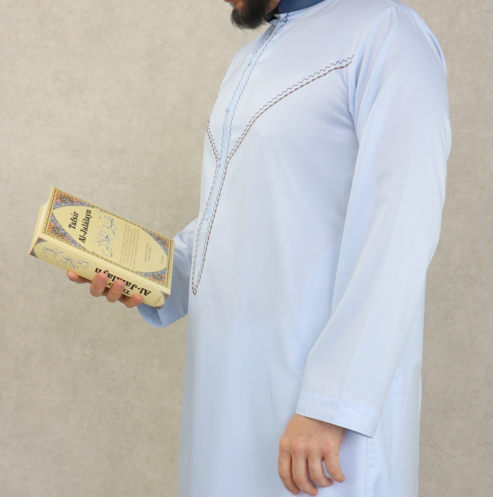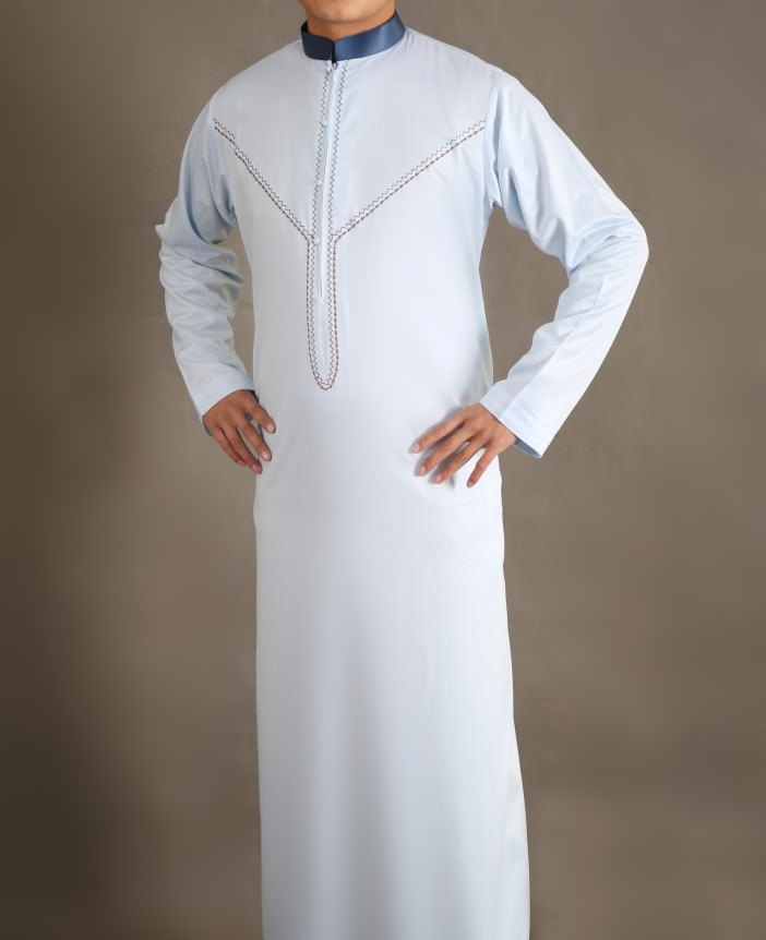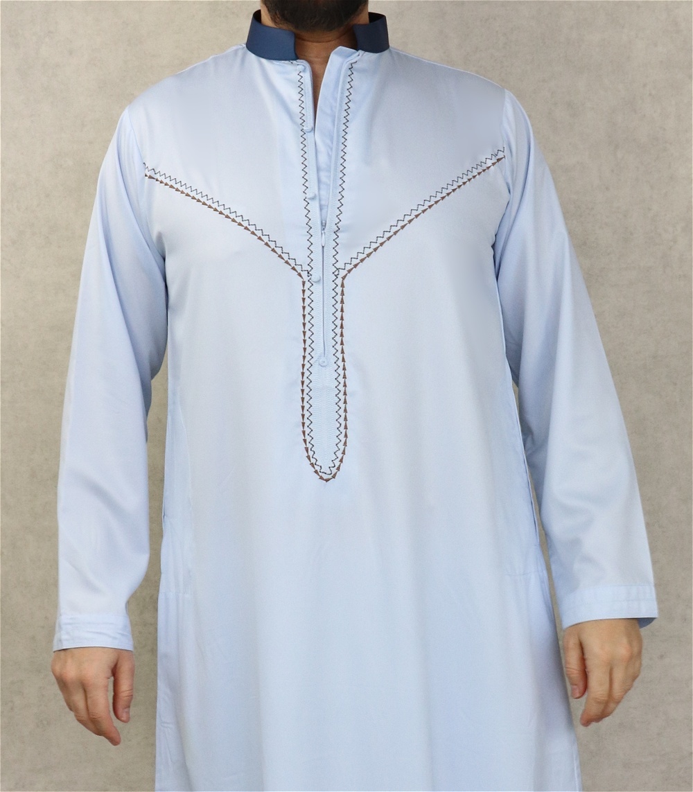 Qamis long, manches longues, ouverture zip cachée au niveau de la poitrine. Décoration sous forme de faux boutons. Col de couleur bleu marine. Tissu fluide et très agréable de qualité supérieure, légèrement satiné, toutes saisons.