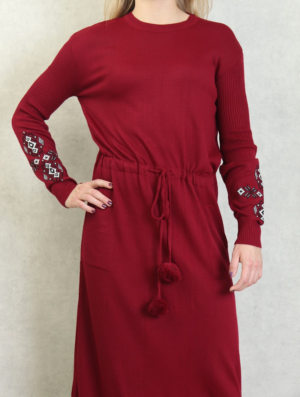Robe originale, elle mettra en valeur votre côté chic et féminin. Encolure rond. Manches longues avec motif sur l'avant bras. Découpe taille avec un lien de serrage (ceinture intégrée avec pompons). Poches italiennes. Facile à vivre, douce sur la peau et bien souple, la robe pull en côtes.